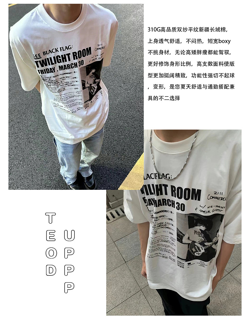 商品属性 [上市年份/季节] 2024年春季 [主面料成分] 棉 [主面料成分的含量] 96%及以上 [克重] 300 [印花主题] 人物图案 [厚薄] 普通 [原创设计货源] 否 [图案] 字母 [工艺] 数码印花 [库存类型] 整单 [是否库存] 是 [是否跨境出口专供货源] 否 [是否连帽] 不连帽 [有无质检报告] 否 [材质功能] 其他 [款式] 套头 [款式细节] 印花 [淘货类别] 青春流行(18-24岁) [版型] 宽松型 [类别] T恤背心 [袖型] 常规 [袖长] 短袖 [误差范围] 1 [货源类别] 现货 [适合人群] 青年 [适合季节] 夏季,春季 [适用场景] 休闲 [面料名称] 纯棉 [领型] 圆领 [风格] 青春流行