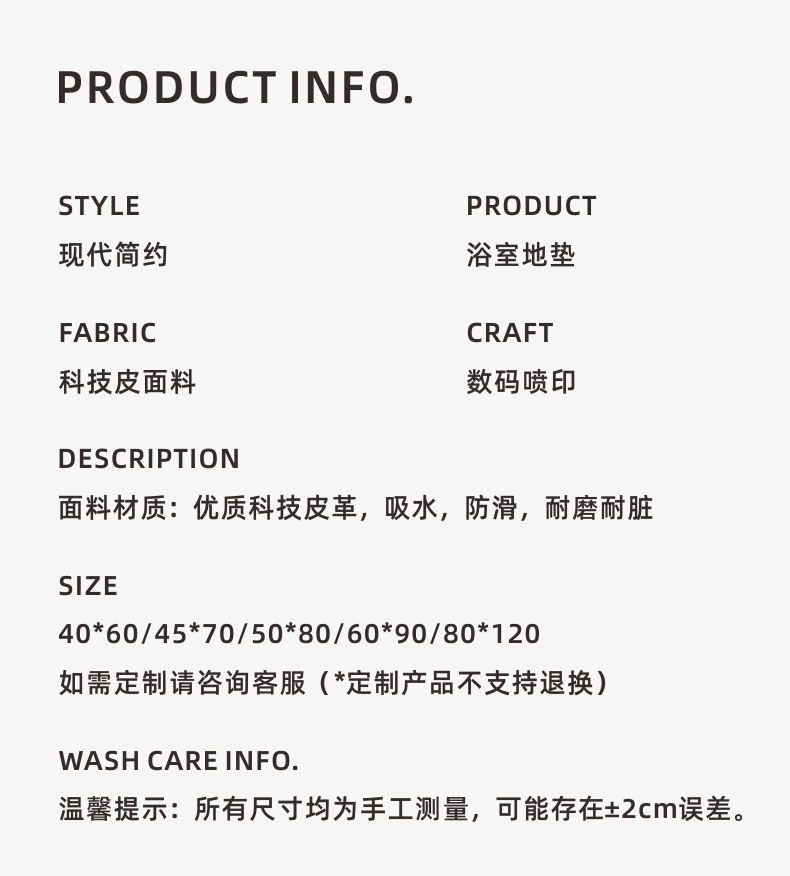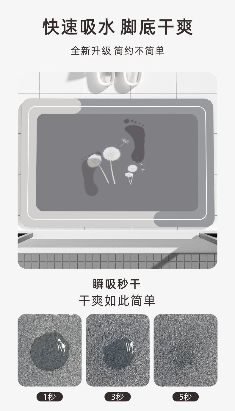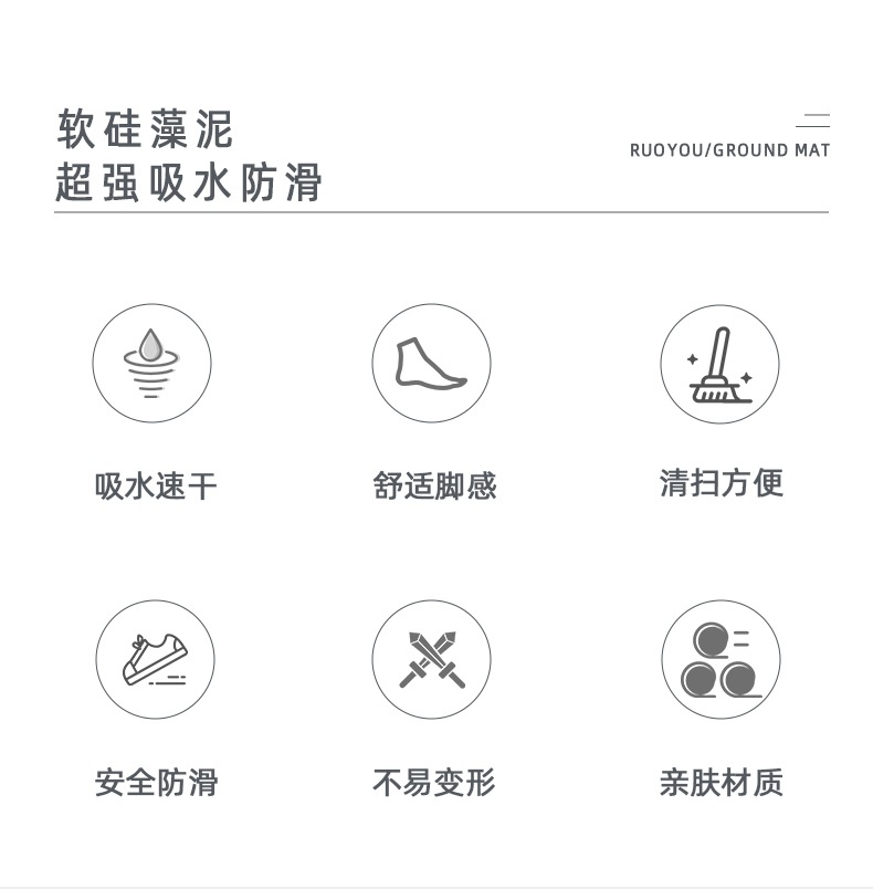 商品属性 [加工定制] 否 [图案] 纯色 [工艺] 印花,其他 [形状] 方形 [是否有版权或专利] 否 [材质] 硅藻泥 [清洗类型] 水洗 [空间] 客厅,厨房,浴室,阳台 [类型1] 防滑垫 [类型2] 吸水垫 [类型3] 浴室垫 [风格] 现代简约