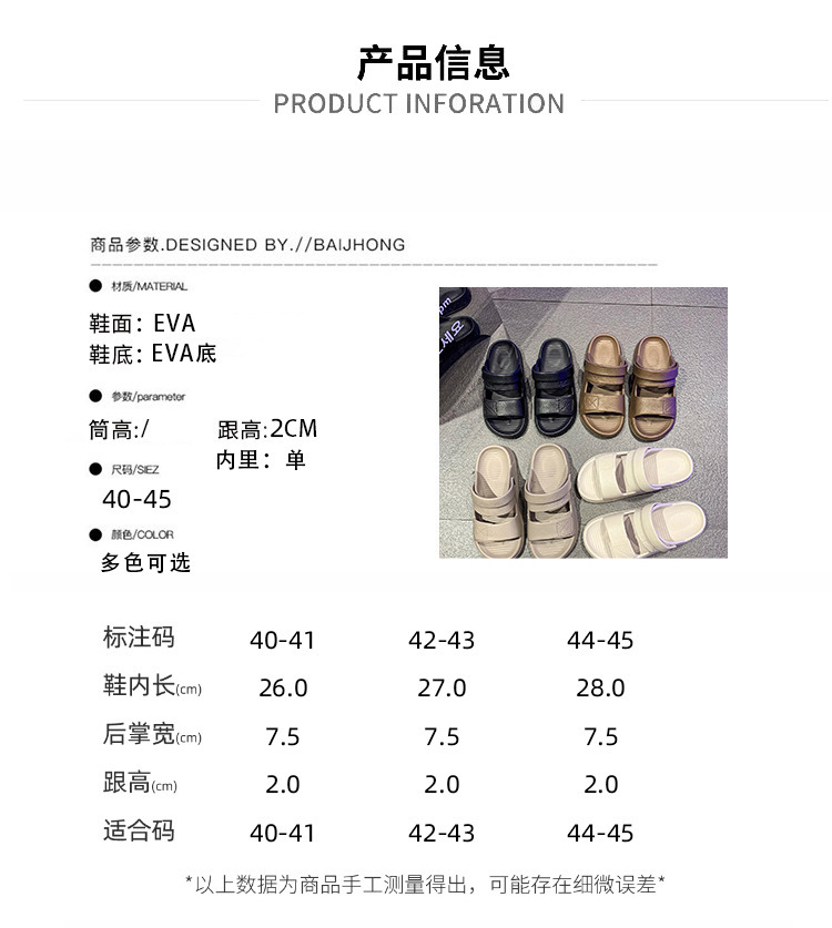 商品属性 [上市年份季节(上市时间)] 2024年夏季 [主要下游平台] ebay,亚马逊,wish,速卖通 [主要销售地区] 欧洲,南美,东南亚,北美,东北亚 [功能] 防滑 [厚薄] 普通厚 [外贸类型] 出口 [拖鞋种类] 套趾拖鞋 [是否包跟] 否 [是否外贸] 是 [是否带USB] 否 [是否库存] 否 [是否跨境出口专供货源] 是 [最快出货时间] 1 [最晚发货时间] 3天 [有可授权的自有品牌] 是 [款式] 一字拖 [流行元素] 镂空 [货源类别] 现货 [质检单位] sgs [质检报告] 否 [适用人群类型] 情侣 [适用性别] 男 [鞋底厚度] 1.5cm(含)-3.5cm(不含) [鞋底工艺] 注塑鞋 [鞋底材质] EVA [鞋面材质] EVA