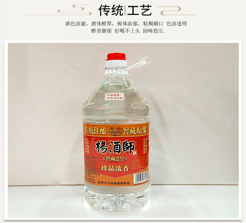 商品属性 [OEM] 否 [产品标准号] 见喷码 [产品认证] 否 [保质期] 长期 [储存条件] 常温 [储藏方法] 常温 [净重(规格)] 5L [制作工艺] 固态法 [包装方式] 桶装 [原产地] 贵州 [原料与配料] 水,糯高粱,小麦 [商品条形码] 6944032232548 [度数] 52度 [是否礼盒装] 否 [是否进口] 否 [热卖月份] 全年 [生产厂家] 贵州酱宗源酒业 [生产日期] 见喷码 [生产许可证编号] SC11552011510067