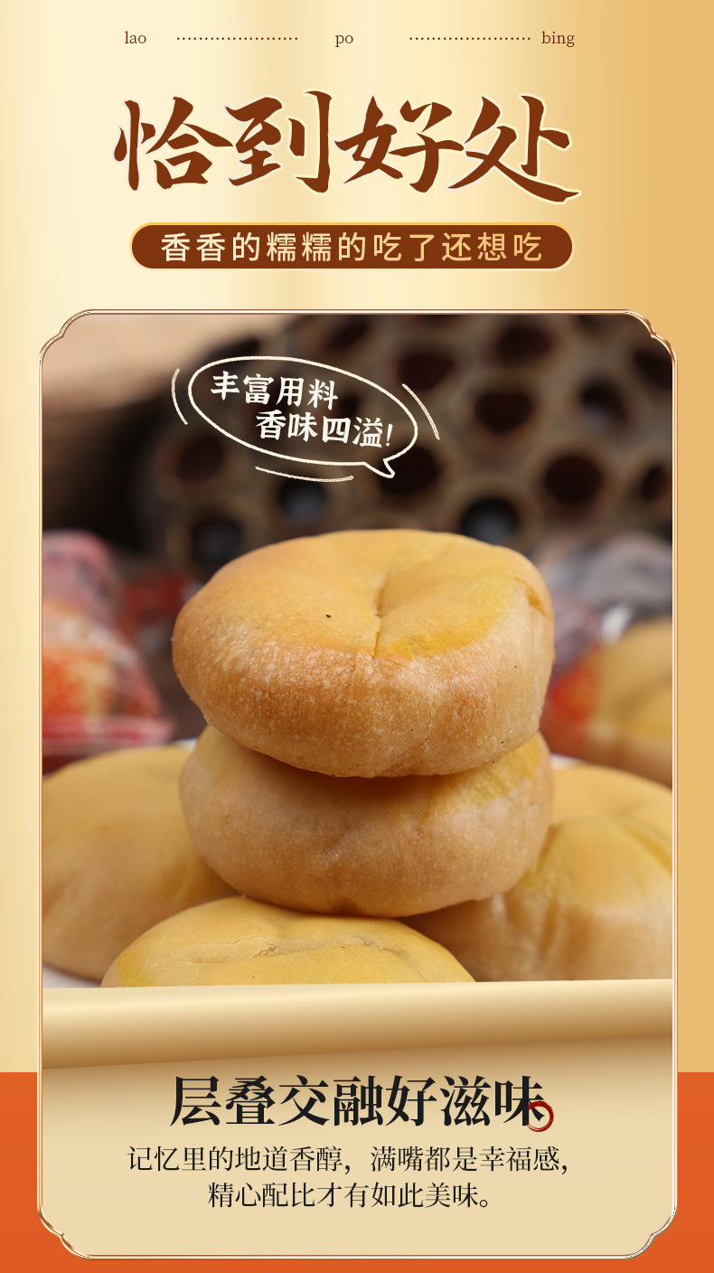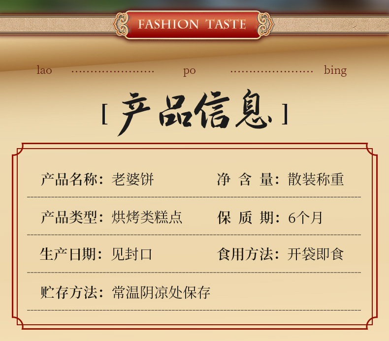 商品属性 [产品标准号] GB / T20977-2007 [产品类别] 老婆饼 [保质期] 6个月 [储存条件] 常温 [储藏方法] 干燥阴凉避光处 [净含量(规格)] 约32个/斤 [制作工艺] 传统糕点 [包装系列] 简装系列 [原产地] 湖南 [原料与配料] 糕粉 白砂糖 小麦粉等 [售卖方式] 批零兼营 [商品条形码] 见包装 [是否含糖] 含糖 [是否进口] 否 [热卖月份] 全年 [特殊功效] 无 [生产厂家] 见包装 [生产日期] 见包装 [生产许可证编号] SC12443018106201 [等级] 合格