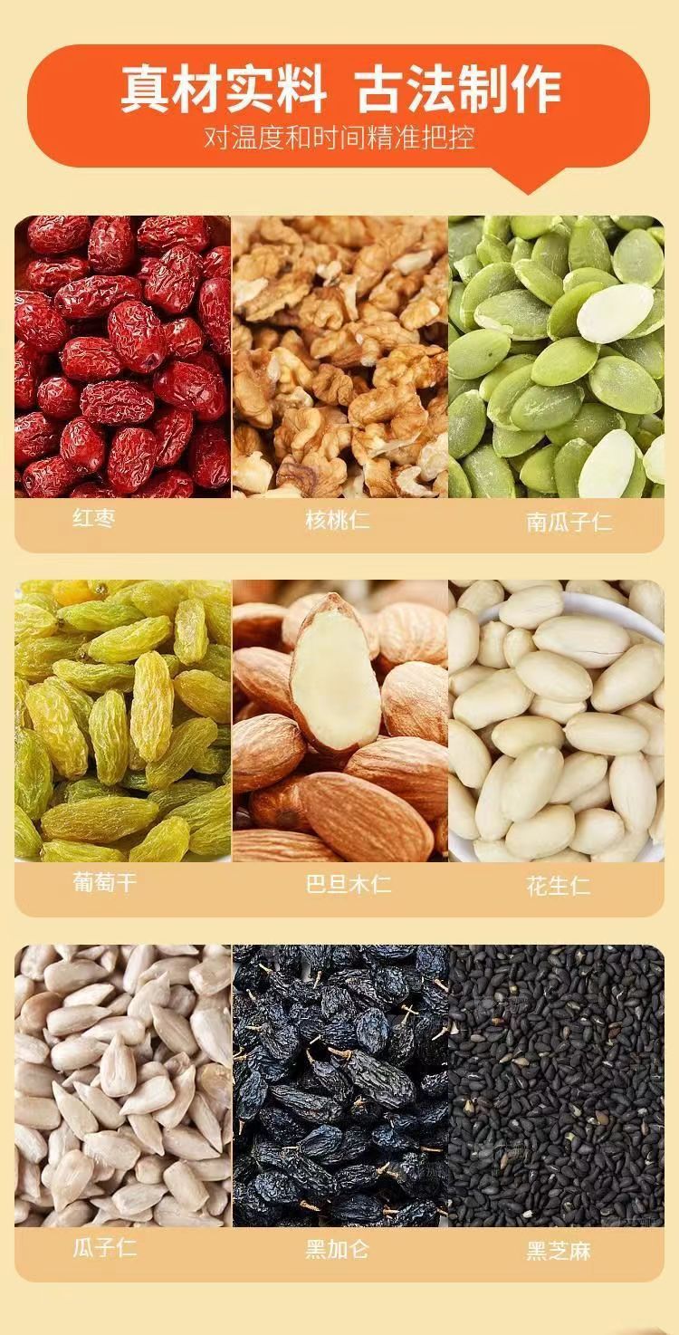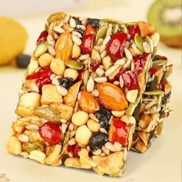 商品属性 [产品标准号] *** [产品类别] 八宝切糕 [产品认证] 否 [保质期] 6个月 [储存条件] 冷藏 [储藏方法] 阴凉干燥处 [净含量(规格)] 500 [制作工艺] ** [包装系列] 简装系列 [原产地] 河北沧州 [原料与配料] 核桃仁 南瓜籽巴旦木 花生仁 瓜子仁黑芝麻 麦芽糖 红枣 葡萄干 [售卖方式] 散装 [商品条形码] *** [是否含糖] 含糖 [是否进口] 否 [热卖月份] 全年 [生产厂家] 沧州恋菲泓食品有限公司 [生产日期] 见包装 [生产许可证编号] SC11713092100726 [等级] 一级