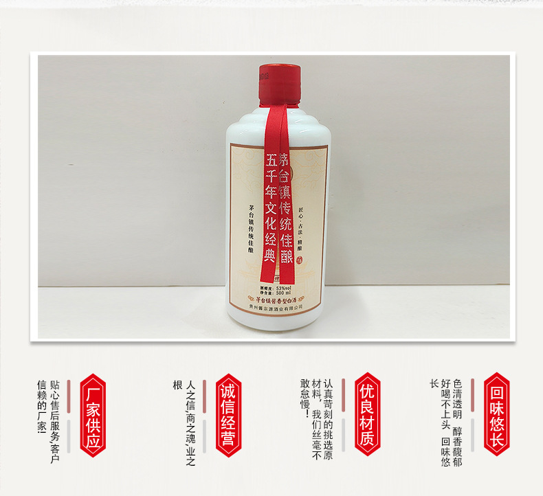 商品属性 [OEM] 否 [产品标准号] 见喷码 [产品认证] 否 [保质期] 长期 [储存条件] 常温 [储藏方法] 常温 [净重(规格)] 500ml [制作工艺] 固态法 [包装方式] 瓶装 [原产地] 贵州 [原料与配料] 水,高粱,小麦 [商品条形码] 6944032283625 [度数] 53° [是否礼盒装] 否 [是否进口] 否 [热卖月份] 全年 [生产厂家] 贵州酱宗源酒业 [生产日期] 见喷码 [生产许可证编号] SC11552011510067