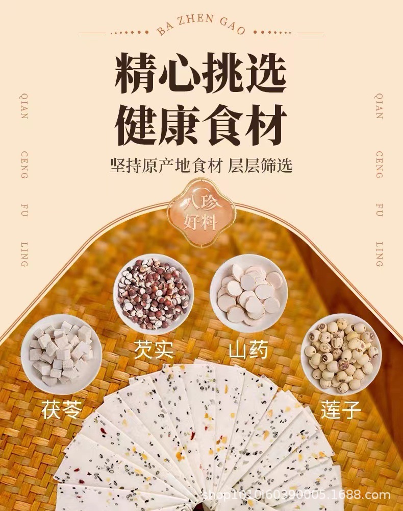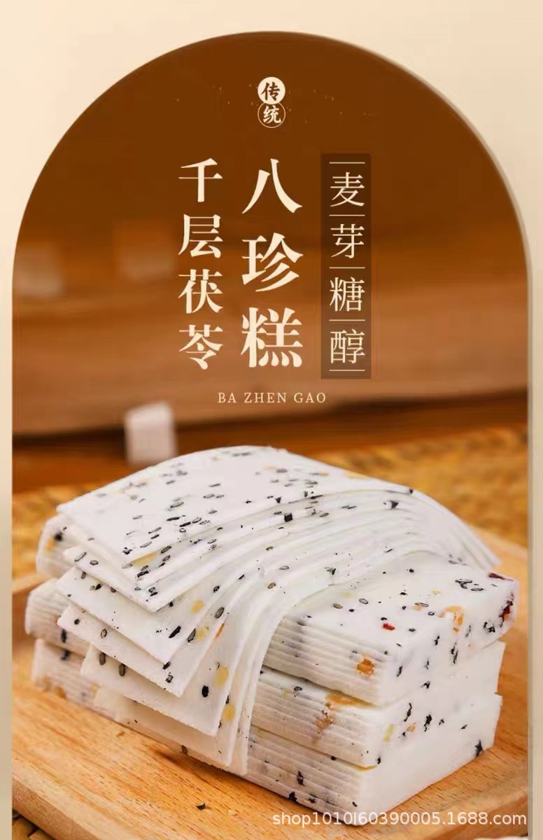商品属性 [产品标准号] GB/20977 [产品类别] 千层八珍糕 [保质期] 90 天 [储存条件] 常温 [储藏方法] 置于阴凉干燥处、避免阳光直射 [净含量(规格)] 32g [制作工艺] 熟粉类糕点 [包装系列] 简装系列 [原产地] 福建 [原料与配料] 大米粉、糯米粉、麦芽糖醇、八珍粉≥5%《获琴、荧实、山药、莲子、意米、山植、白扁豆、麦弟)芝麻≥3% [售卖方式] 批发/代发 [商品条形码] 无 [是否含糖] 不添加蔗糖 [是否进口] 否 [热卖月份] 全年 [特产品类] 芡实糕 [特殊功效] 营养 [生产厂家] 绘梦食品 [生产日期] 见包装(年/月/日) [生产许可证编号] SC11235068107153 [等级] 无