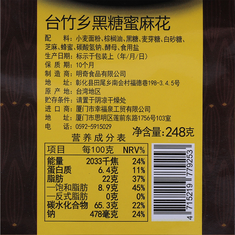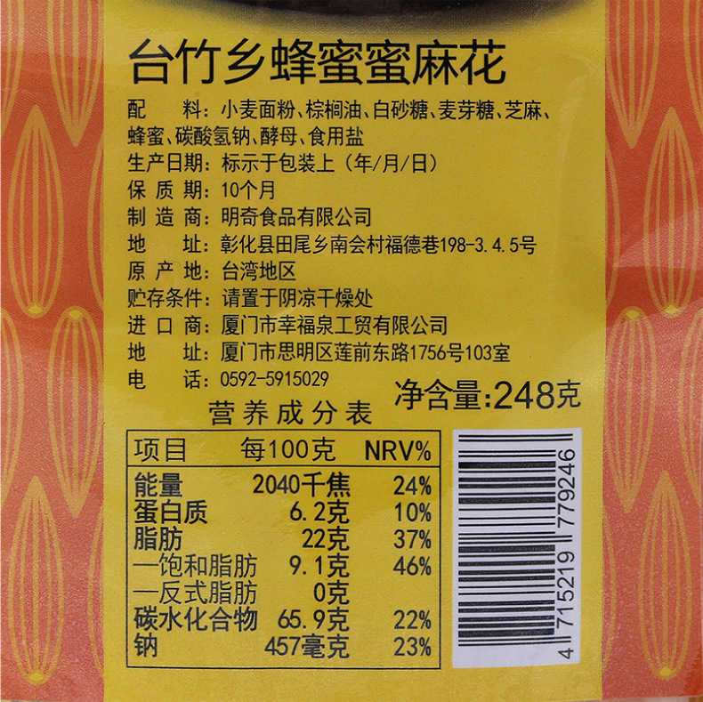 商品属性 [产品标准号] 符合海关进口标准 [产品类别] 麻花 [产品认证] 否 [保质期] 300 [储存条件] 常温 [储藏方法] 阴凉干燥 [净含量(规格)] 248g [制作工艺] 蜜麻花 [包装方式] 预包装 [包装系列] 简装系列 [原产国/地区] 台湾 [原料与配料] 见产品包装成分说明 [售卖方式] 包装 [商品条形码] 4715219779253 [是否含糖] 含糖 [是否进口] 是 [热卖月份] 全年 [特产品类] 其它 [特殊功效] 营养 [特殊提货凭证] 短信编码提货 [生产厂家] 明奇食品有限公司 [生产日期] 见产品内容页说明(实时更新) [等级] 合格
