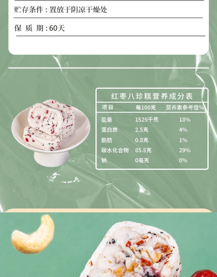 商品属性 [产品标准号] GB/T20977 [产品类别] 小米山药八珍糕 [保质期] 90 [储存条件] 常温 [储藏方法] 置于通风干燥阴凉处,避免阳光直射 [净含量(规格)] 250g [制作工艺] 其他 [包装方式] 简装系列 [包装系列] 简装系列 [原产地] 山东 [原料与配料] 其他 [售卖方式] 袋装 [商品条形码] 其他 [是否进口] 否 [热卖月份] 全年 [特产品类] 非特产 [生产厂家] 沂水常客食品有限公司 [生产日期] 见包装 [生产许可证编号] SC12437132306677 [等级] 其他
