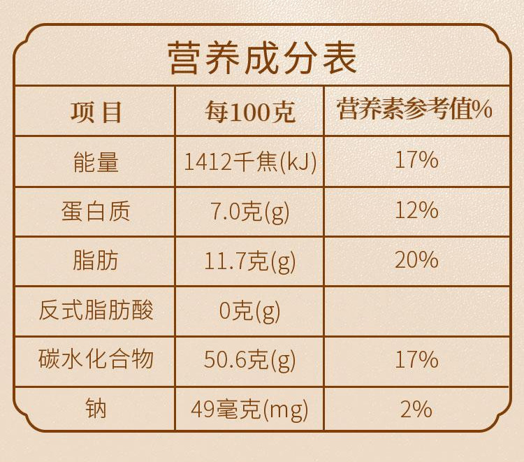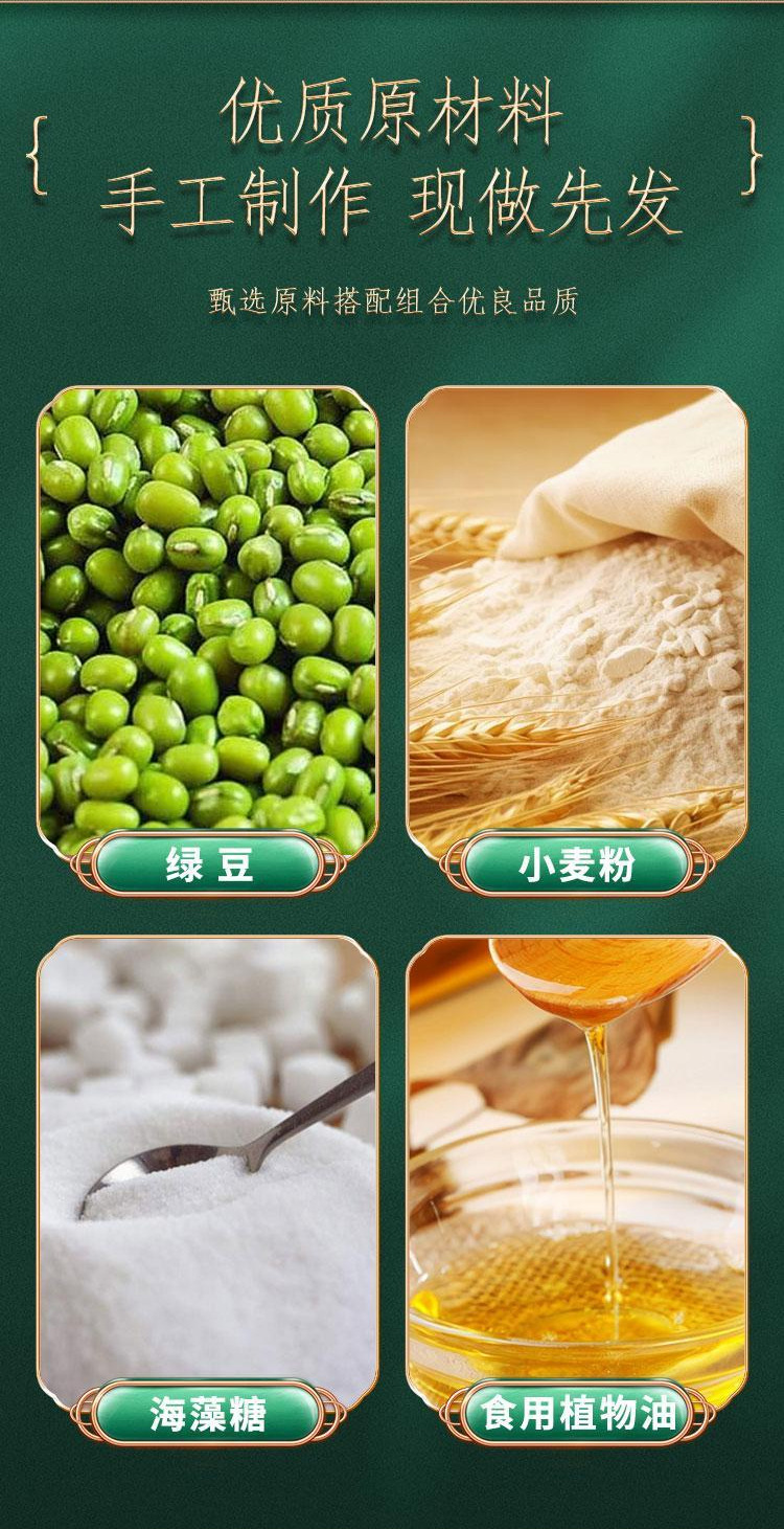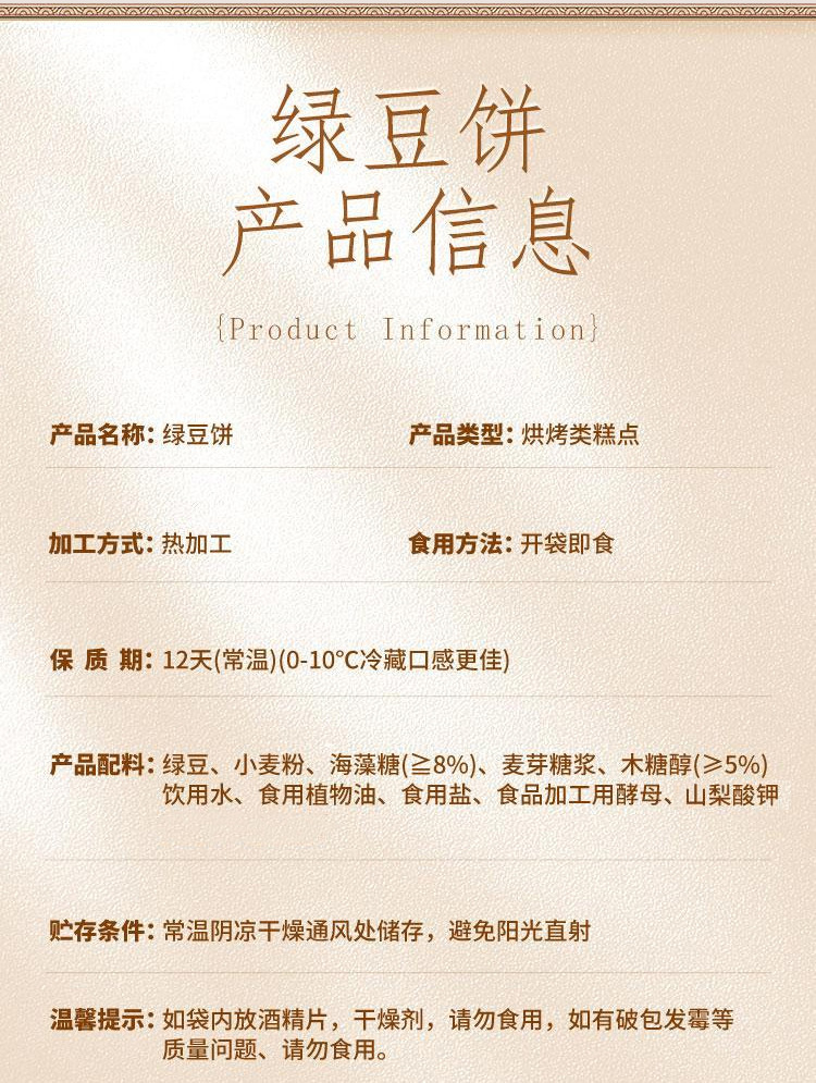 商品属性 [产品标准号] 见包装 [产品类别] 绿豆糕 [产品认证] 否 [保质期] 12天 [储存条件] 常温 [储藏方法] 见包装 [净含量(规格)] 100 [制作工艺] 见包装 [包装方式] 散装 [包装系列] 简装系列 [原产地] 河南 [原料与配料] 见包装 [售卖方式] 见包装 [商品条形码] 见包装 [是否含糖] 不添加蔗糖 [是否进口] 否 [热卖月份] 全年 [特产品类] 泉州绿豆饼 [特殊功效] 营养 [特殊提货凭证] 提货券 [生产厂家] 见包装 [生产日期] 见包装 [生产许可证编号] SC12435030400482 [等级] 见包装