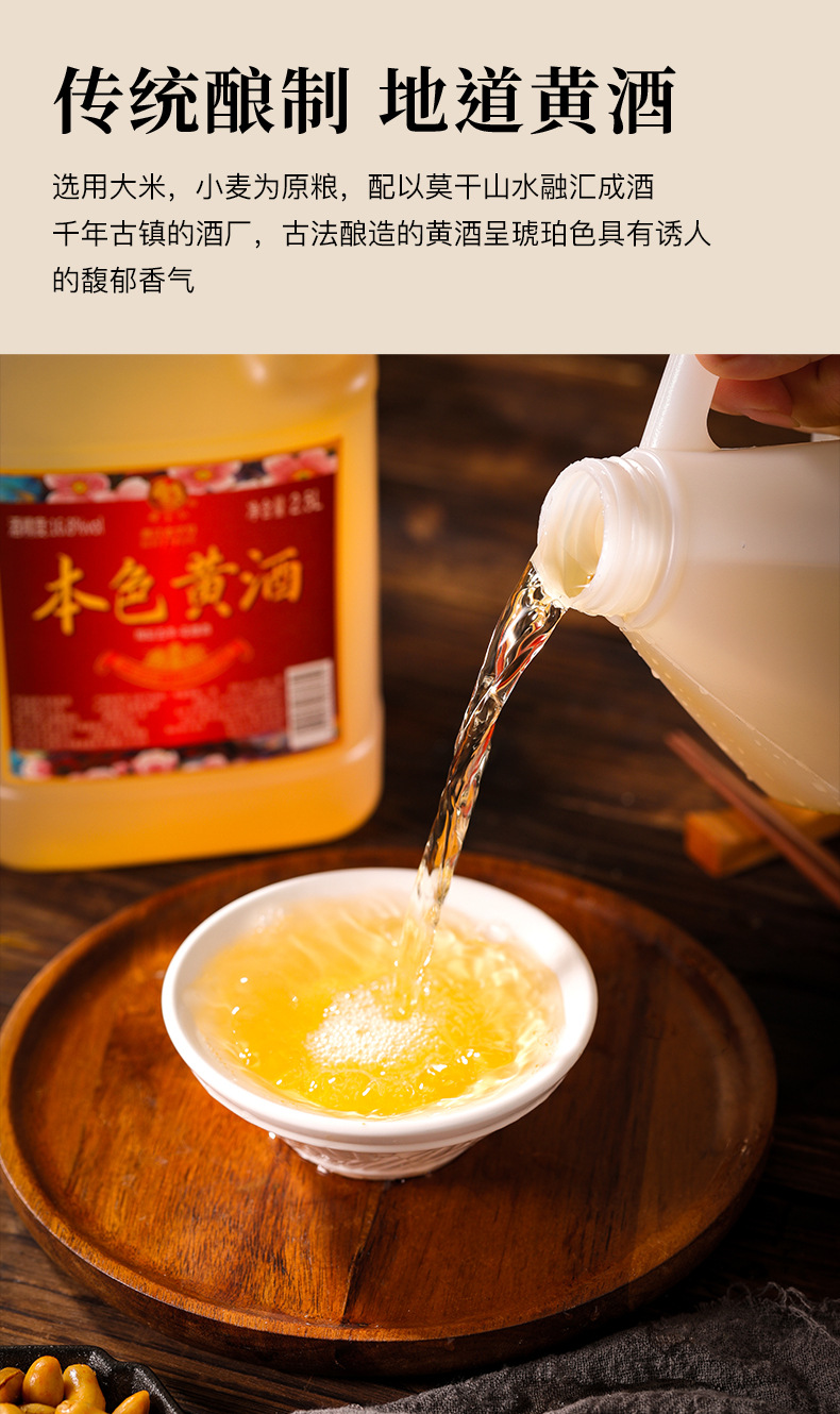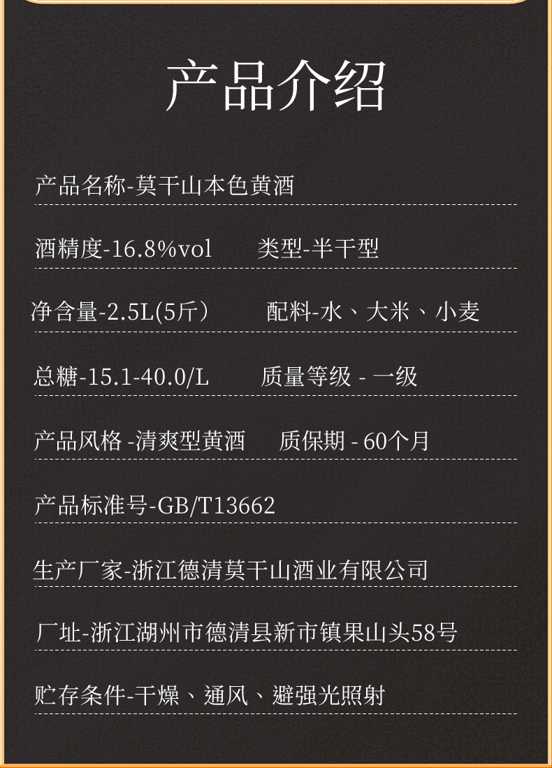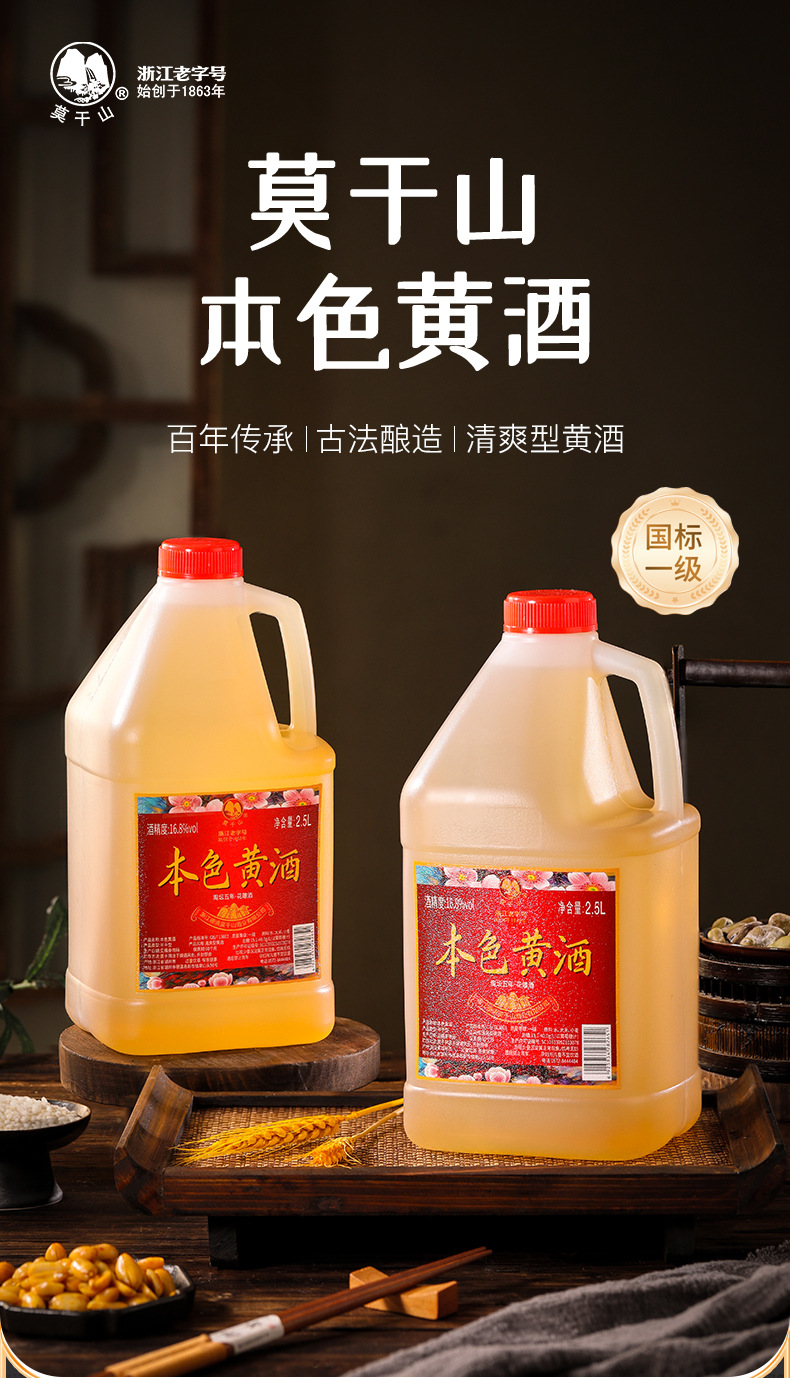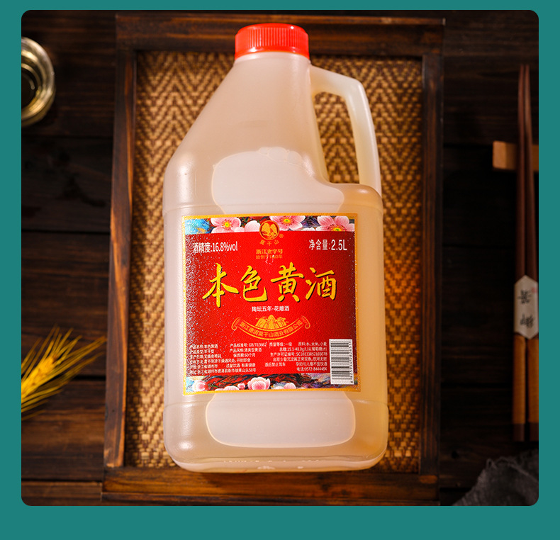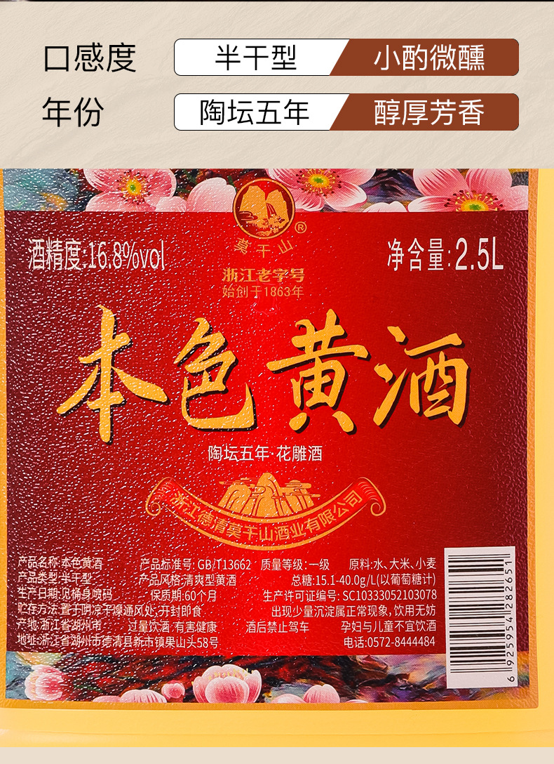 商品属性 [产品标准号] GBT13662 [产品类别] 花雕酒 [产品认证] 否 [保质期] 3年 [储存条件] 常温 [储藏方法] 阴凉干燥 [净重(规格)] 2.5L [制作工艺] 发酵酒 [包装方式] 桶装 [原产地] 浙江 [原料与配料] 大米黄酒 [商品条形码] 6925954282651 [是否礼盒装] 否 [是否进口] 否 [热卖月份] 全年 [特产] 是 [生产厂家] 浙江德清莫干山酒业有限公司 [生产日期] 2025年 [生产许可证编号] SC10333052103078