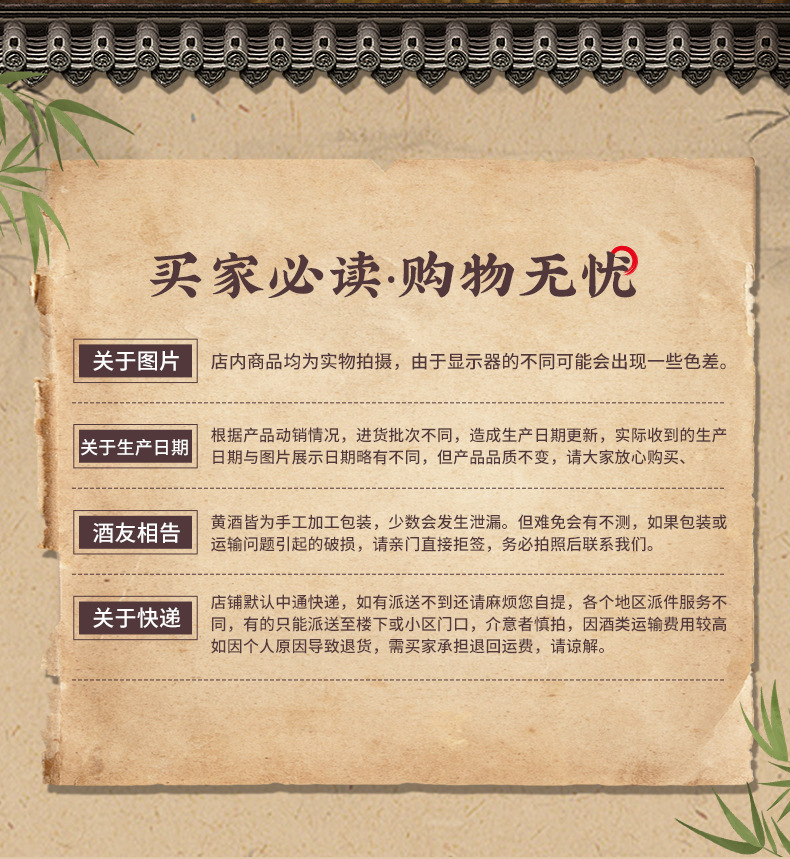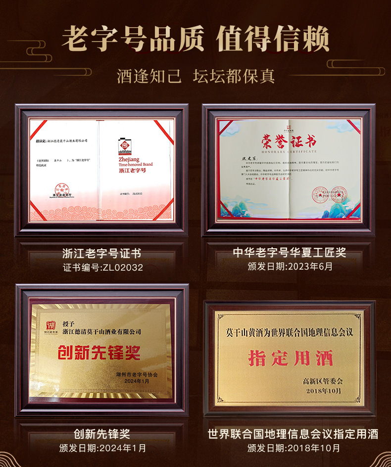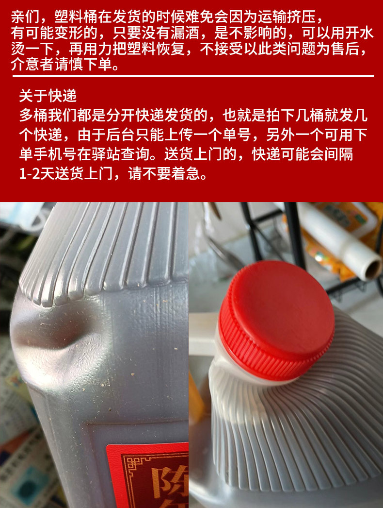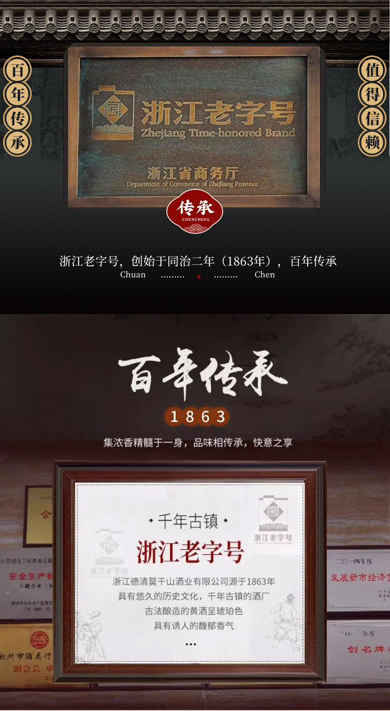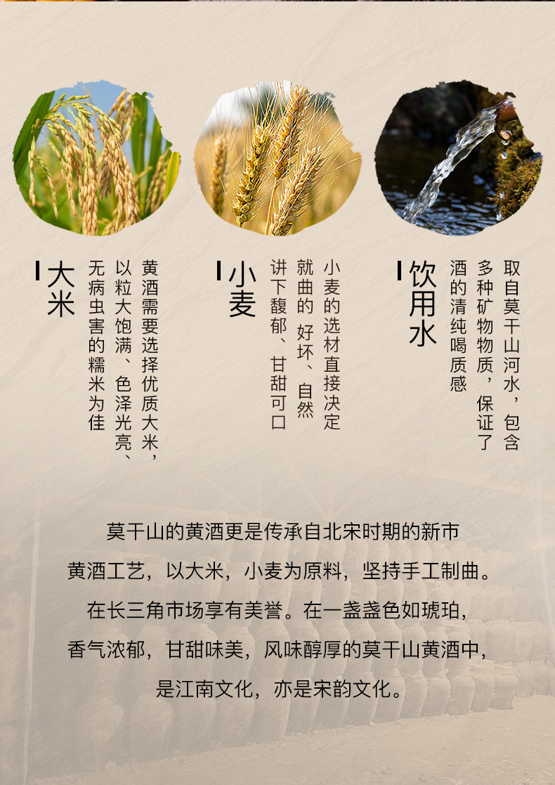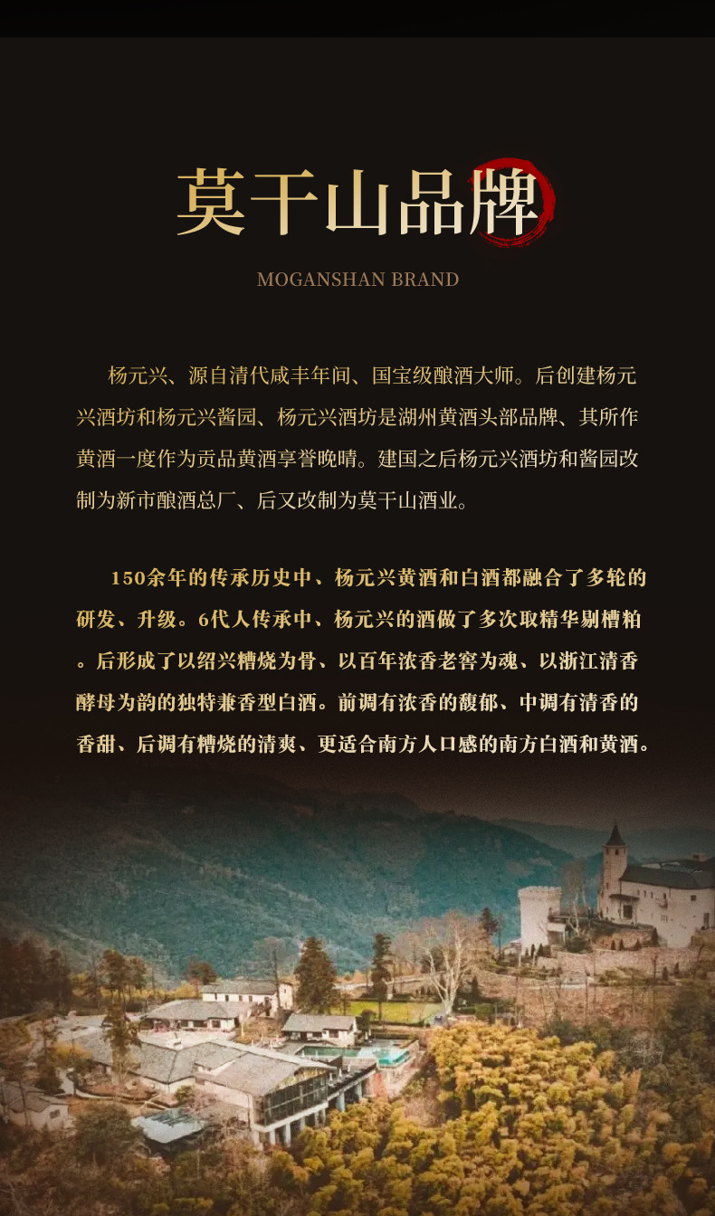 商品属性 [产品标准号] GBT13662 [产品类别] 花雕酒 [产品认证] 否 [保质期] 3年 [储存条件] 常温 [储藏方法] 阴凉干燥 [净重(规格)] 2.5L [制作工艺] 发酵酒 [包装方式] 桶装 [原产地] 浙江 [原料与配料] 大米黄酒 [商品条形码] 6925954282651 [是否礼盒装] 否 [是否进口] 否 [热卖月份] 全年 [特产] 是 [生产厂家] 浙江德清莫干山酒业有限公司 [生产日期] 2025年 [生产许可证编号] SC10333052103078