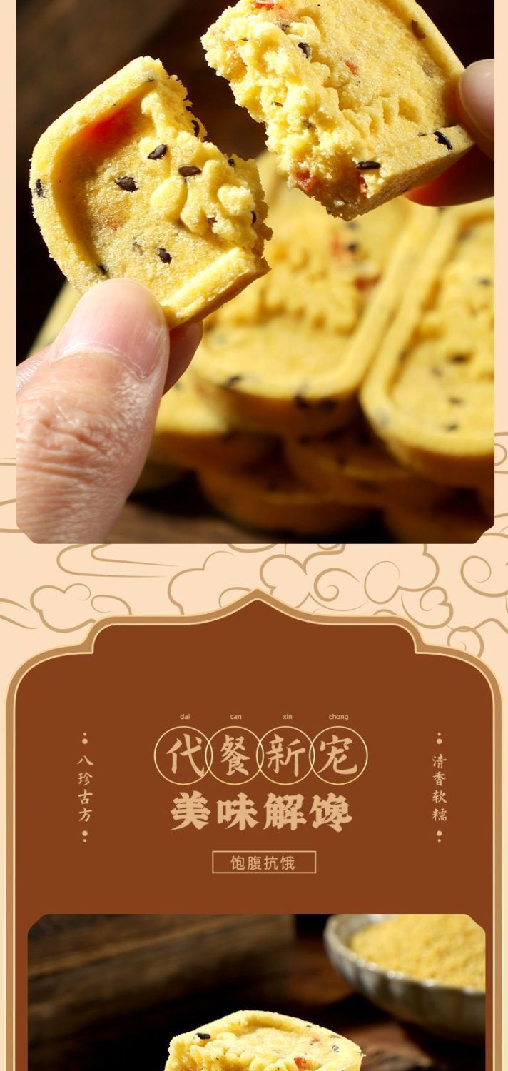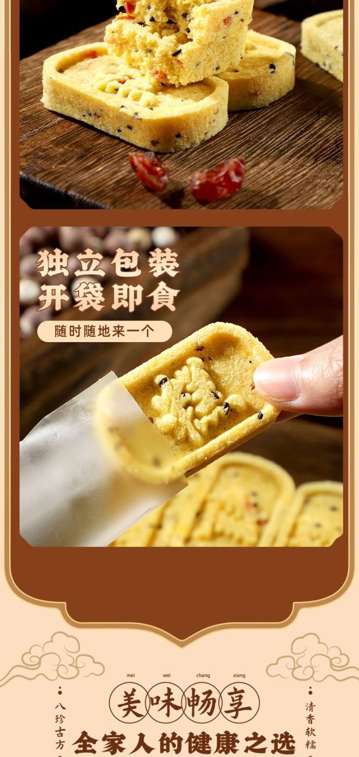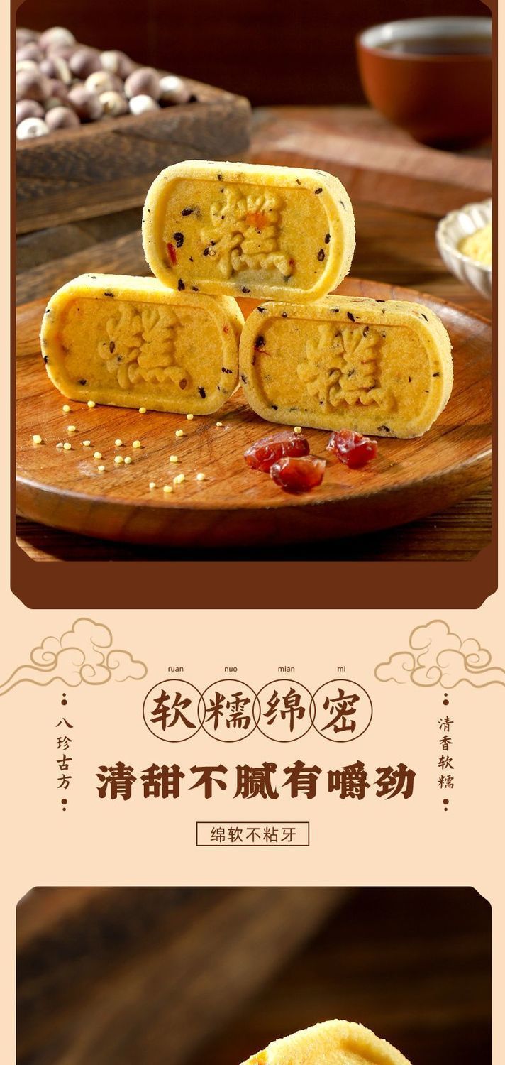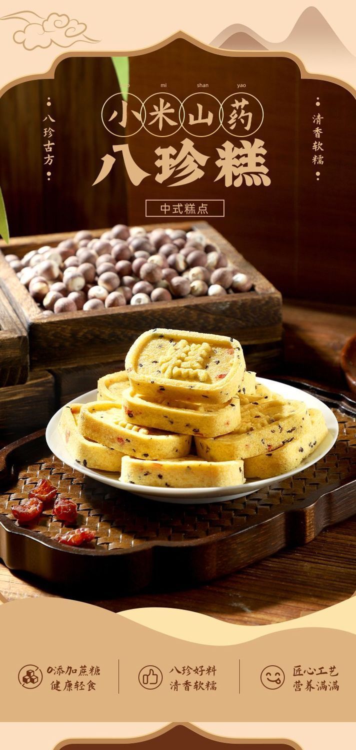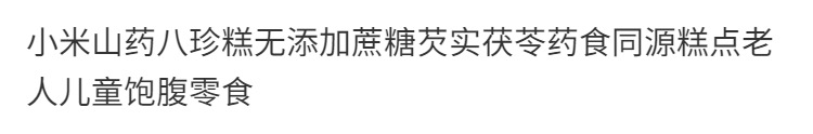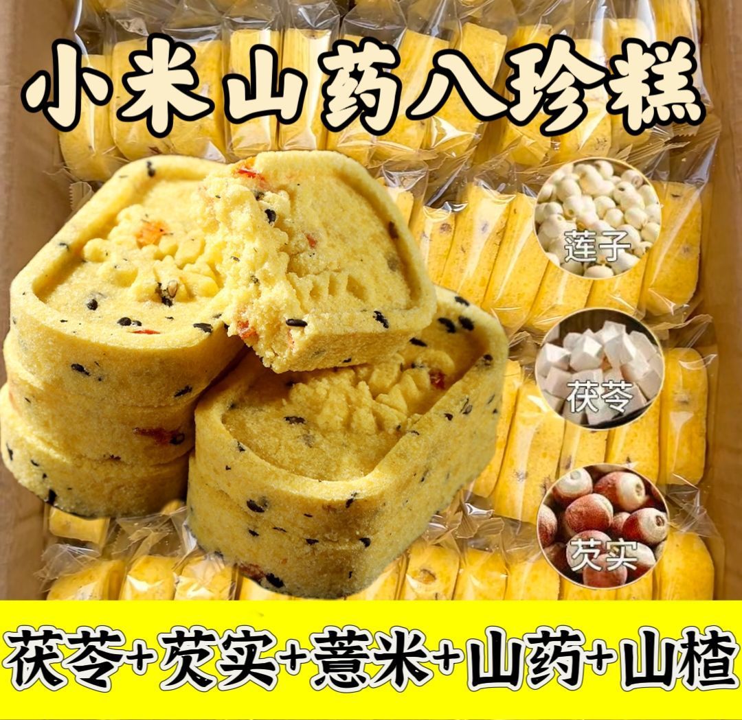 商品属性 [产品标准号] GB/T 20977 [产品类别] 小米山药八珍糕 [产品认证] 否 [保质期] 90天 [储存条件] 常温 [储藏方法] 阴凉处密封 [净含量(规格)] 12.5g [制作工艺] 热加工 [包装方式] 简装系列 [包装系列] 简装系列 [原产地] 福建 [原料与配料] 小米、茯苓、桂花等、详见包装 [售卖方式] 散装 [商品条形码] // [是否含糖] 不添加蔗糖 [是否进口] 否 [热卖月份] 全年 [特产品类] 非特产 [特殊功效] 含膳食纤维 [生产厂家] // [生产日期] 不断更新 [生产许可证编号] sc10635068110187 [等级] //