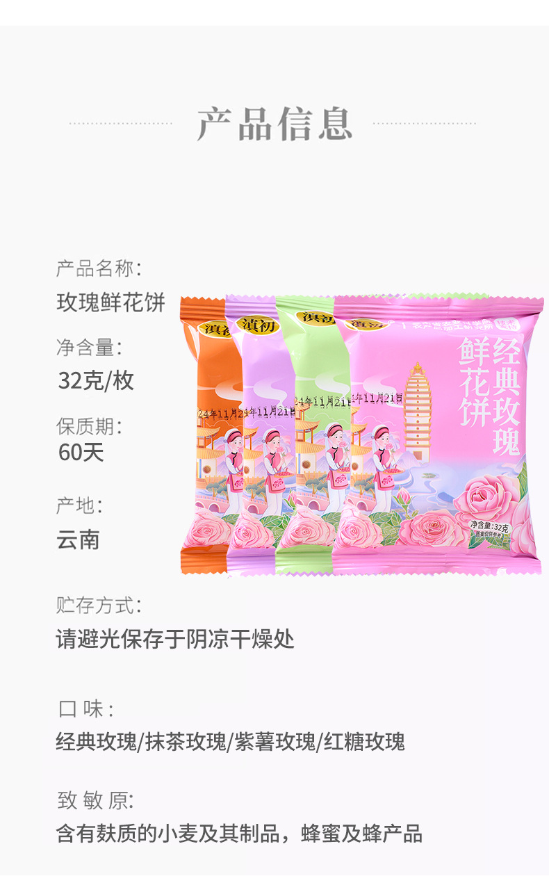 商品属性 [产品标准号] 见包装 [产品类别] 鲜花饼 [产品认证] 否 [保质期] 60 [储存条件] 常温 [储藏方法] 常温 [净含量(规格)] 32g/枚 [制作工艺] 烘烤 [包装方式] 预包装 [包装系列] 组合系列 [原产地] 云南 [原料与配料] 见包装 [售卖方式] 组合 [商品条形码] 见包装 [是否含糖] 含糖 [是否进口] 否 [热卖月份] 全年 [特产品类] 鲜花饼 [特殊功效] 无 [生产厂家] 滇初优选食品(云南)有限公司 [生产日期] 近期生产 [生产许可证编号] SC12453010106619 [等级] 合格