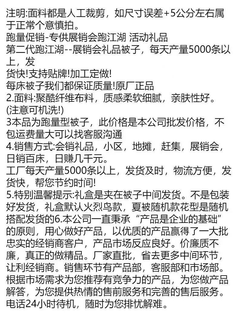 商品属性 [印染工艺] 活性印染 [填充物] 聚酯纤维 [是否一般纳税人] 否 [织造工艺] 印花 [被子重量] 1斤(不含)-1.5斤(含) [面料材质] 化纤 [风格] 现代简约