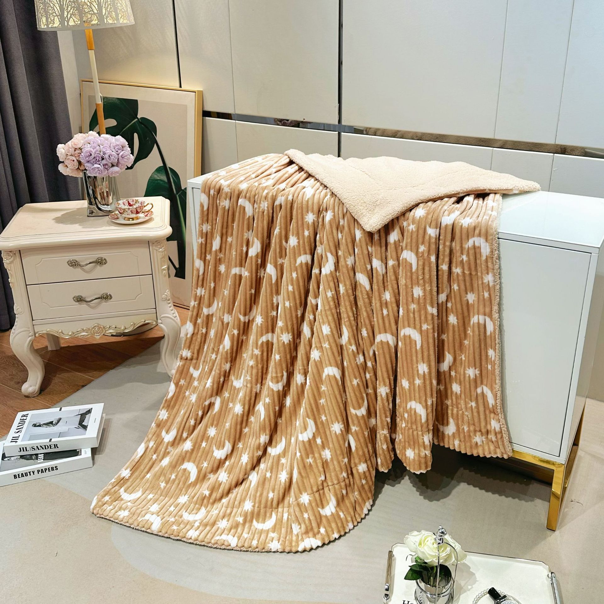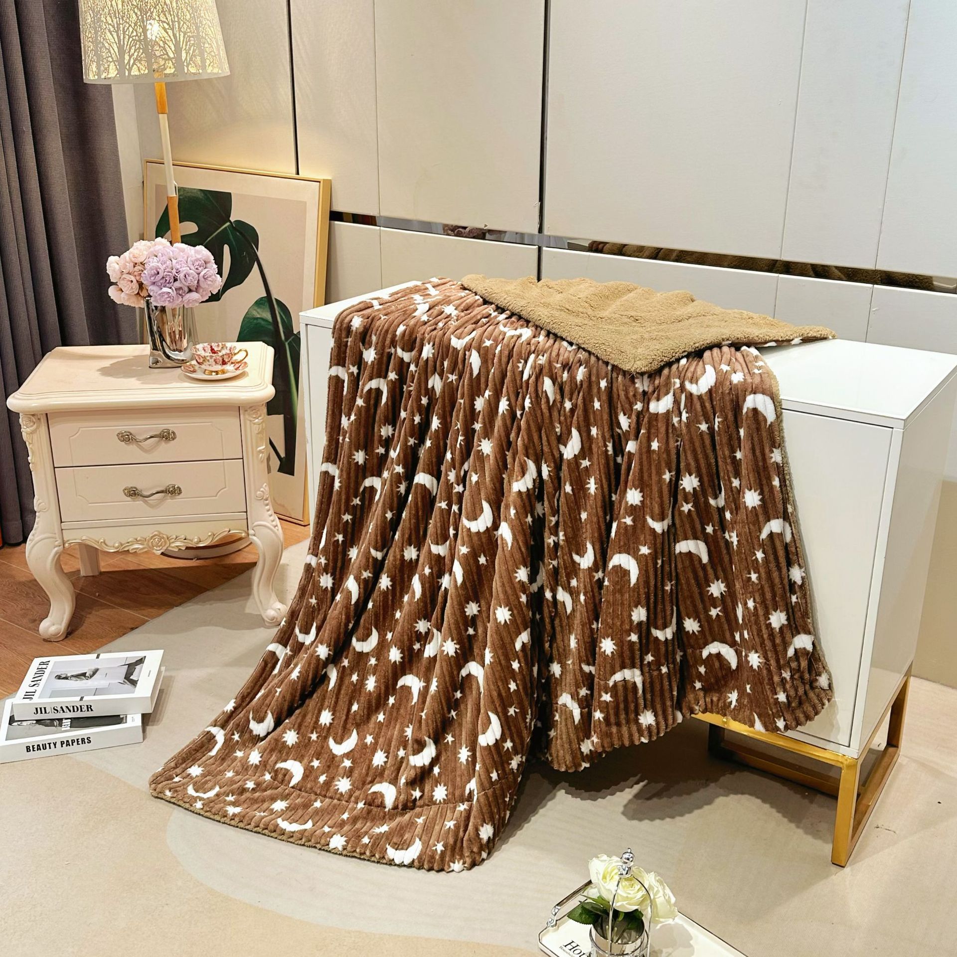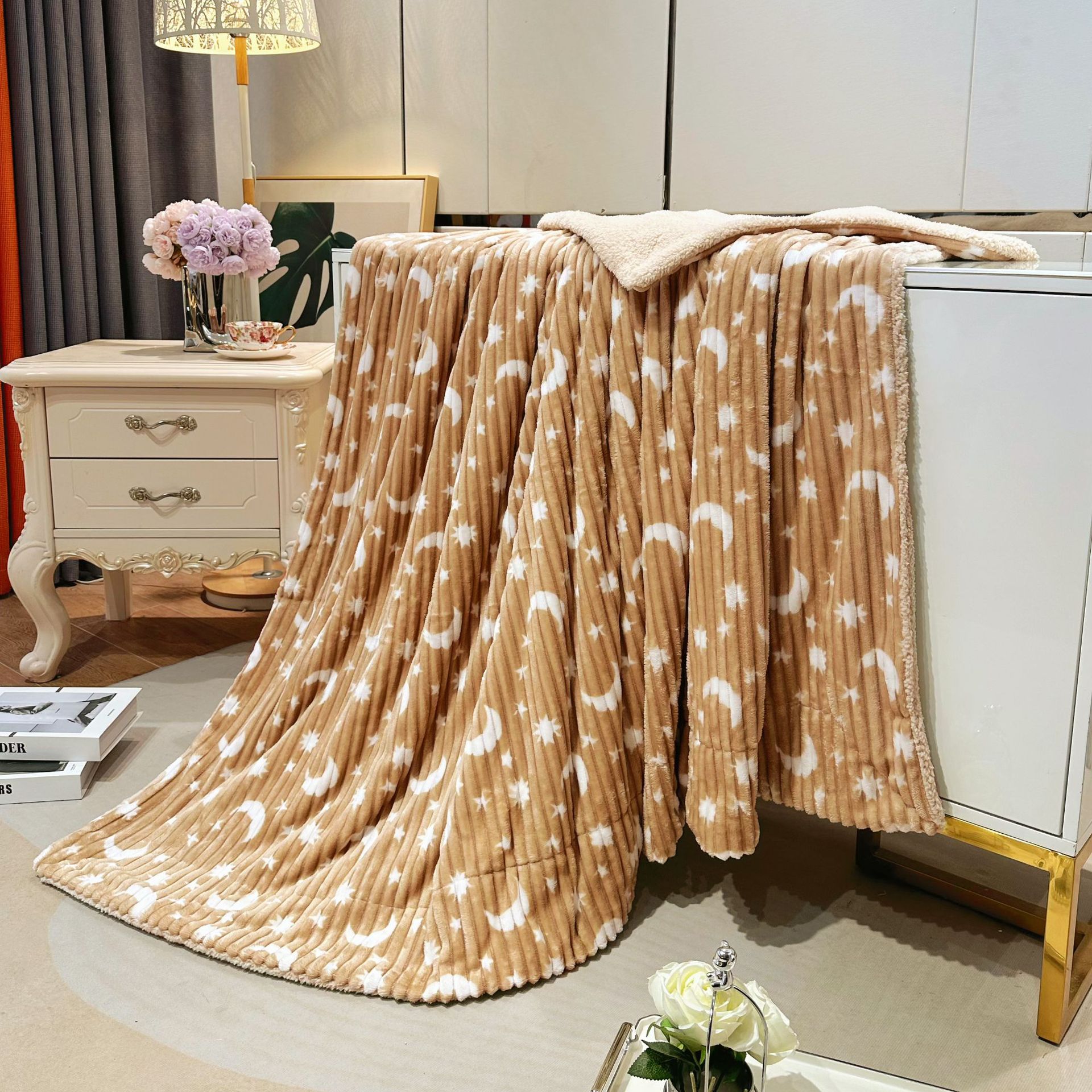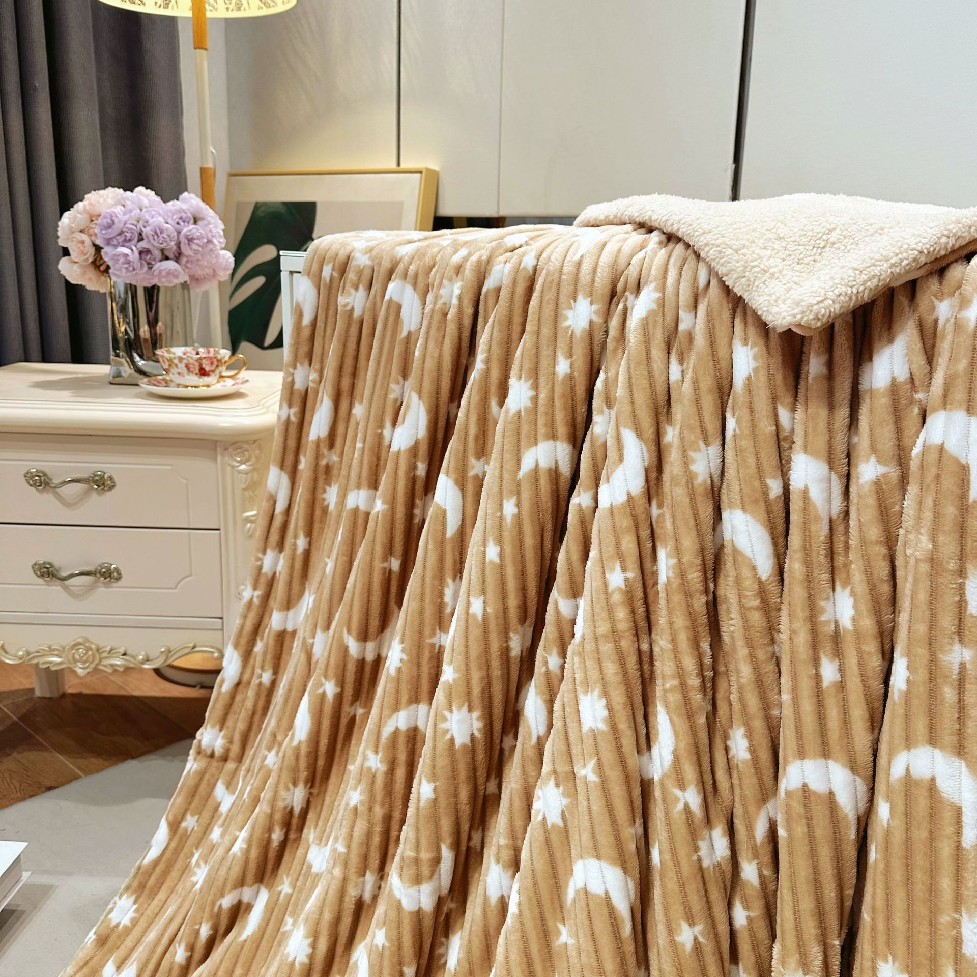 商品属性 [克重] 300g(不含)以下 [加工定制] 是 [图案] 星空,几何图案,其他 [是否一般纳税人] 否 [材质] 聚酯纤维(涤纶) [毯类型] 法兰绒 [适用季节] 四季通用 [风格] 现代简约