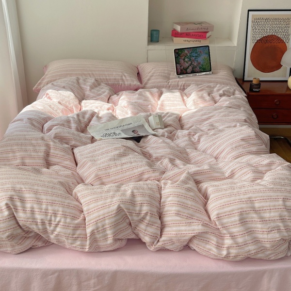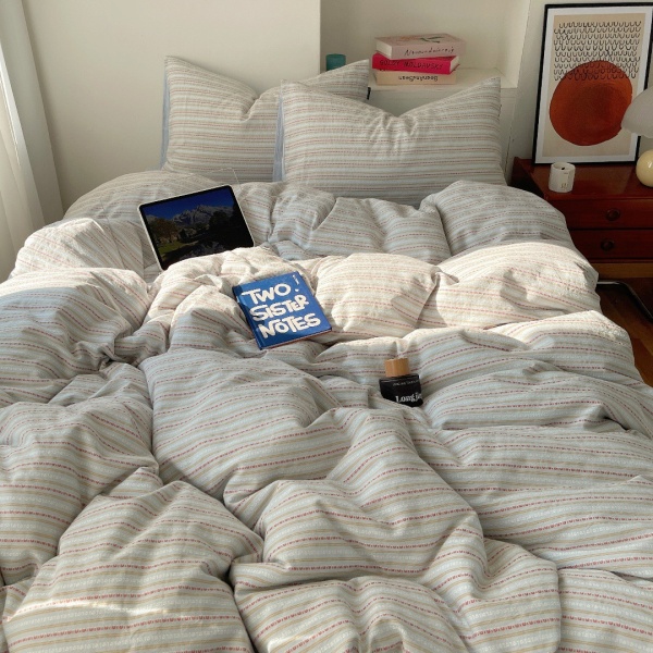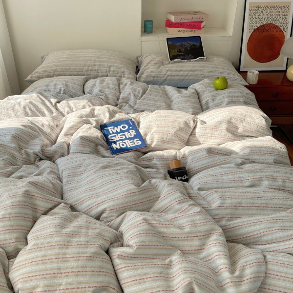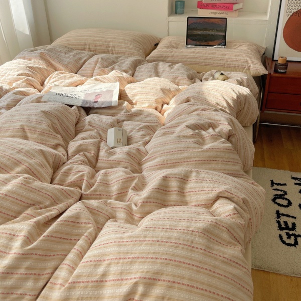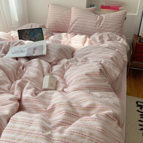 素色条纹全棉四件套色织提花水洗纯棉被套床单宿舍三件套床上用品