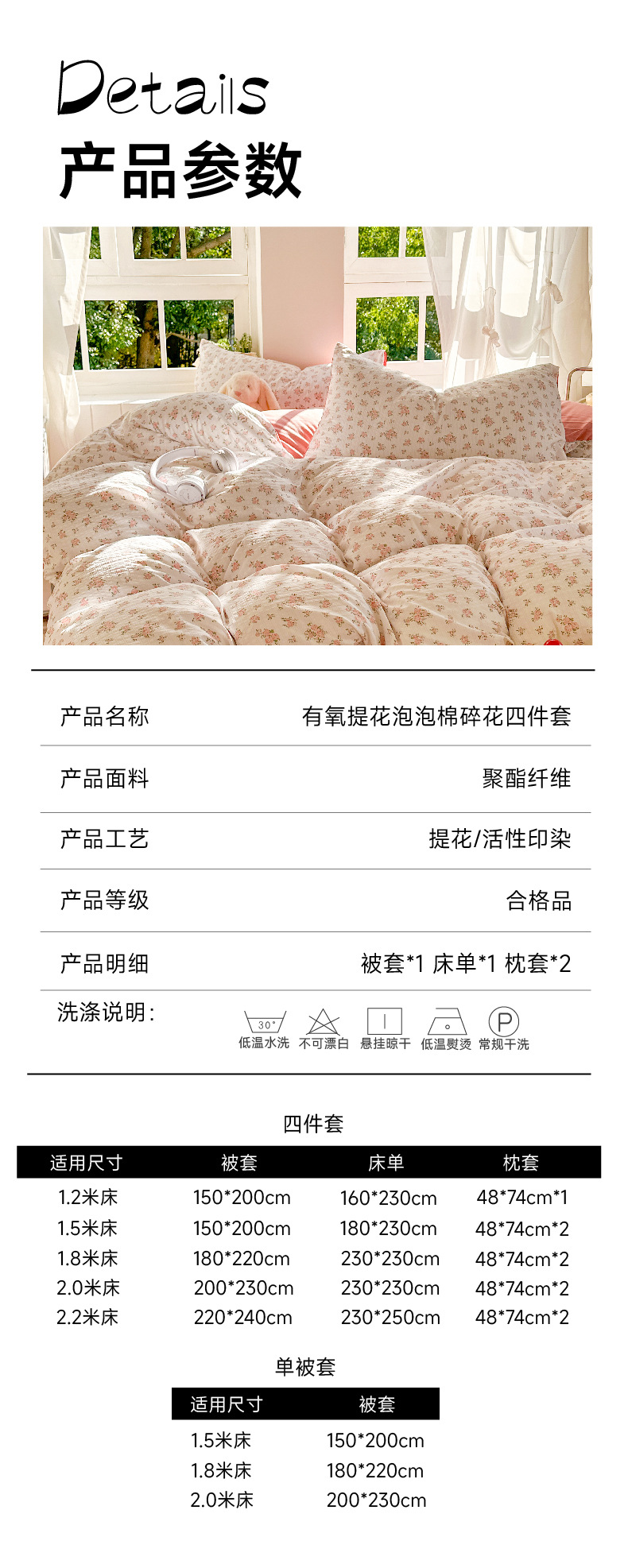 商品属性 [克重] 1000g(含)~1500g(不含) [加工定制] 是 [印染工艺] 活性印染 [图案] 卡通动漫,植物花卉,萌趣动物,其他 [是否一般纳税人] 是 [材质] 泡泡棉 [材质说明] 聚酯纤维 [款式] 床单式 [织造工艺] 水洗,印花,提花,其他 [风格] 小清新