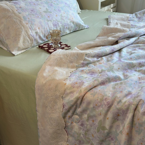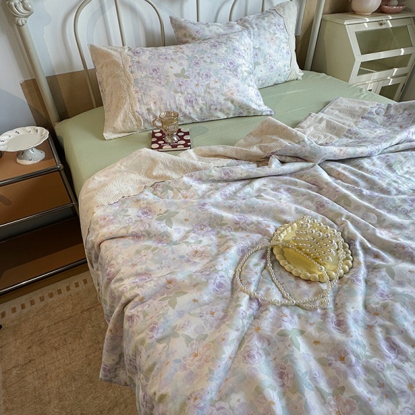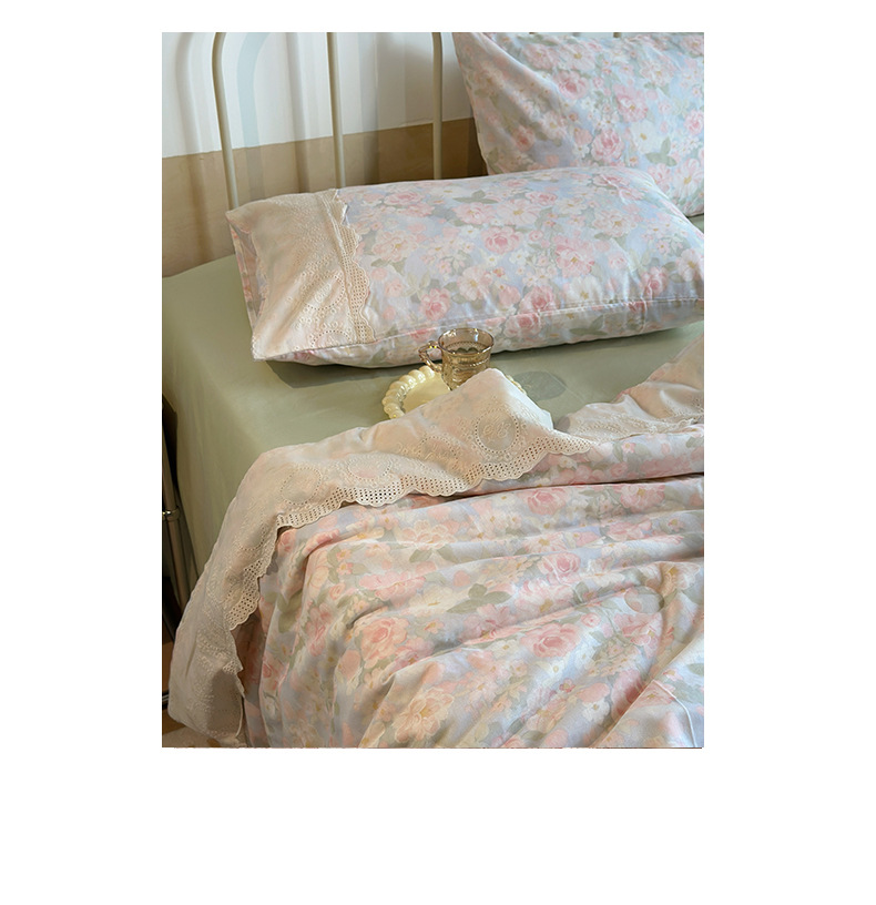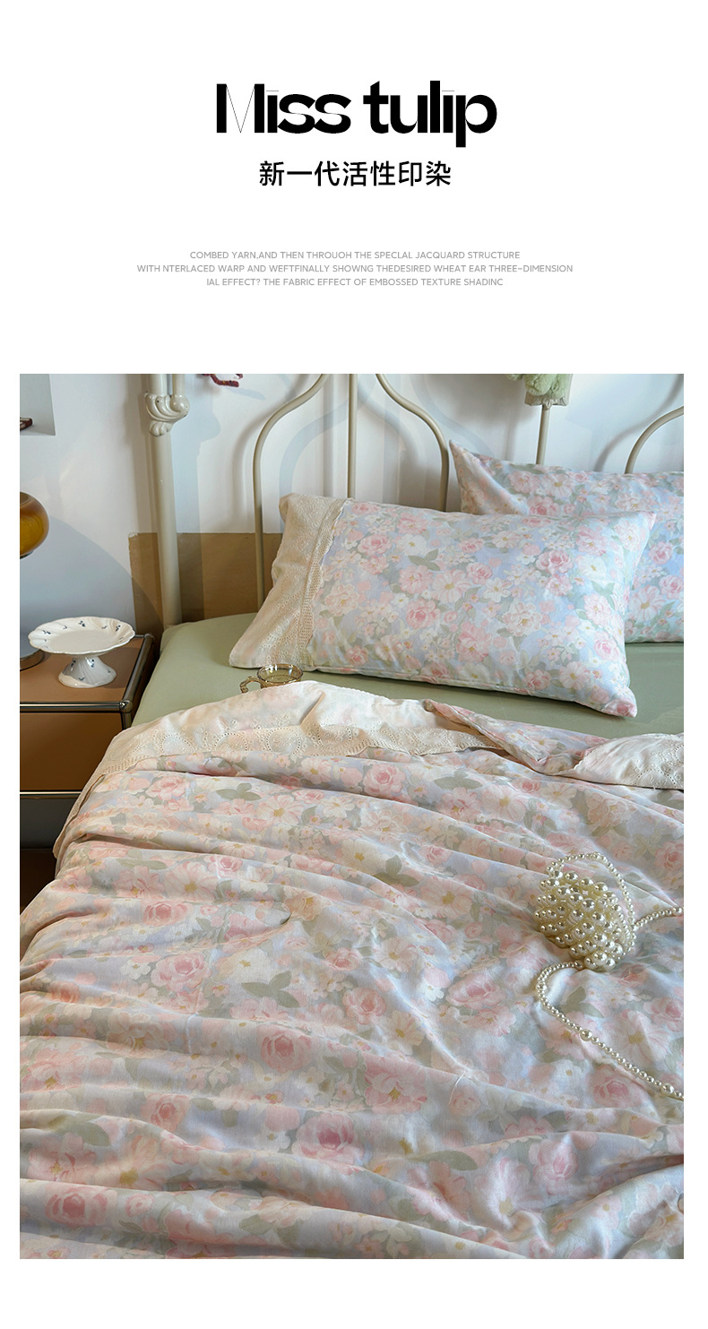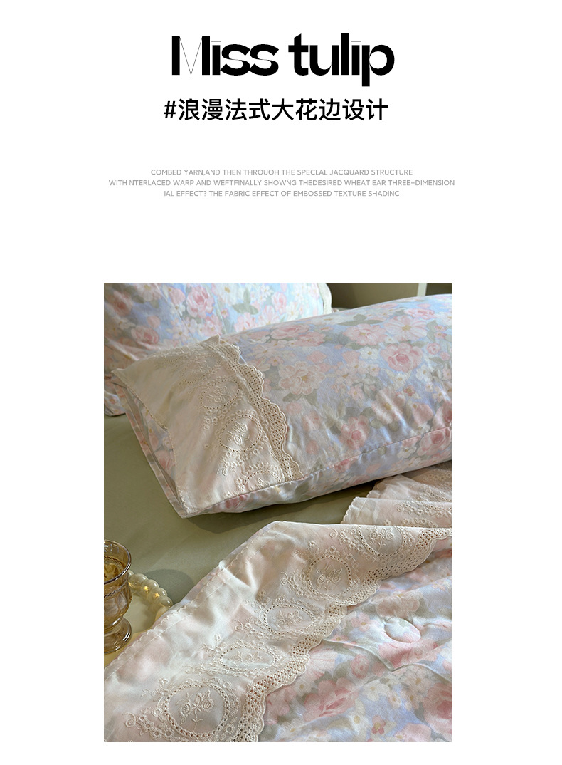 商品属性 [克重] 800g(含)~1000g(不含) [加工定制] 否 [印染工艺] 活性印染 [图案] 植物花卉 [是否一般纳税人] 否 [材质] 纯棉 [款式] 床单式 [织造工艺] 花边 [面料支数] 其他 [风格] 法式