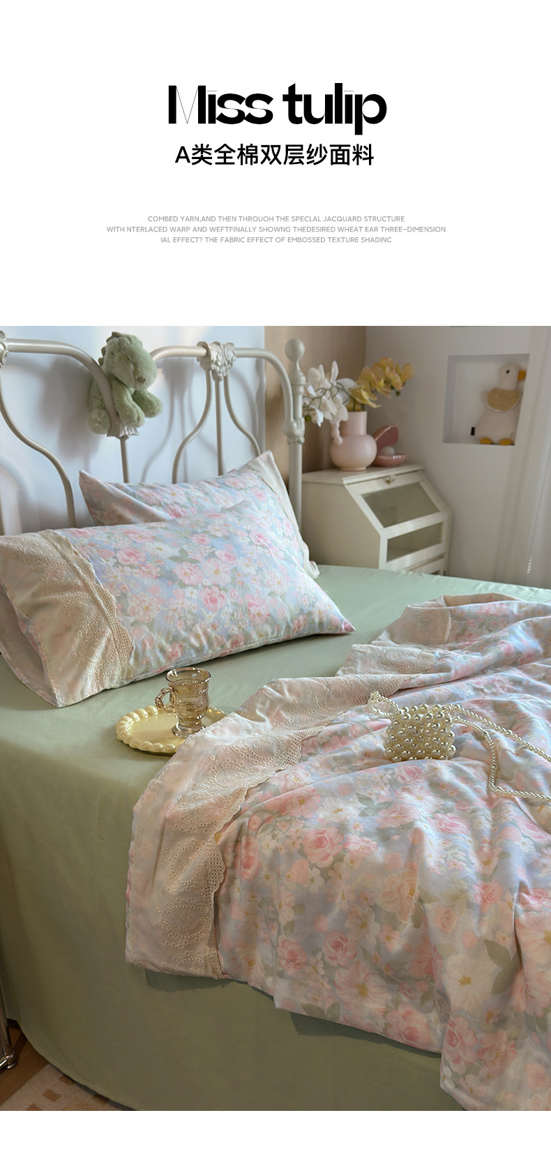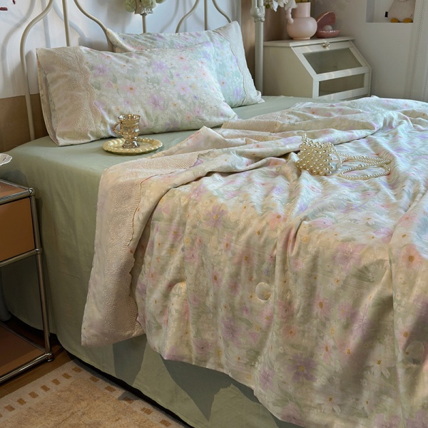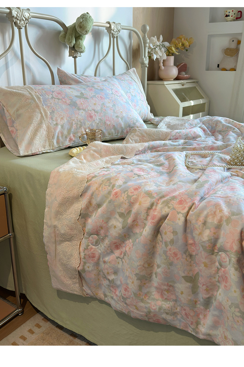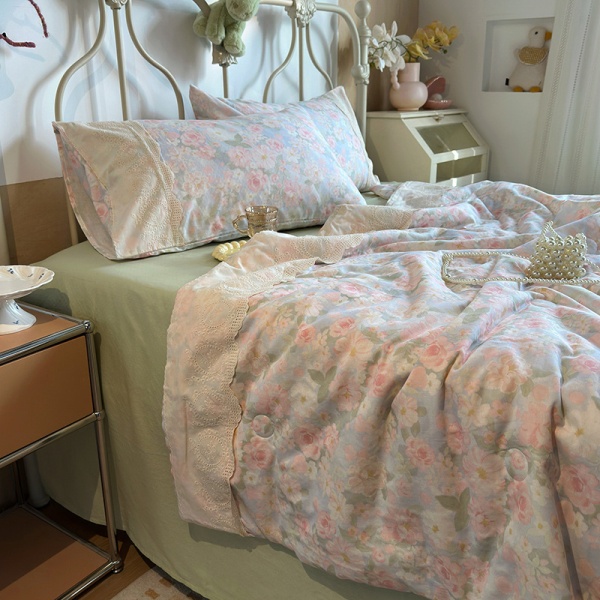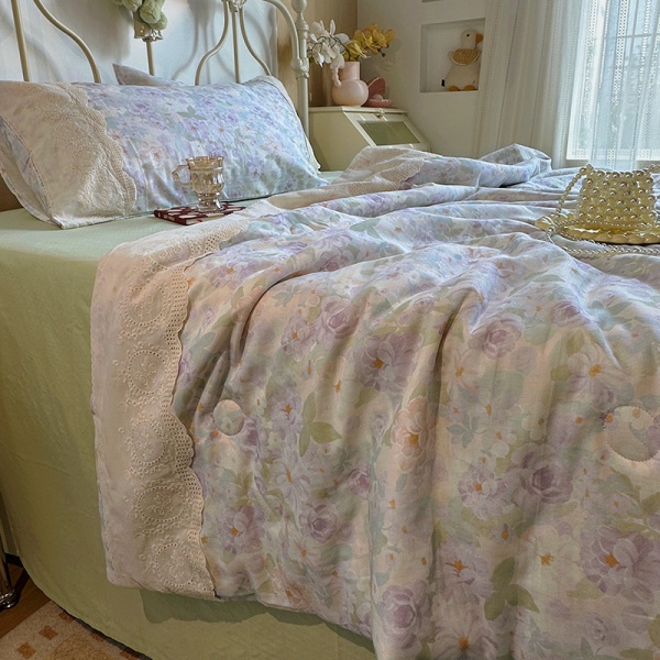 商品属性 [克重] 800g(含)~1000g(不含) [加工定制] 否 [印染工艺] 活性印染 [图案] 植物花卉 [是否一般纳税人] 否 [材质] 纯棉 [款式] 床单式 [织造工艺] 花边 [面料支数] 其他 [风格] 法式