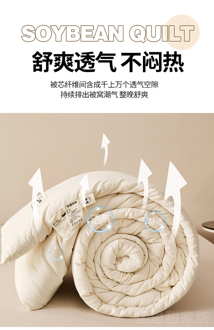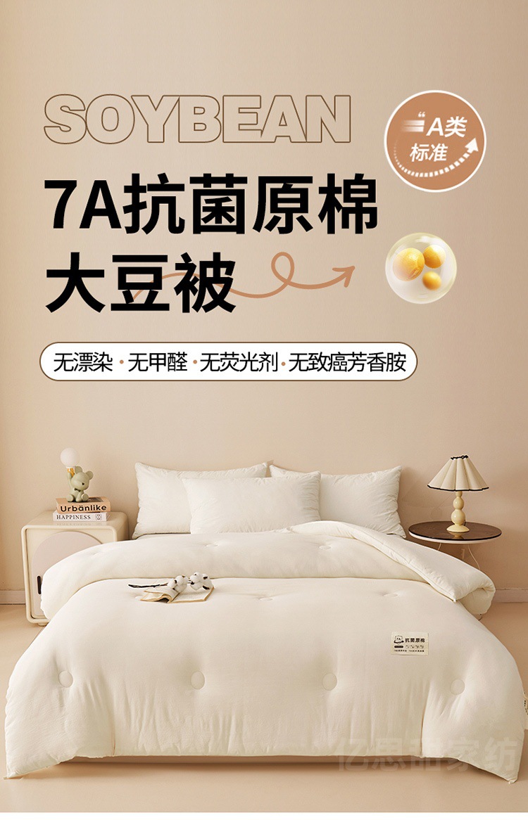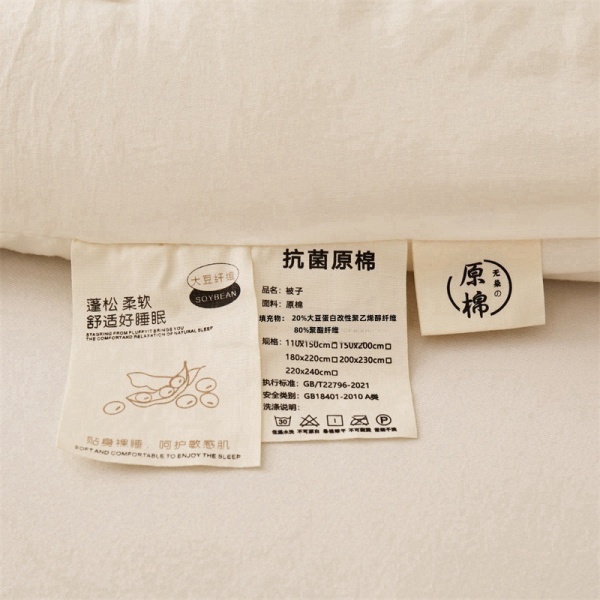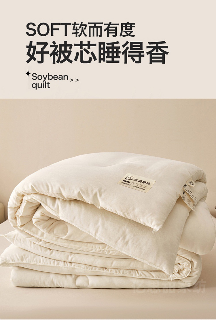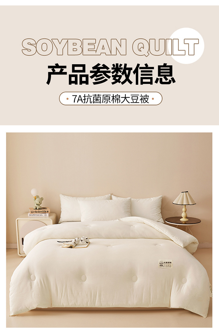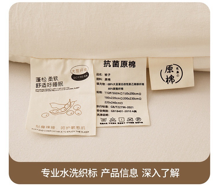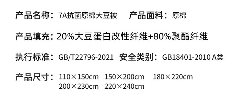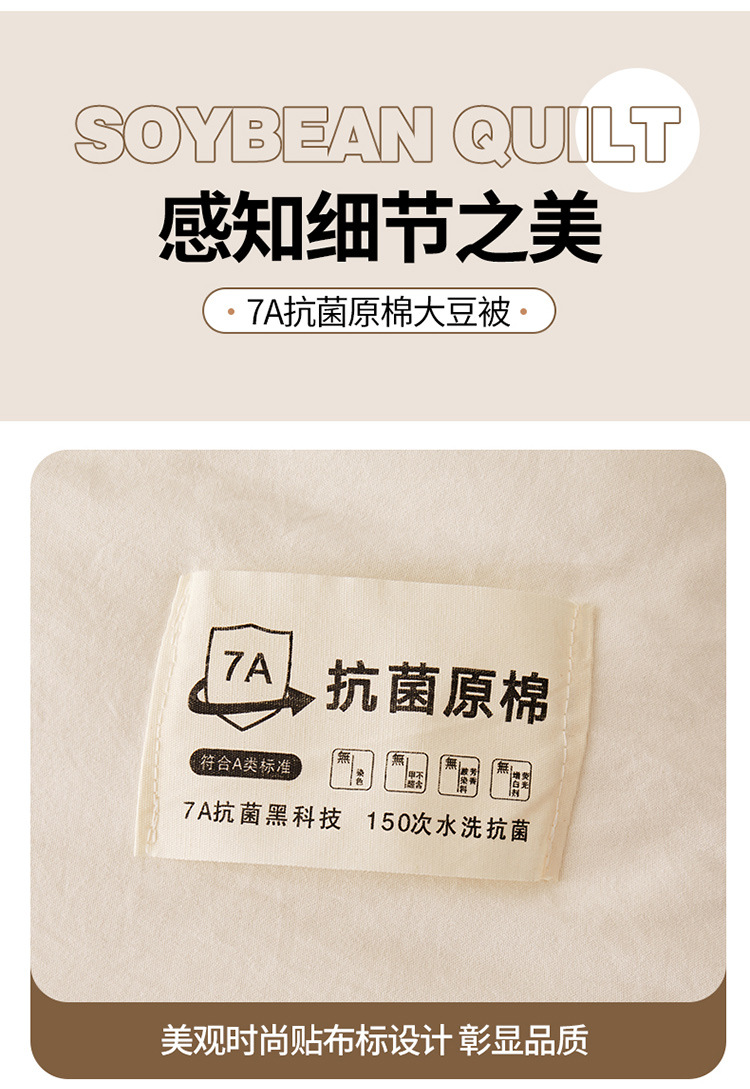 商品属性 [1] 7A抗菌 [加工定制] 是 [填充物] 大豆纤维 [是否一般纳税人] 是 [洗涤方法] 机洗手洗 [织造工艺] 水洗,磨毛,绗缝,平纹 [被子重量] 6斤(不含)-7斤(含) [适用人群] 母婴级可用 [适用季节] 四季通用 [面料材质] 水洗棉