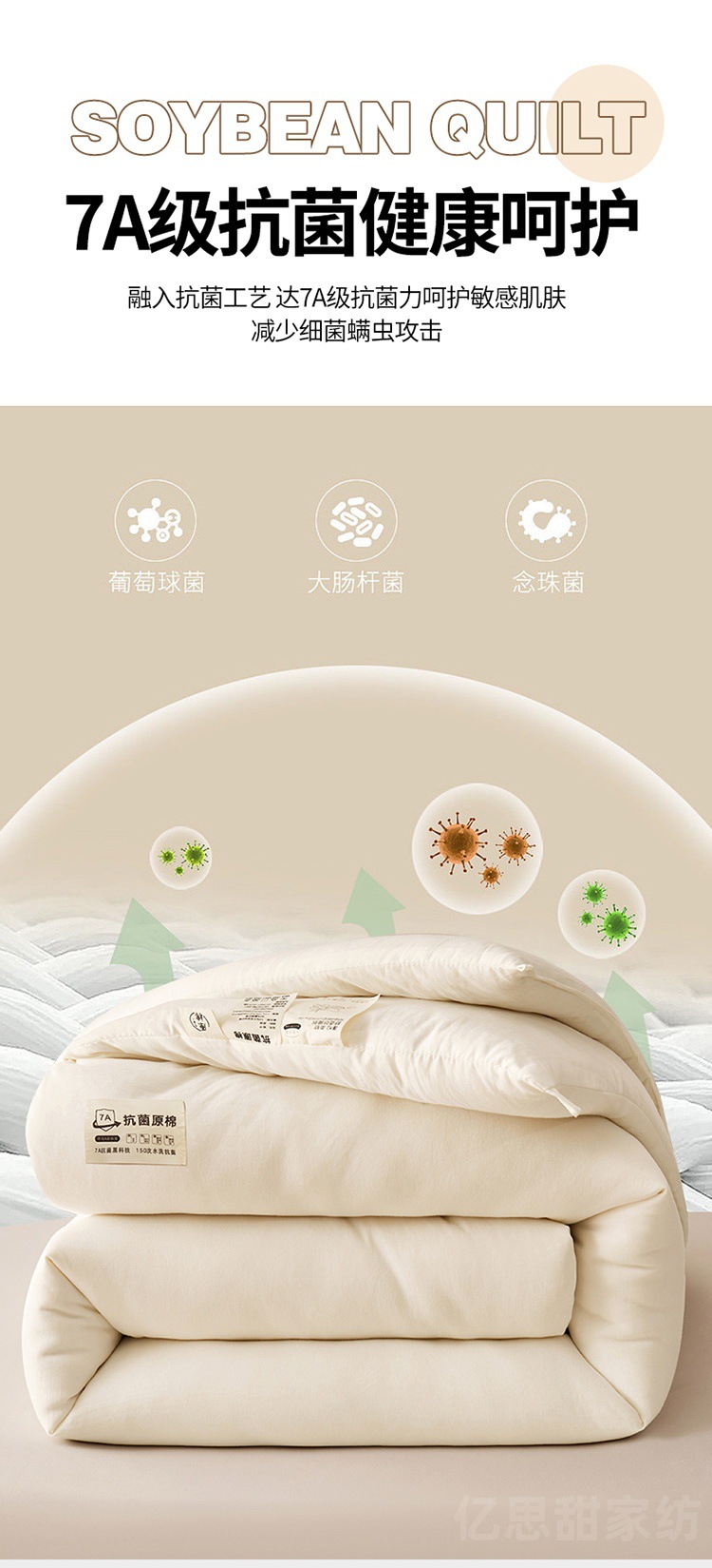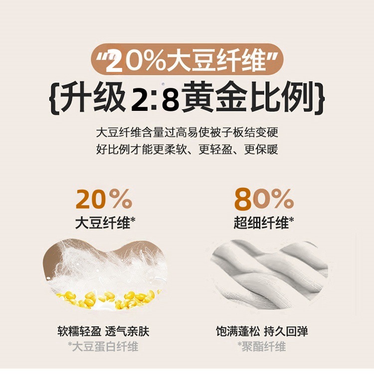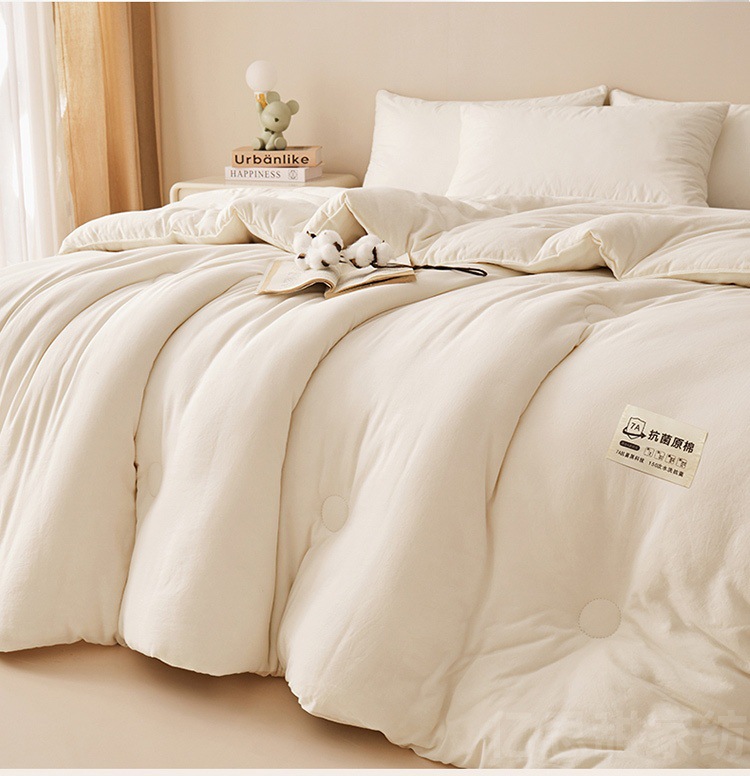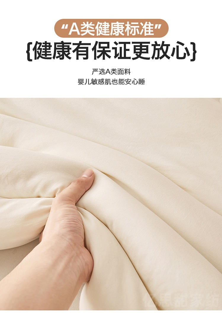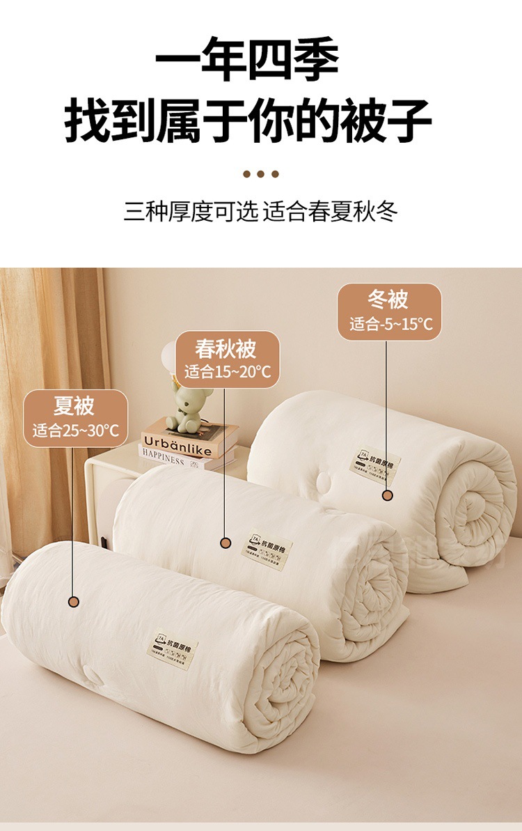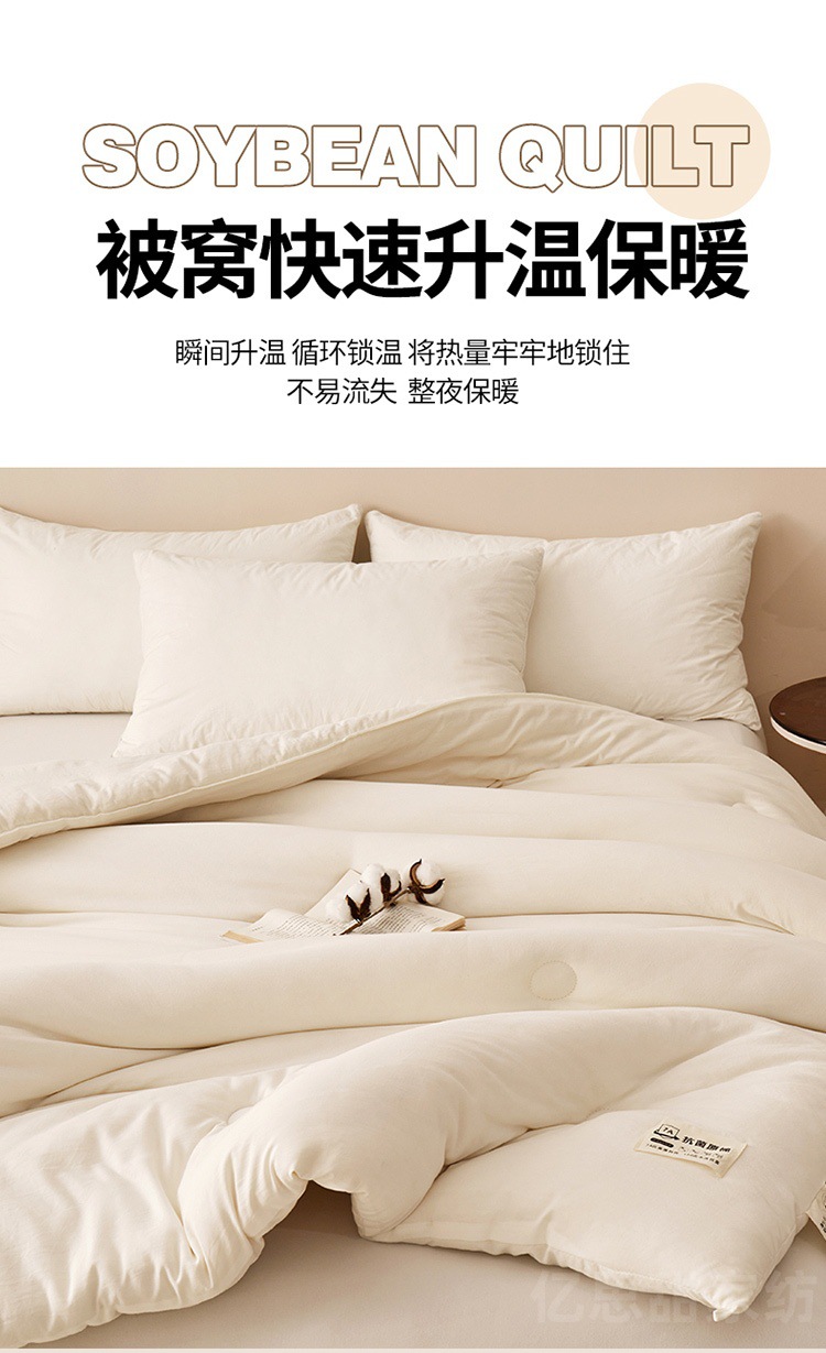 商品属性 [1] 7A抗菌 [加工定制] 是 [填充物] 大豆纤维 [是否一般纳税人] 是 [洗涤方法] 机洗手洗 [织造工艺] 水洗,磨毛,绗缝,平纹 [被子重量] 6斤(不含)-7斤(含) [适用人群] 母婴级可用 [适用季节] 四季通用 [面料材质] 水洗棉