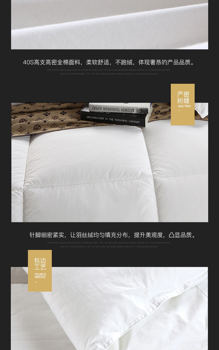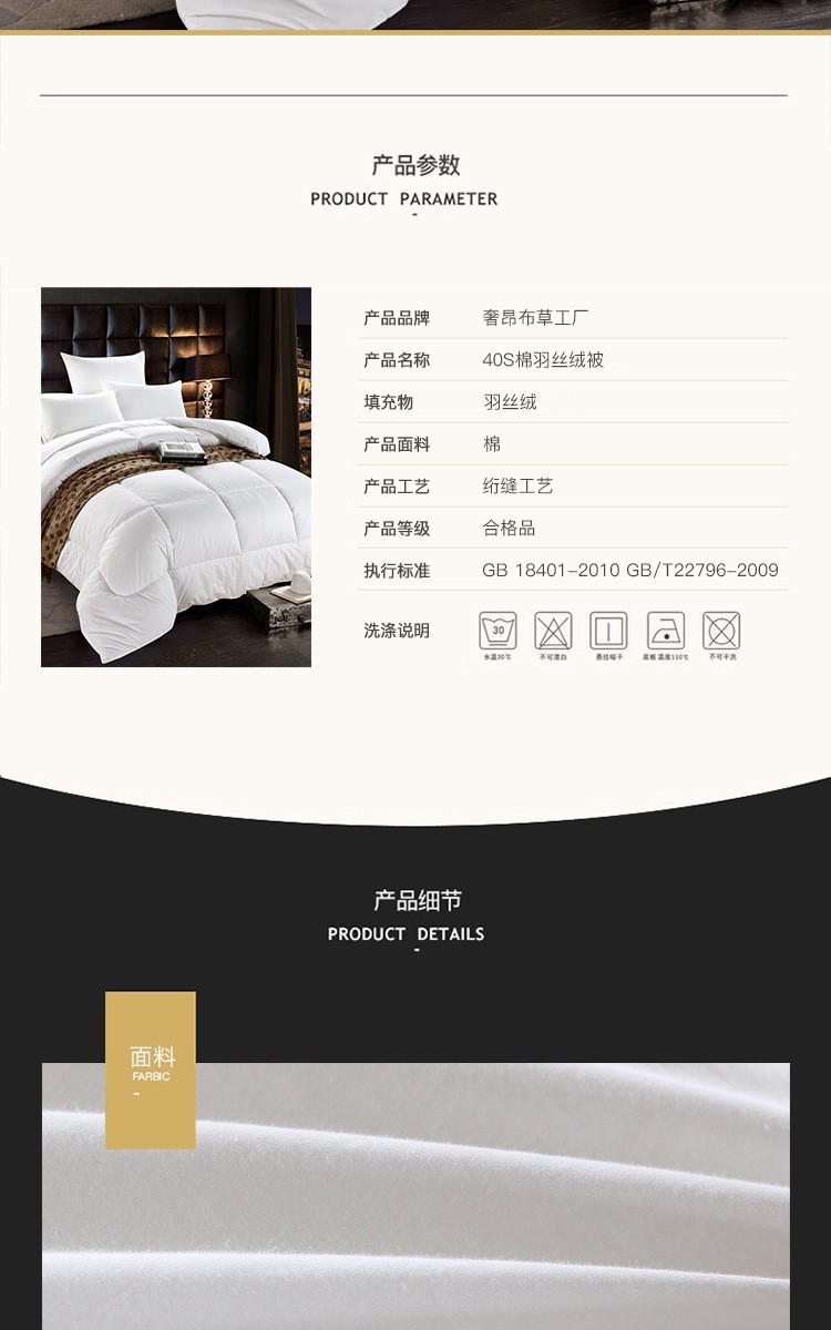 商品属性 [加工定制] 是 [填充物] 羽丝棉(聚酯纤维) [是否一般纳税人] 是 [织造工艺] 绗缝,平纹 [被子重量] 4斤(不含)-5斤(含) [适用季节] 四季通用 [面料材质] 纯棉