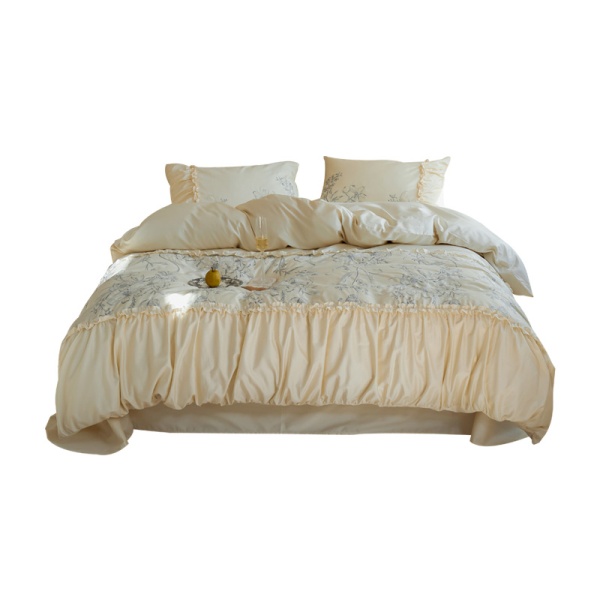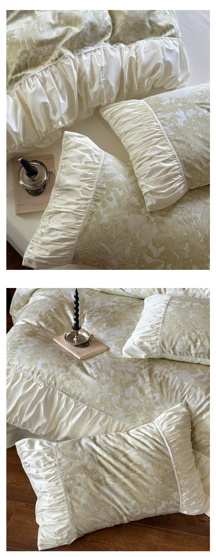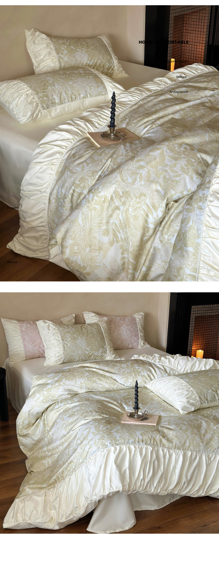 100S高支高密:面料支数密度高,光泽饱满高级轻奢,带来更舒适的睡眠体验。贡缎长绒棉面料:精选优质长绒棉,舒适透气,贡缎丝绸奢华质感,触感顺滑细腻。法式百褶边:手工打褶百褶花边,浪漫法式风情,妩媚不失个性,小细节体现高品质。面料:全棉,100高支高密长绒棉。工艺:百褶花边。