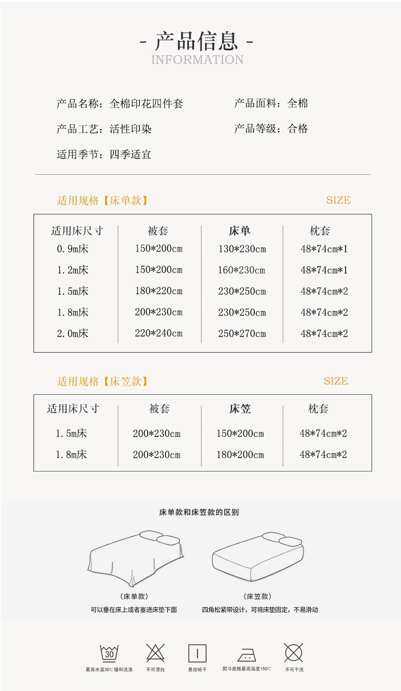 商品属性 [主要下游平台] ebay,亚马逊,速卖通,独立站,LAZADA [主要销售地区] 欧洲,南美,东南亚,北美 [产品等级] 合格品 [加工定制] 是 [印染工艺] 活性印染 [图案] 植物花卉 [是否一般纳税人] 是 [是否支持一件代发] 支持 [是否跨境出口专供货源] 是 [有可授权的自有品牌] 是 [材质] 纯棉 [款式] 床单式 [织造工艺] 水洗,印花,斜纹,绗缝,色织,喷气 [适用床尺寸] 1.8m(6英尺)床 [面料密度] 133x72 [面料支数] 40支 [风格] 卡通