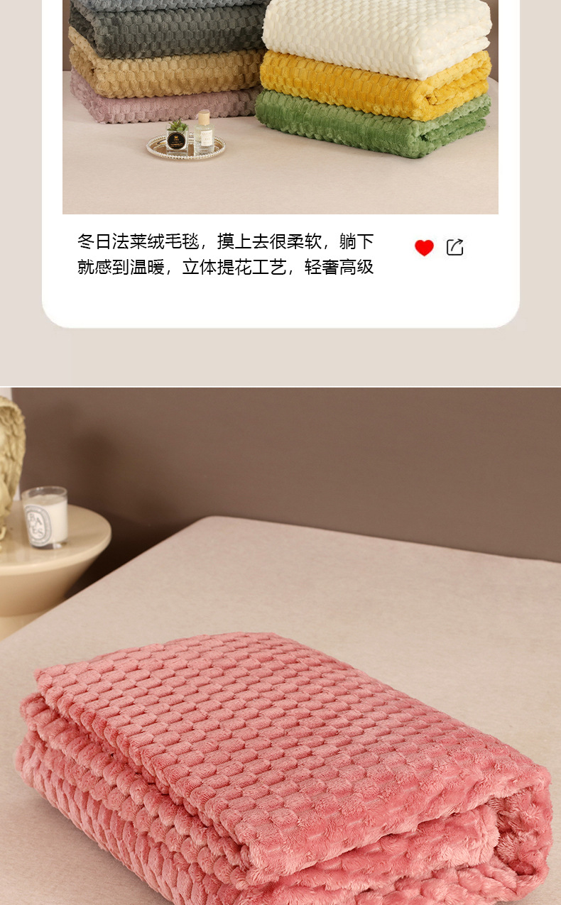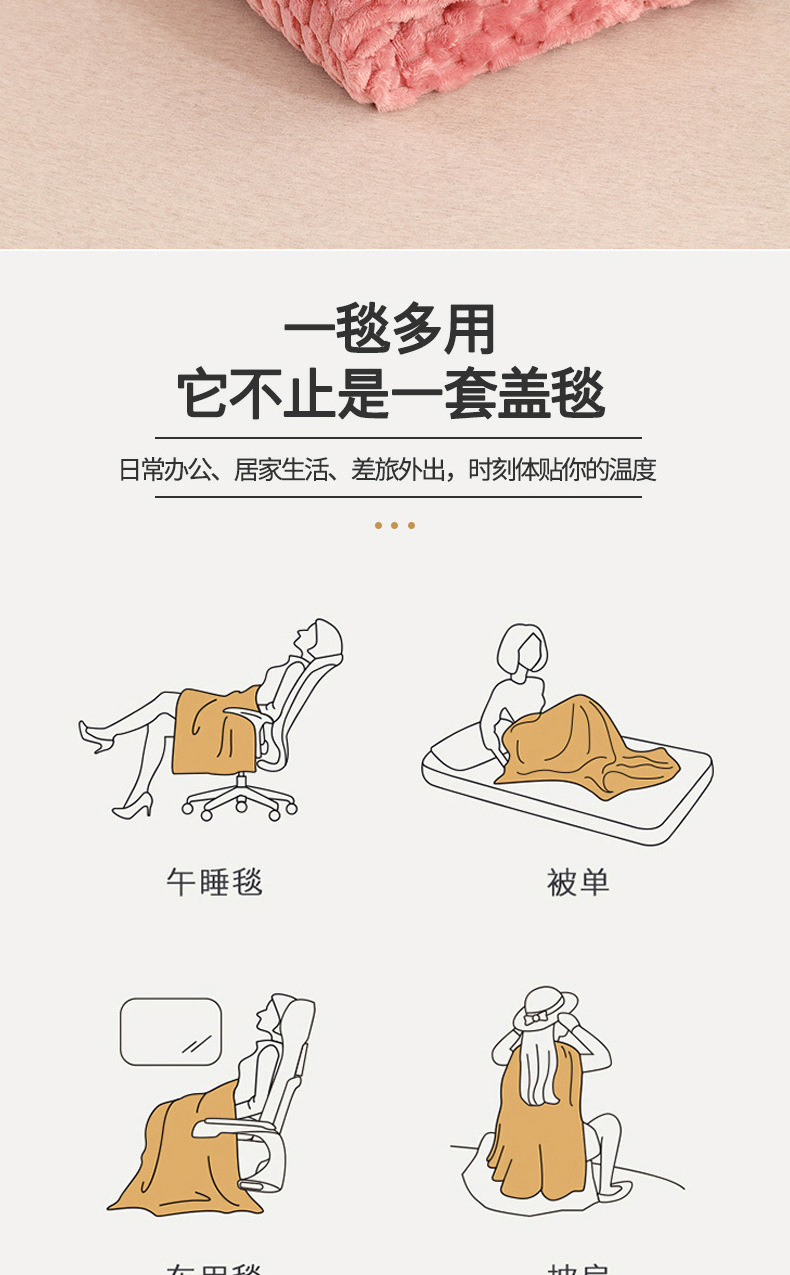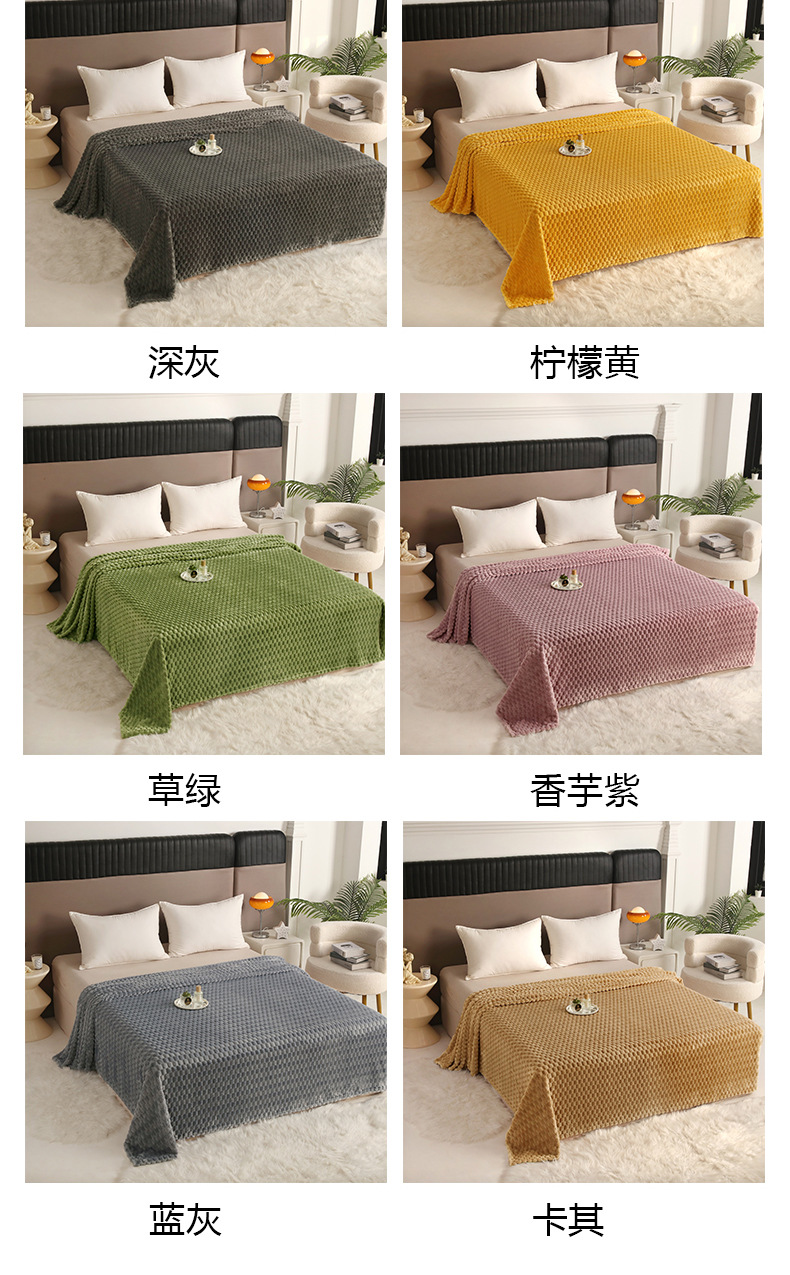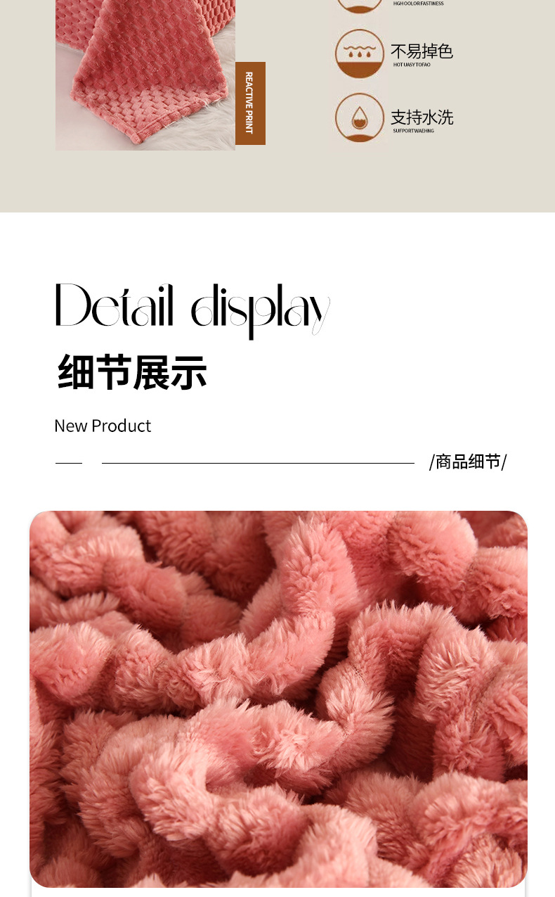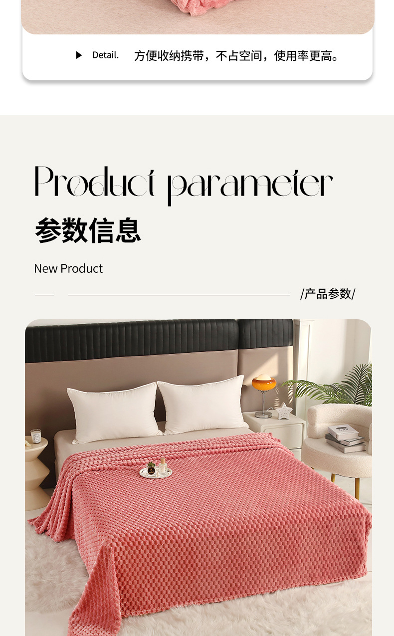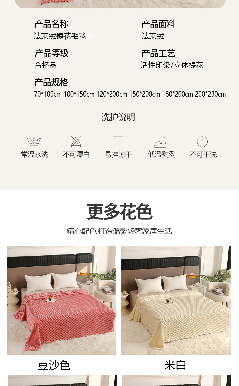 商品属性 [克重] 300g(不含)以下 [加工定制] 是 [图案] 纯色 [是否一般纳税人] 否 [材质] 聚酯纤维(涤纶) [毯类型] 珊瑚绒毯 [适用季节] 四季通用 [风格] 日式