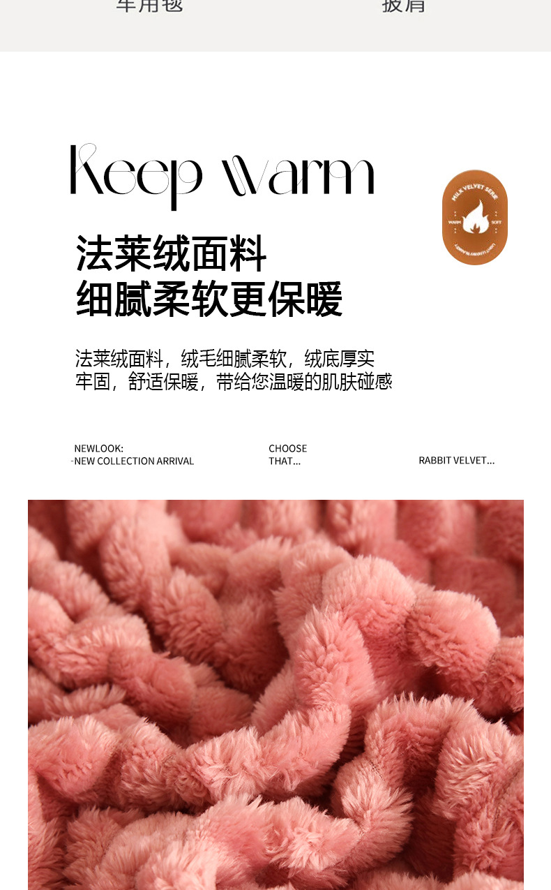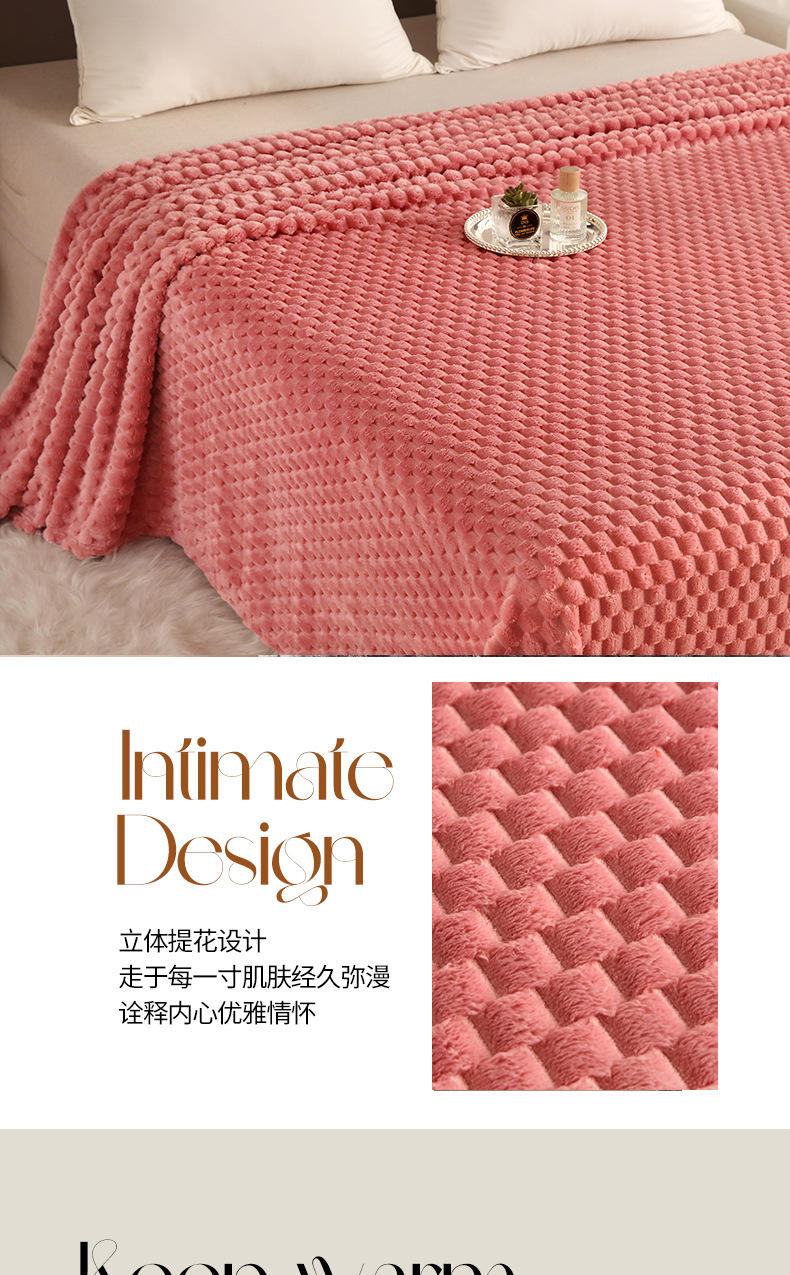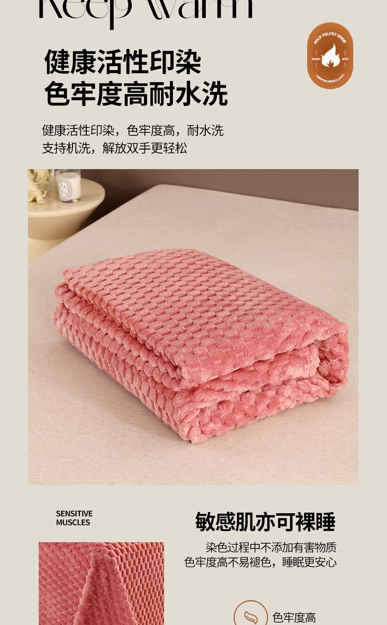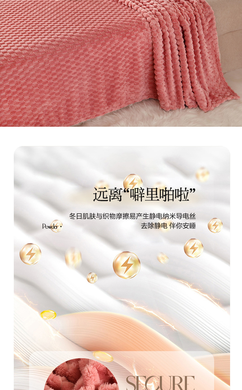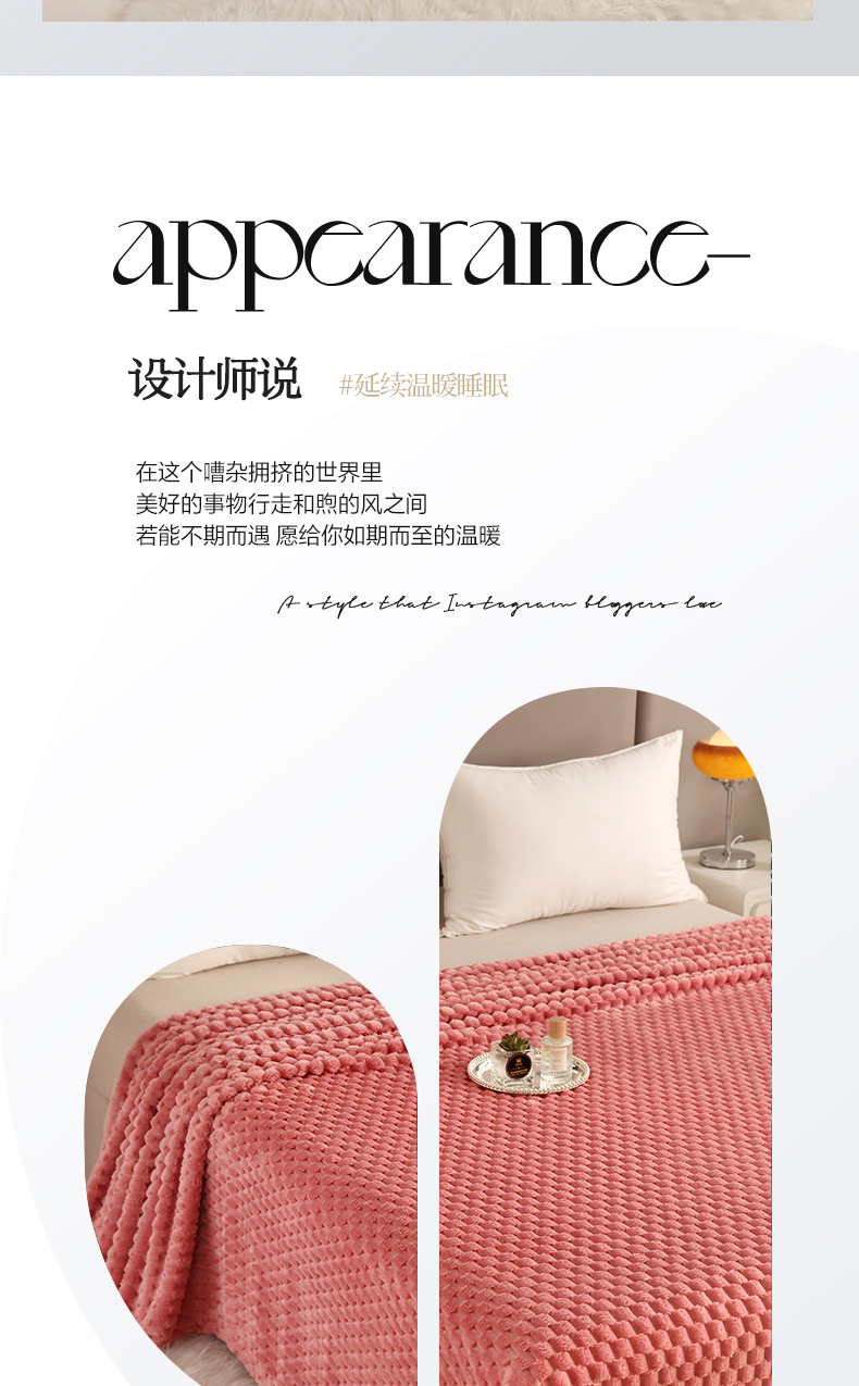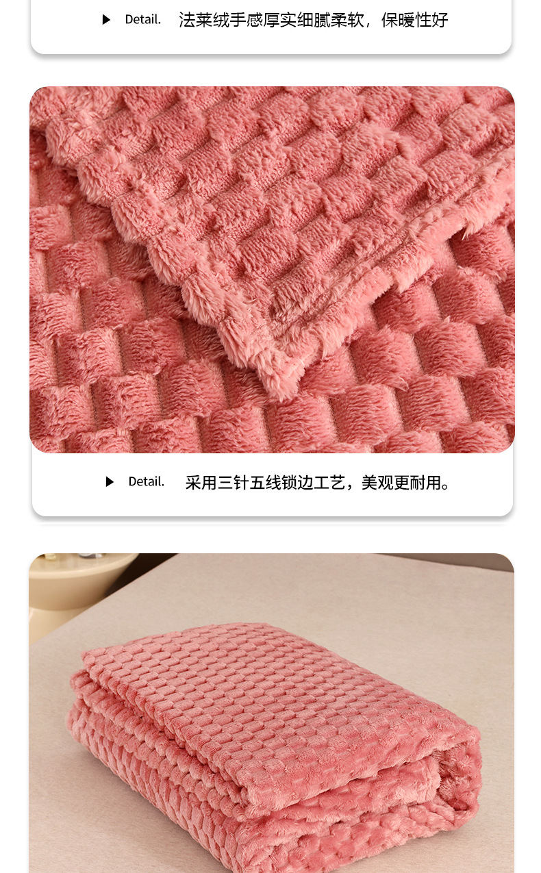 商品属性 [克重] 300g(不含)以下 [加工定制] 是 [图案] 纯色 [是否一般纳税人] 否 [材质] 聚酯纤维(涤纶) [毯类型] 珊瑚绒毯 [适用季节] 四季通用 [风格] 日式