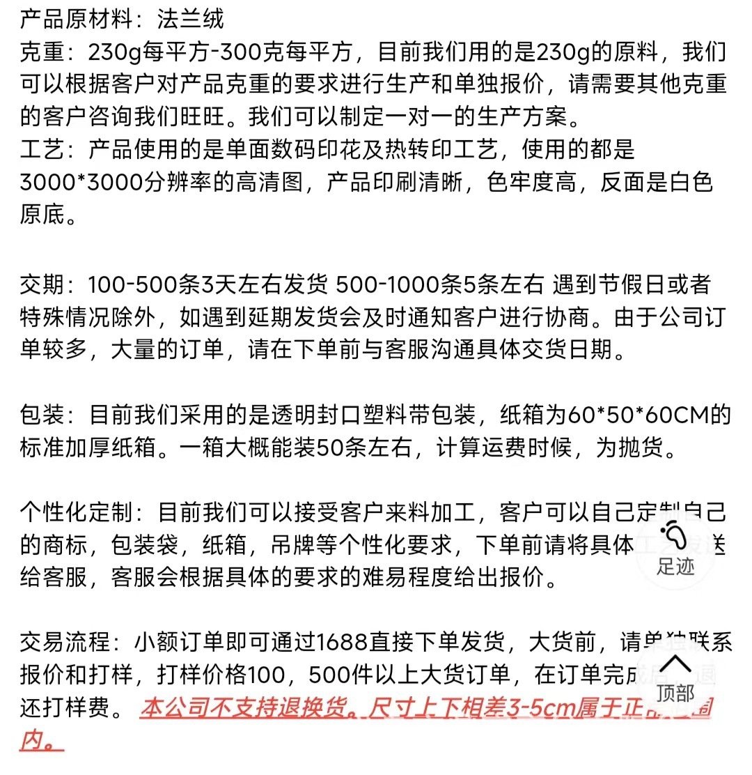 商品属性 [克重] 300g(含)~500g(不含) [图案] 卡通动漫 [是否一般纳税人] 否 [材质] 聚酯纤维(涤纶) [毯类型] 法兰绒毯 [适用季节] 四季通用 [风格] 卡通