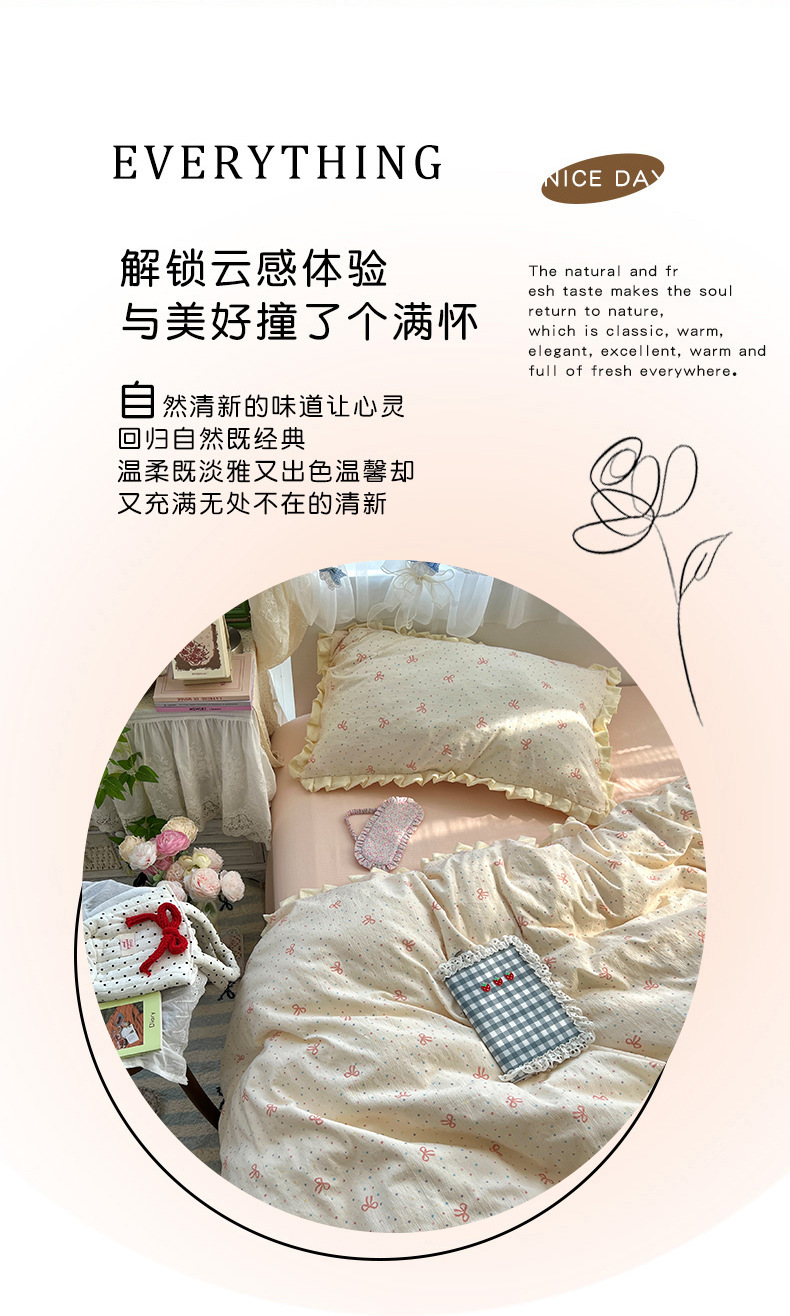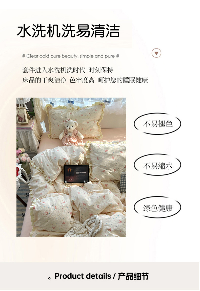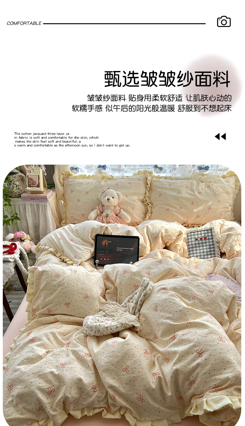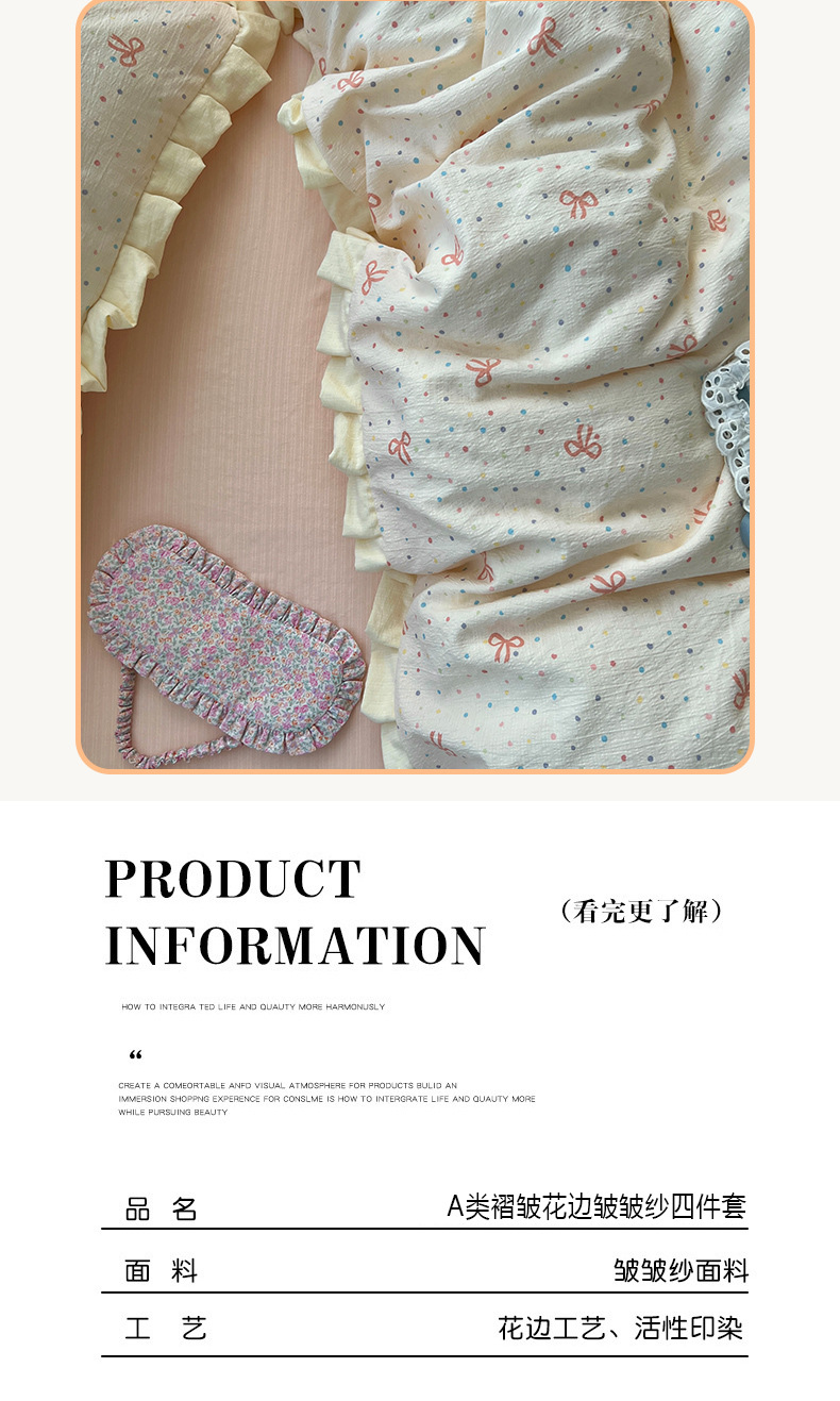 商品属性 [克重] 2000g(含)~2500g(不含) [加工定制] 否 [印染工艺] 活性印染 [图案] 植物花卉 [是否一般纳税人] 是 [材质] 皱皱纱 [款式] 床单式 [织造工艺] 花边,褶皱 [风格] ins风