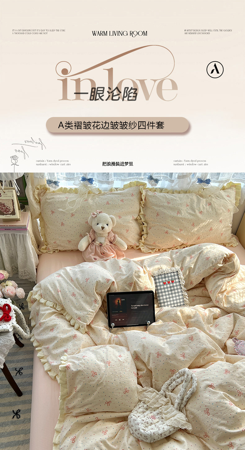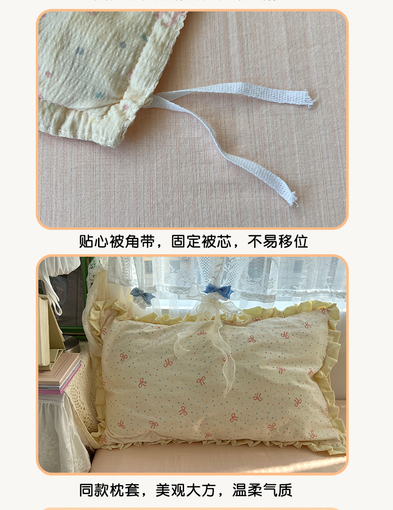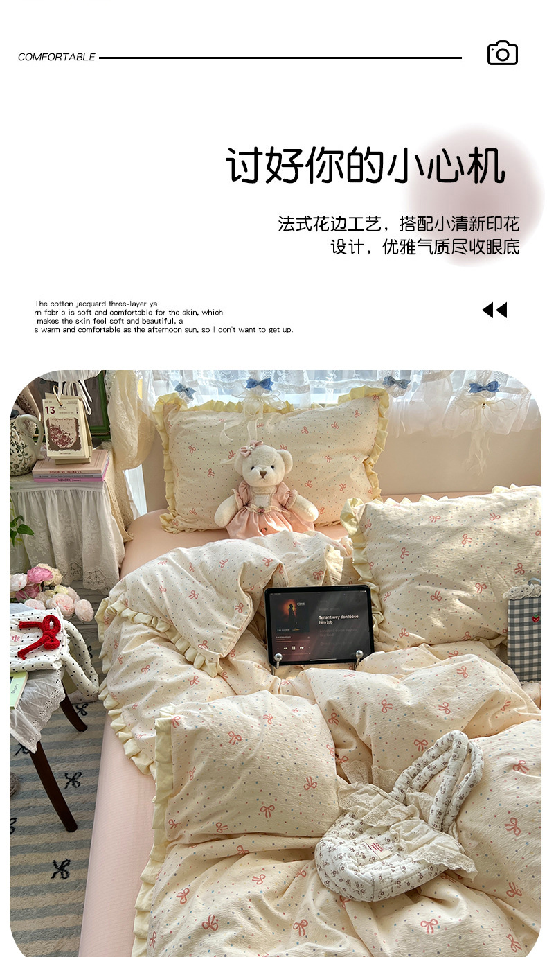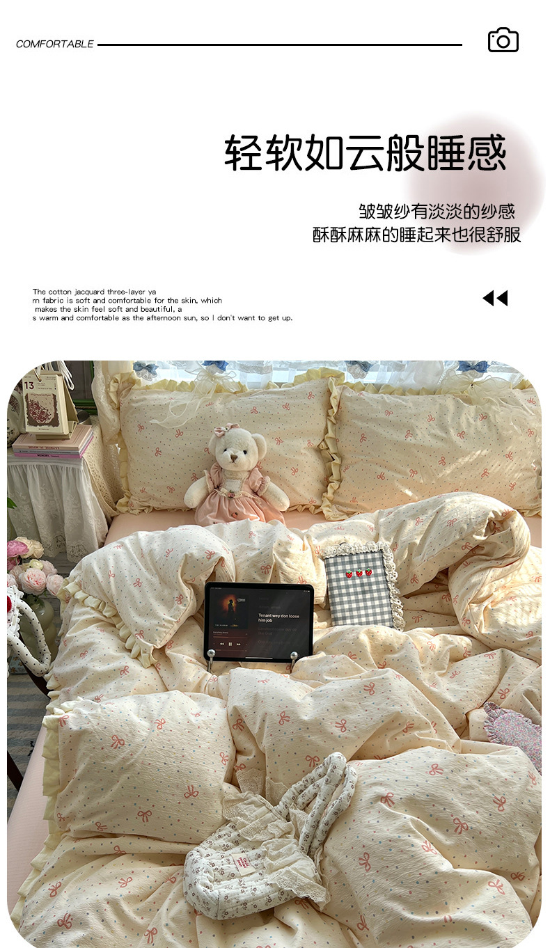 商品属性 [克重] 2000g(含)~2500g(不含) [加工定制] 否 [印染工艺] 活性印染 [图案] 植物花卉 [是否一般纳税人] 是 [材质] 皱皱纱 [款式] 床单式 [织造工艺] 花边,褶皱 [风格] ins风