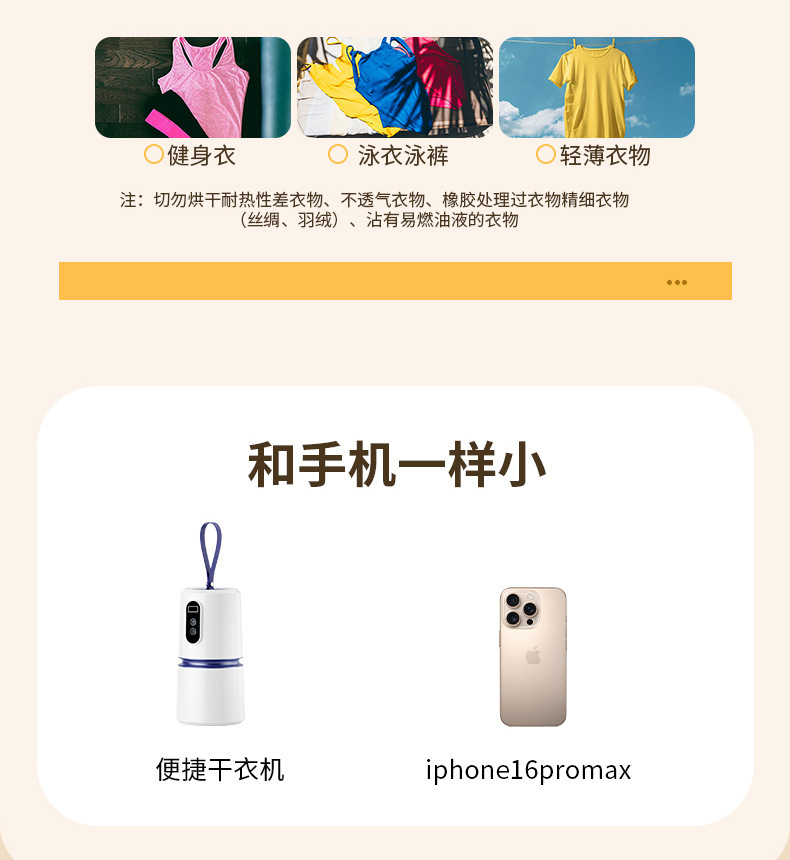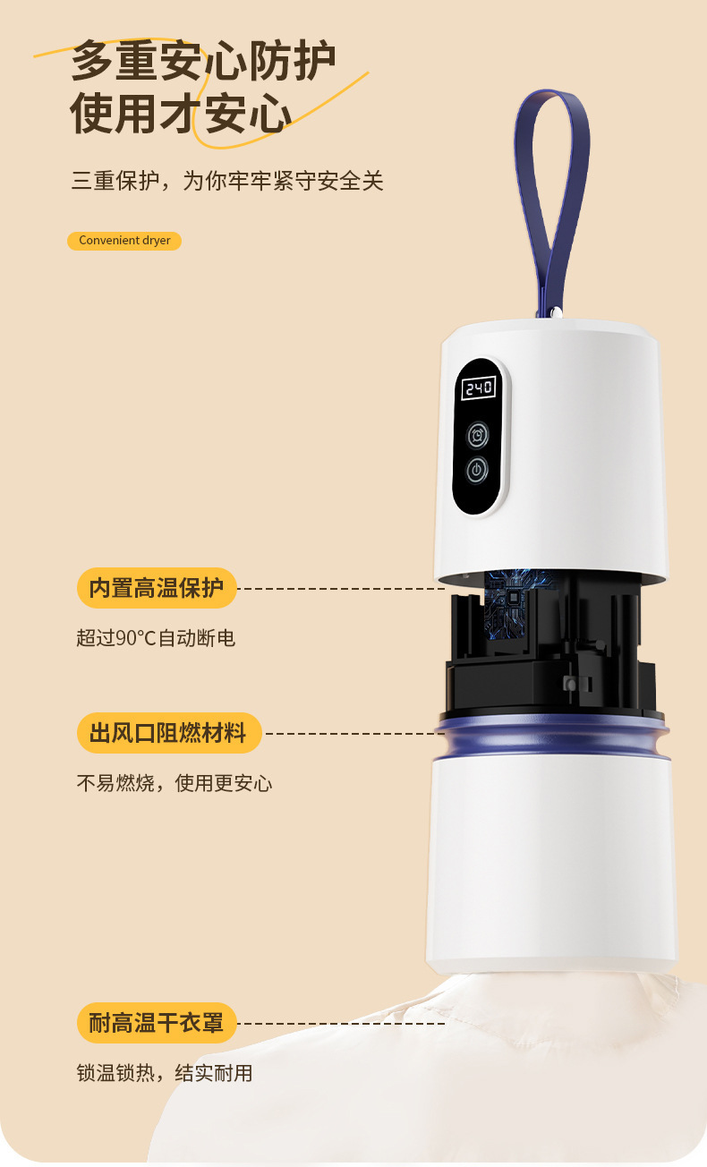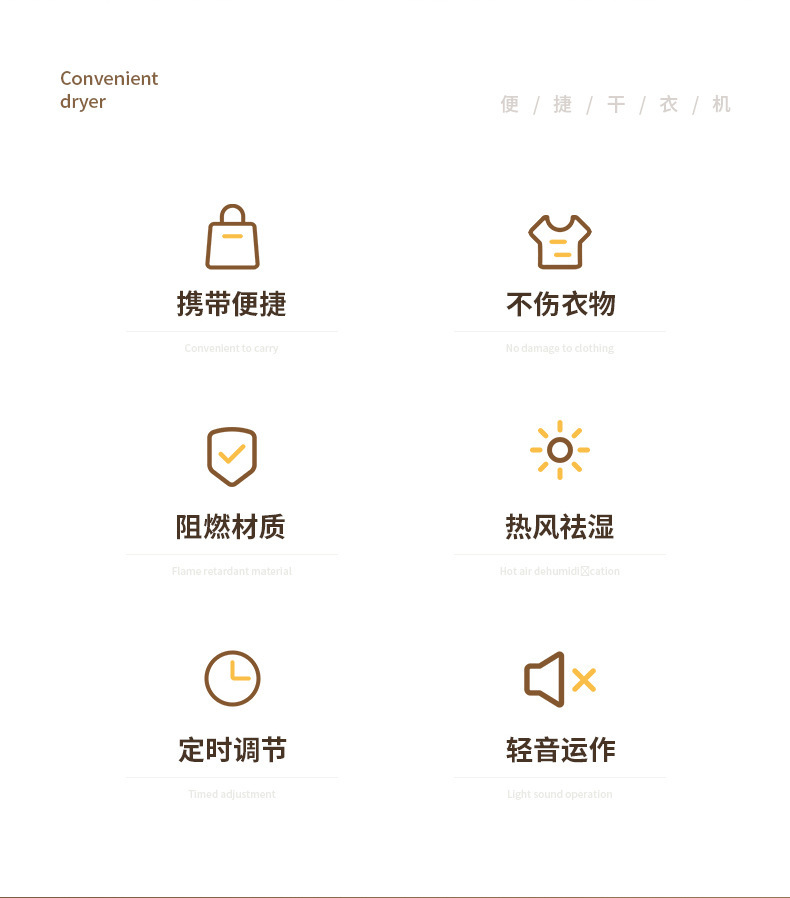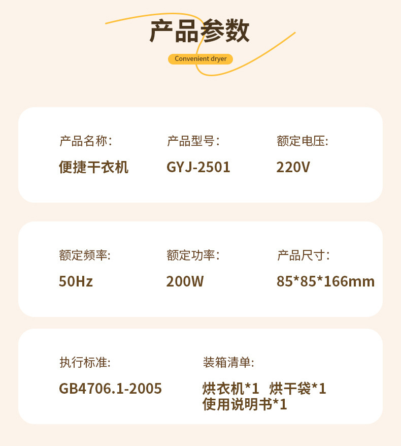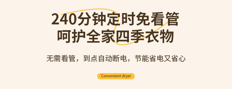 商品属性 [主要下游平台] ebay,亚马逊,wish,速卖通,LAZADA [主要销售地区] 欧洲,南美,东南亚,北美,东北亚 [功率] 500W以下 [加热方式] PTC [型号] 2501 [外形] 圆柱形 [承载重量] 5-10kg [控制方式] 微电脑式 [支架材质] 铝合金 [断电保护] 有 [是否跨境出口专供货源] 是 [最大定时范围] 121分钟(含)-240分钟(含) [有可授权的自有品牌] 否 [类型] 折叠干衣机 [脚轮] 无 [适用场景] 家用