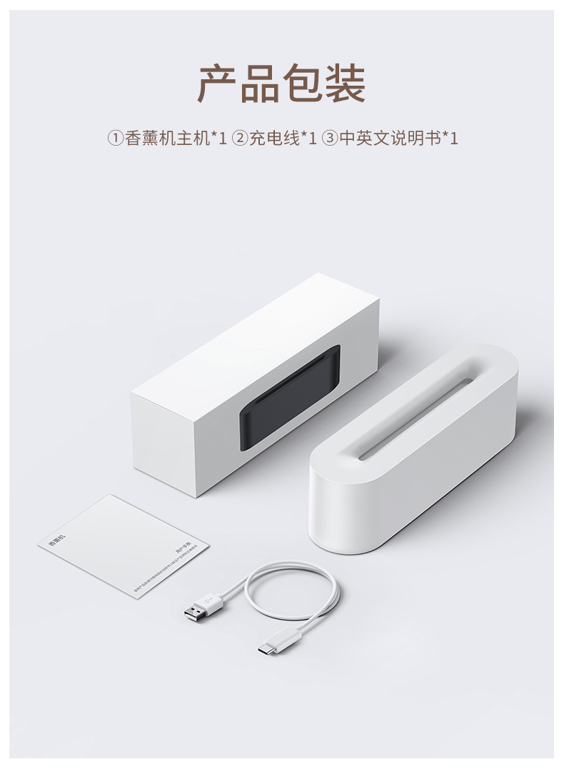 产品附带配件明细: 香薰机主机*1、Typec电源线*1、中英文说明书*1