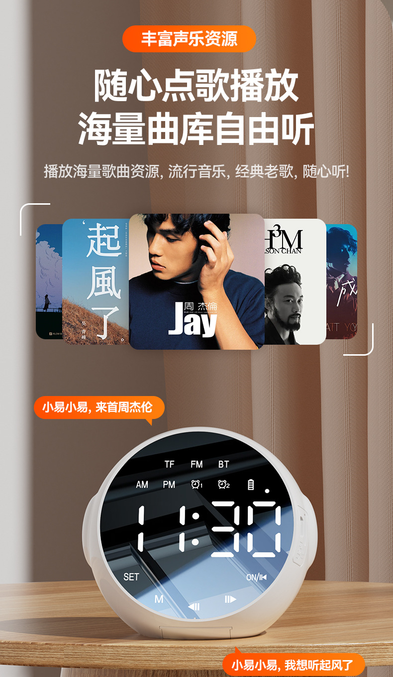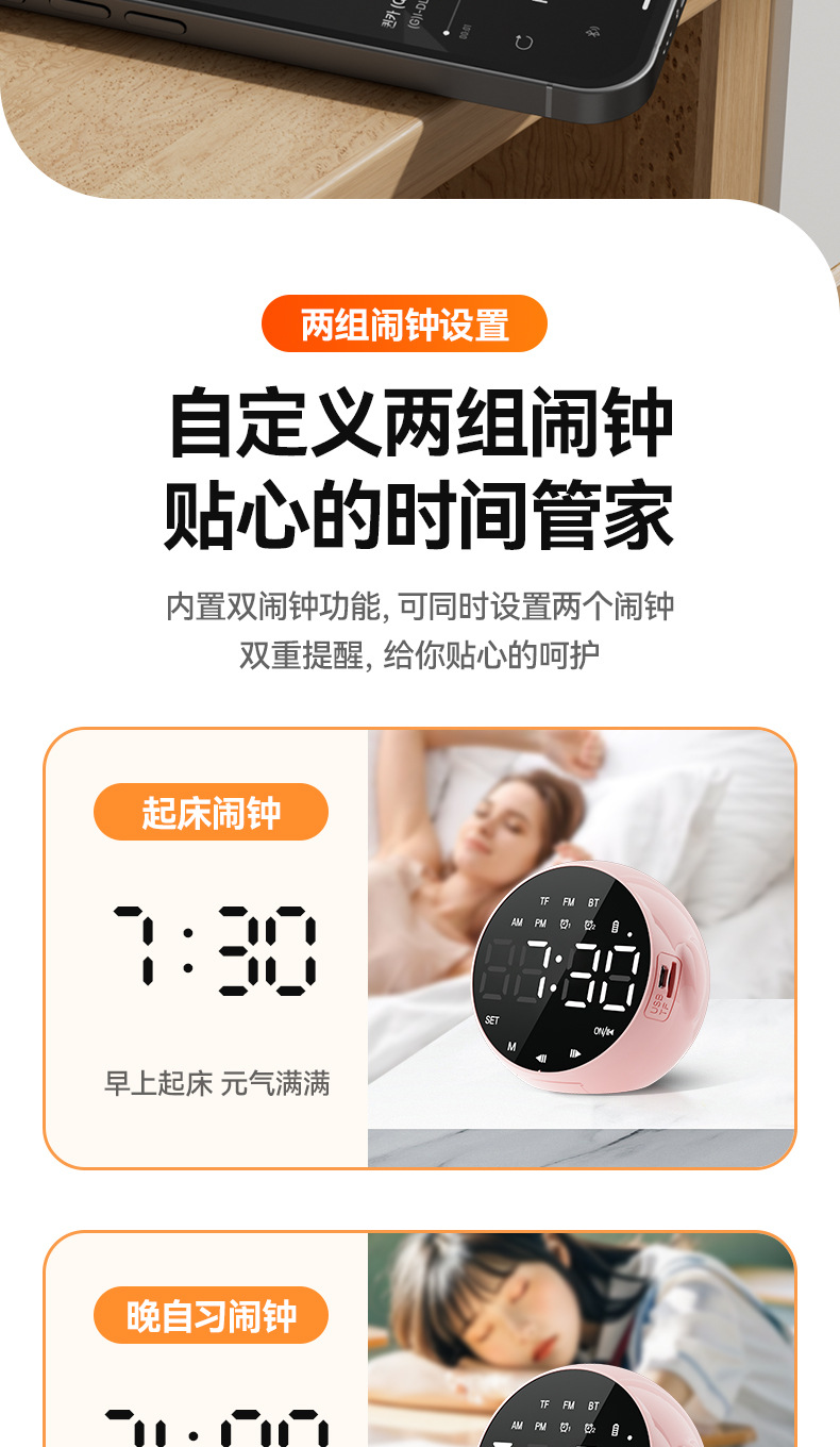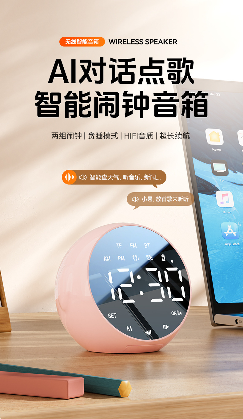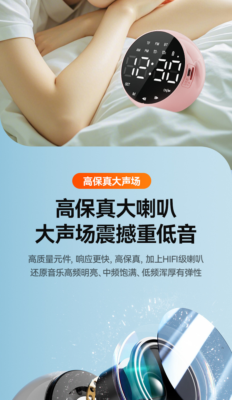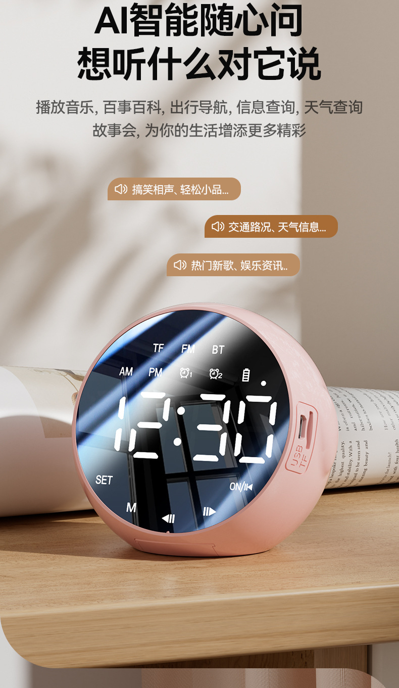商品属性 [上市时间] 2024 [主要下游平台] 其他 [主要销售地区] 北美,东北亚,中东,拉丁美洲,欧美,其他 [产品净重] 200克 [信噪比] ≥85dB [内置蓄电池容量] 1200mAh-2000mAh(含) [功能] 大音量家用闹铃小音箱 [名称] 闹钟蓝牙音响 [售后服务] 店铺三包 [喇叭数] 1 [外观尺寸] 89mm*84mm*73mm [是否专利货源] 否 [是否内置电池] 内置电池 [是否外贸] 否 [是否跨境出口专供货源] 是 [有效距离] 10米 [电源方式] 锂电池 [箱体材质] 塑料 [统称] 多功能AI智能无线语音闹钟 [蓝牙版本] 5.0 [连接方式] 蓝牙连接 [适用场景] 其他 [防水等级] IPX 7 [附加功能] 闹钟,语音提示 [频响范围] 150HZ-20KHZ [额定功率] 3W [额定电压] 5