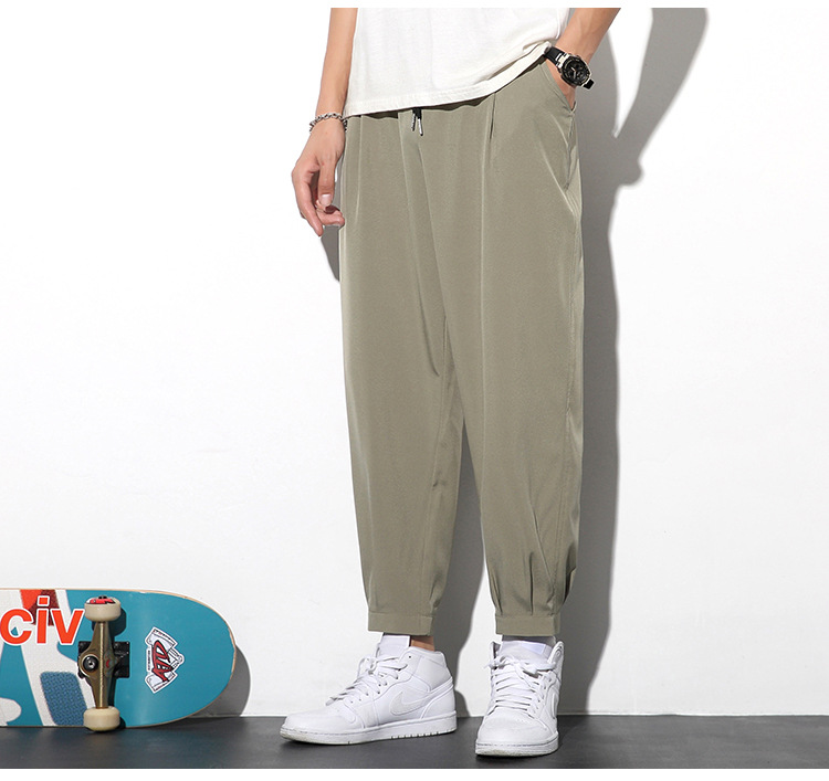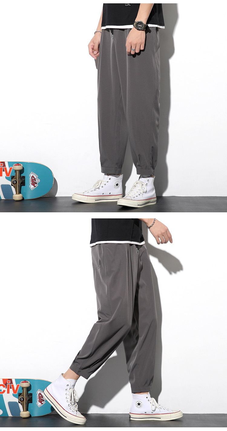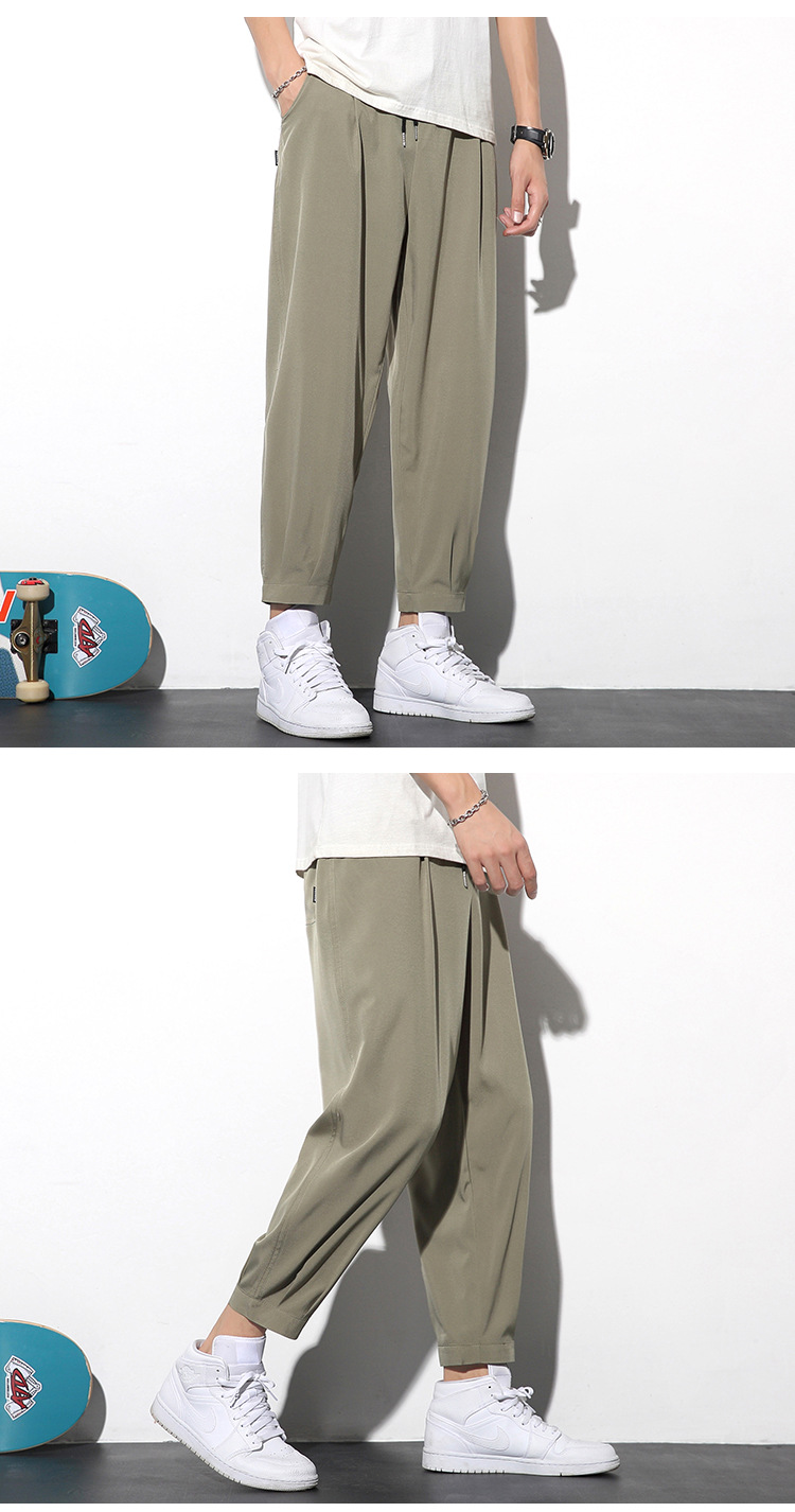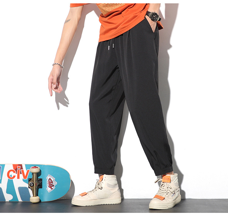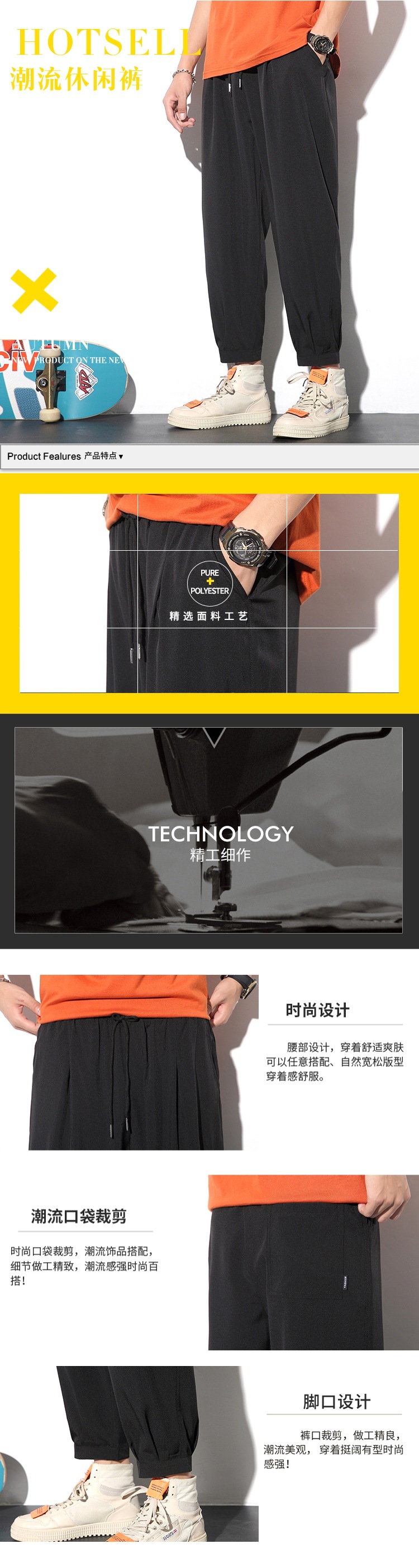 商品属性 [上市年份/季节] 2024年夏季 [主要下游平台] ebay,亚马逊,wish,速卖通,独立站,LAZADA [主要销售地区] 非洲,欧洲,南美,东南亚,北美,东北亚,中东 [主面料成分] 聚酯纤维(涤纶) [主面料成分的含量] 95 [厚薄] 薄款 [原创设计货源] 是 [图案] 纯色 [工艺] 免烫处理 [库存类型] 整单 [弹力] 微弹 [是否库存] 是 [是否有腰带] 有腰带 [是否跨境出口专供货源] 是 [有可授权的自有品牌] 否 [有无质检报告] 否 [材质功能] 透气 [款式] 基本款 [款式细节] 撞色 [淘货类别] 青春流行(18-24岁) [类别] 运动休闲裤 [腰型] 中腰 [裤型] 宽松型 [裤脚口款式] 小脚 [裤长] 九分裤 [裤门襟] 系绳闭襟 [误差范围] 1-2CM [货源类别] 现货 [适合人群] 大码 [适合季节] 夏季 [适用场景] 休闲 [面料] 冰丝 [面料名称] 冰丝 [风格] 韩版