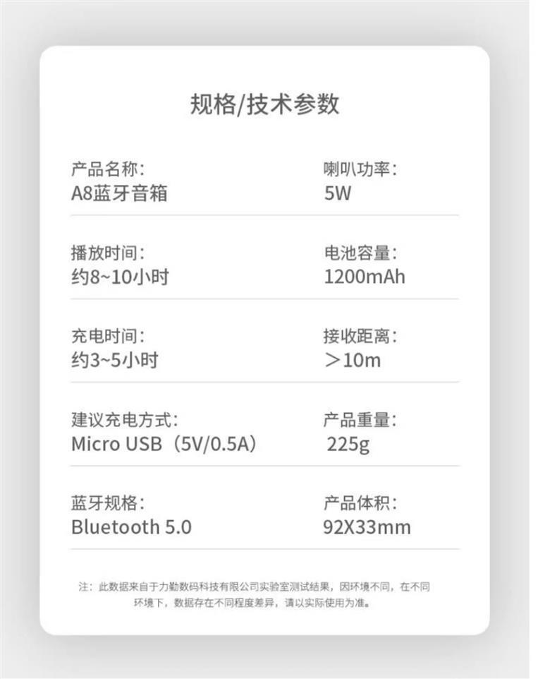 商品属性 [上市时间] 其他 [主要销售地区] 其他 [产品净重] 276g [信噪比] ≥70db [内置蓄电池容量] 1000mAh-1200mAh(含) [售后服务] 一年免费换新 [喇叭数] 其他 [外观尺寸] 85x85x30mm [是否专利货源] 否 [是否内置电池] 内置电池 [是否外贸] 否 [是否跨境出口专供货源] 否 [有效距离] 其他 [电源方式] USB [箱体材质] ABS [蓝牙版本] 5.0 [连接方式] 3.5MM音频插口 [适用场景] 其他 [防水等级] 不防水 [附加功能] 插卡 [频响范围] 100HZ-20KHZ [额定功率] 3W [额定电压] 其他