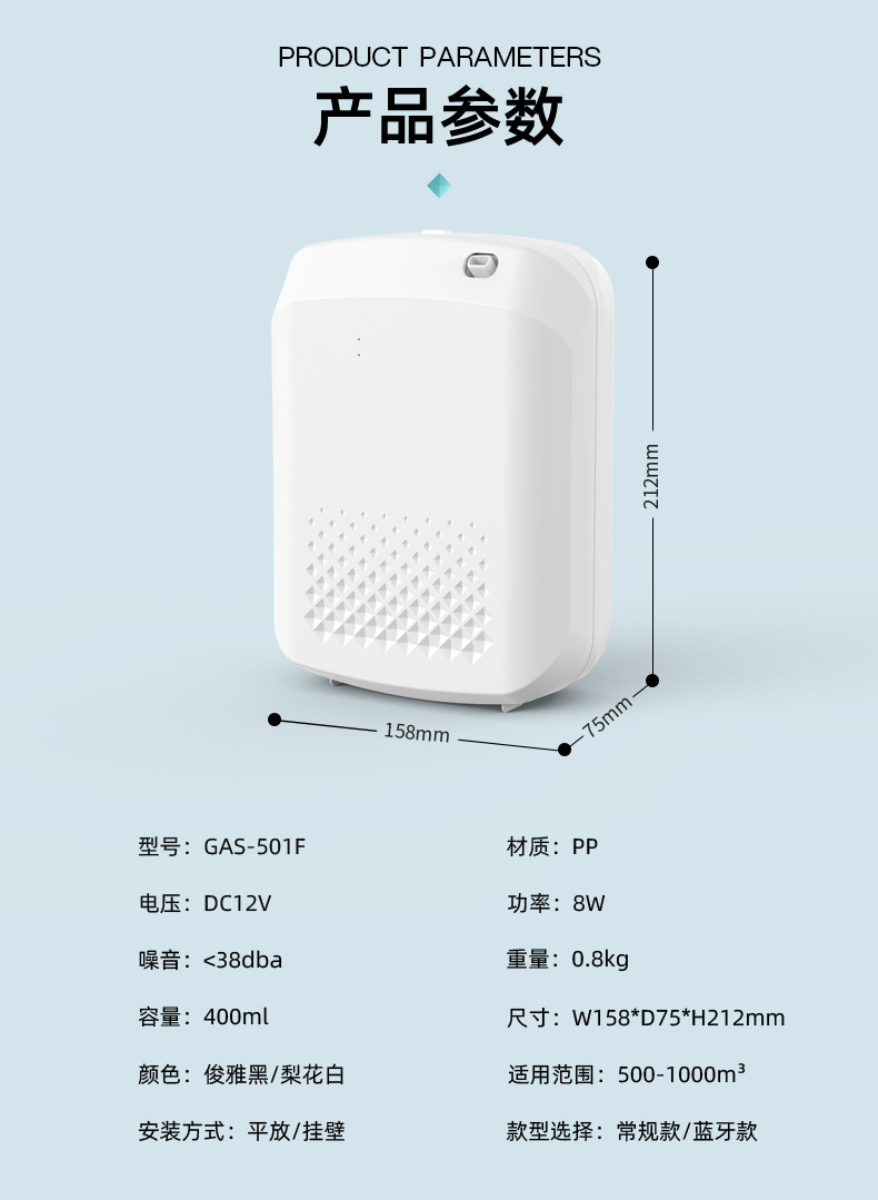 商品属性 [出雾口数] 1个 [功能] 香薰,定时,自动喷香机,扩香 [噪音] 36-45db [外形] 方型 [定时功能] 8小时以上 [操作方式] 触摸式 [是否内置电池] 无电池 [是否有定时预约功能] 是 [是否防烧干] 否 [材质] 其它 [款式] 台式 [水箱容量] 0.5L及以下 [电源方式] 插电款 [类型] 有雾型 [缺水断电保护] 否 [适用场景] 其它,家用,工业,商用 [适用面积] 61㎡ 及以上 [风格] 创意风,简约风