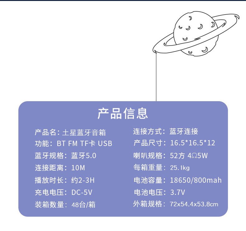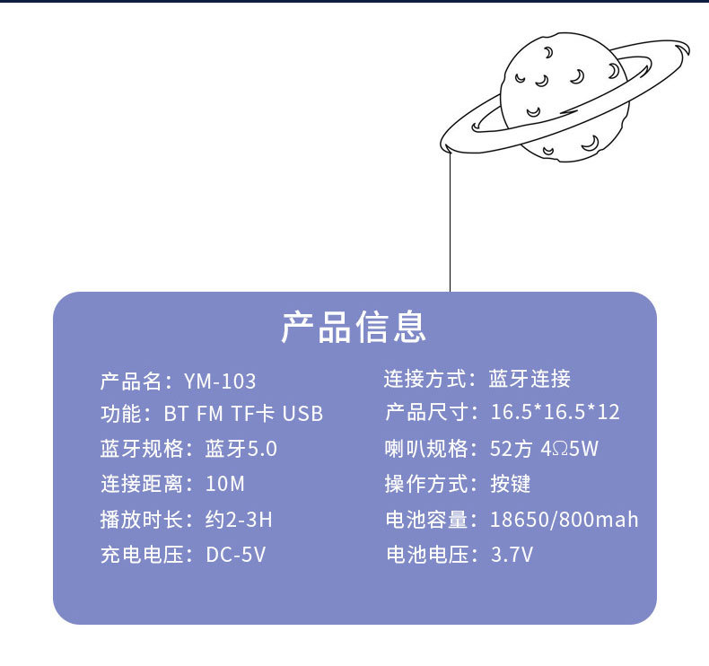 商品属性 [上市时间] 2023年3月 [主要销售地区] 其他 [产品净重] 510g [信噪比] ≥70db [内置蓄电池容量] 800mAh-1000mAh(含) [售后服务] 工厂售后 [喇叭数] 1个 [外观尺寸] 170 [是否专利货源] 否 [是否内置电池] 内置电池 [是否外贸] 否 [是否跨境出口专供货源] 否 [有效距离] 10m [电源方式] USB [箱体材质] ABS [蓝牙版本] 5.0 [连接方式] 蓝牙连接 [适用场景] 桌面,居家,移动便携 [防水等级] 不防水 [附加功能] 插卡,照明 [频响范围] 60Hz-15KHz [额定功率] 5 [额定电压] 5
