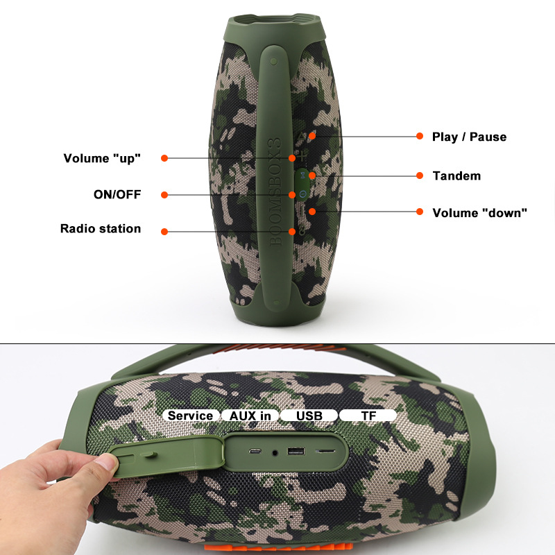 商品属性 [1] 战神三代 [2] 战神JBL音响 [3] BOOMBOX3 [上市时间] 2024 [主要下游平台] 速卖通,独立站,LAZADA,其他 [主要销售地区] 日本,欧洲,南美,东南亚,北美,东北亚,中东,拉丁美洲,欧美,其他 [产品净重] 2.5 [信噪比] ≥70db [内置蓄电池容量] 2000mAh-4000mAh(含) [售后服务] 咨询客服 [喇叭数] 1个 [外观尺寸] 370*155*212 [是否专利货源] 否 [是否内置电池] 内置电池 [是否外贸] 是(本商品仅供外贸用途,可能不符合境内产品标准。请境内买家谨慎购入。) [是否跨境出口专供货源] 是 [有效距离] 10米 [电源方式] 锂电池 [箱体材质] ABS [蓝牙版本] 5.1 [认证类型] ce,ROHS [连接方式] 蓝牙连接 [适用场景] 车载,桌面,健身运动,户外,居家,移动便携,K歌,直播,广场舞,广播系统,户外草坪 [防水等级] 不防水 [附加功能] 插卡,通话功能 [频响范围] 100HZ-20KHZ [额定功率] 5 [额定电压] 5