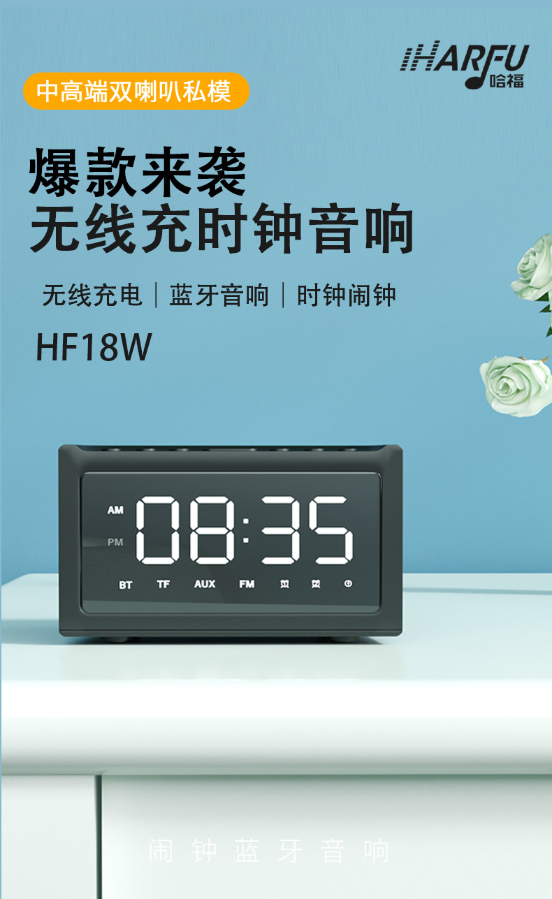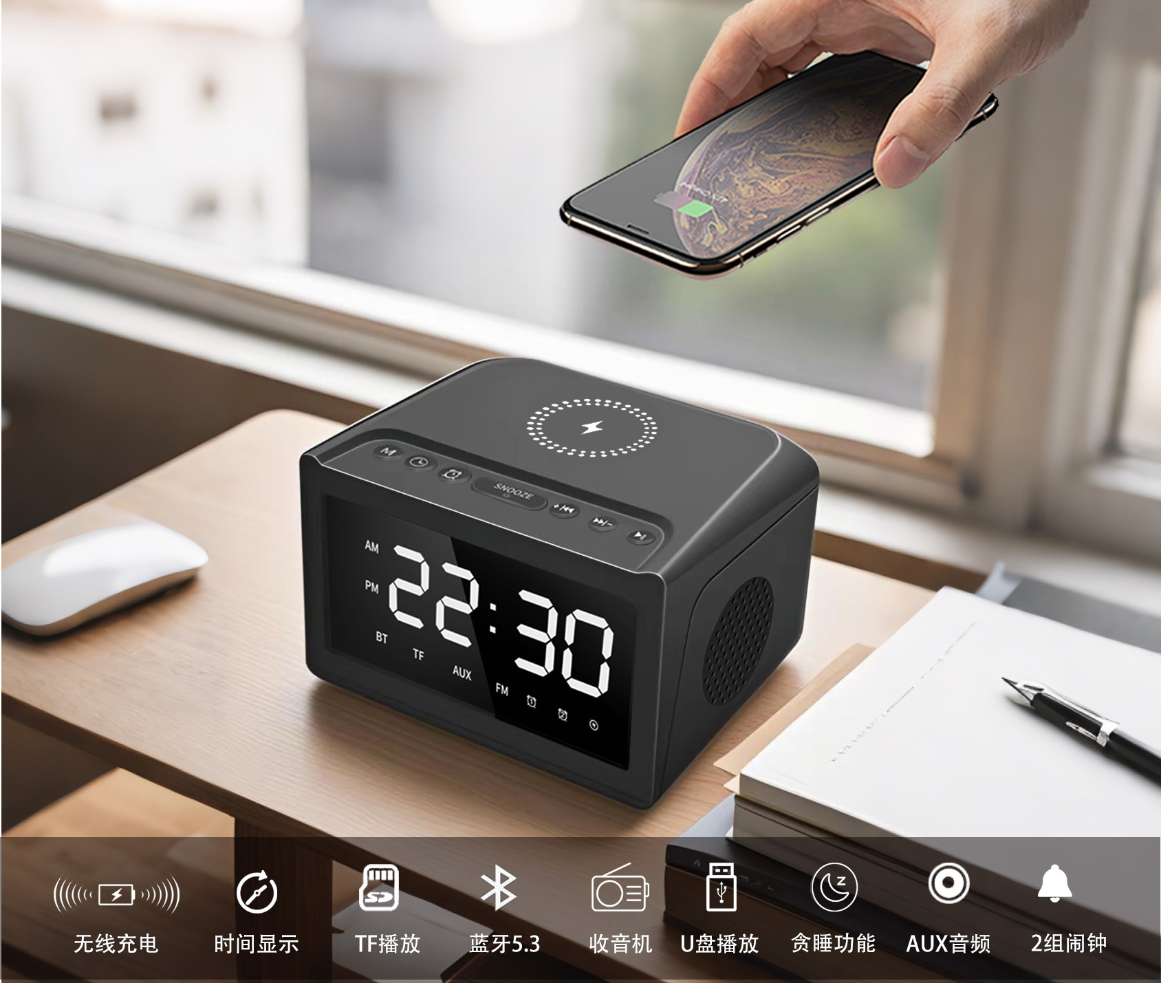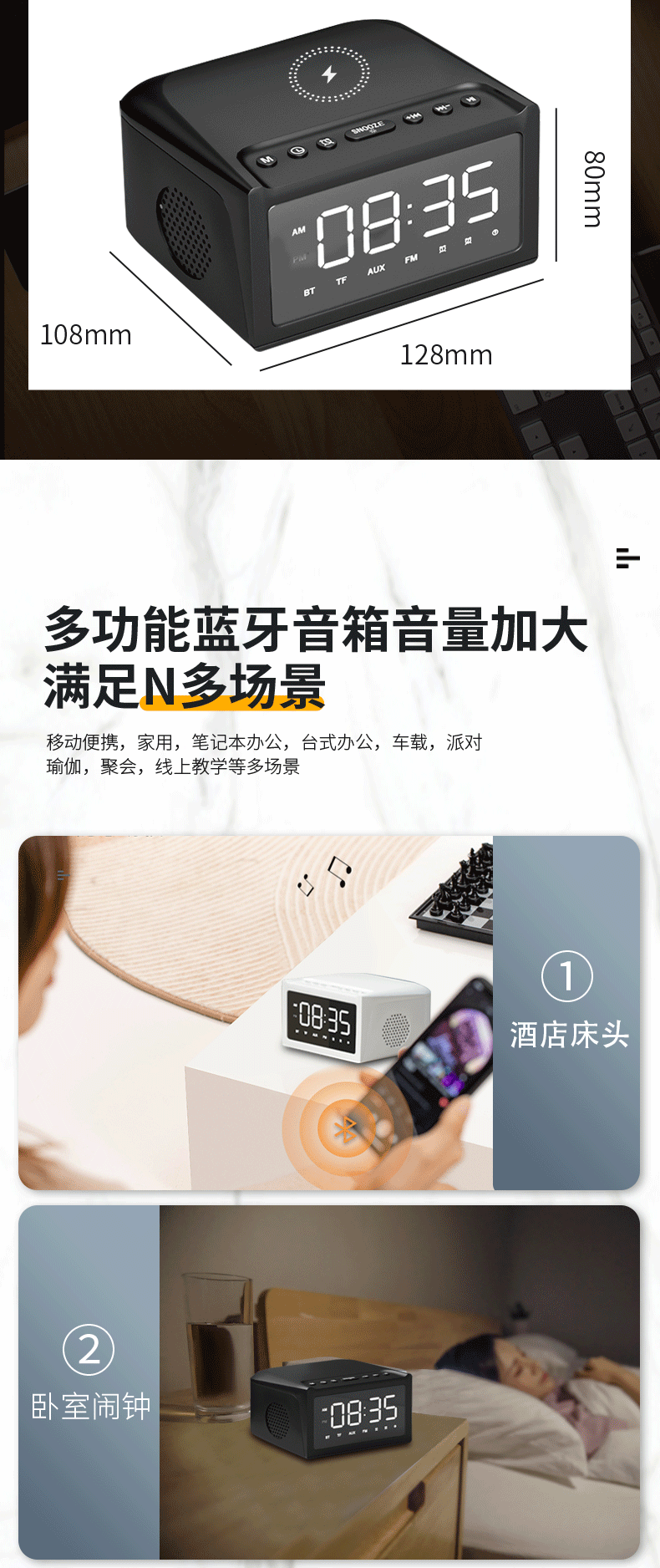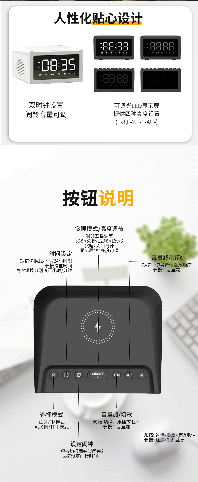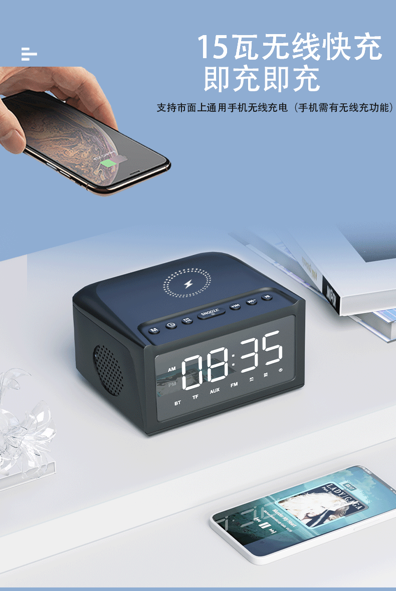 产品功能:TF卡播放,USB播放,蓝牙,AUX音频,FM收音机,手机无线充电,显示时间。