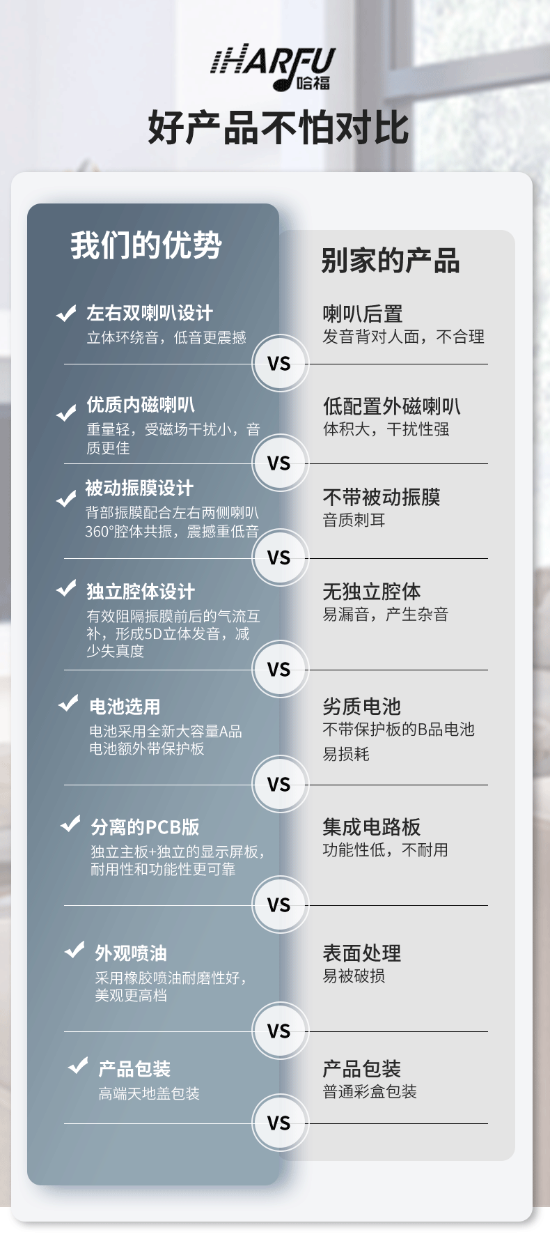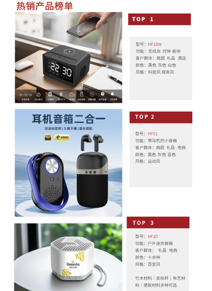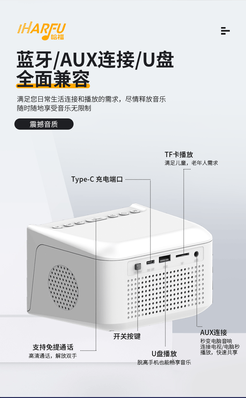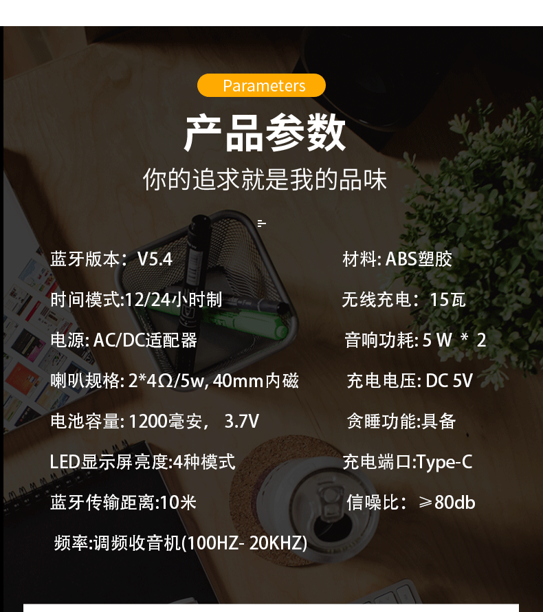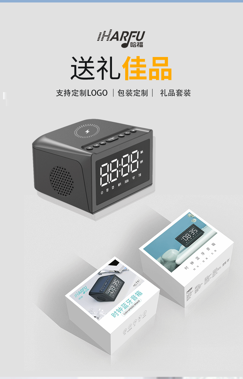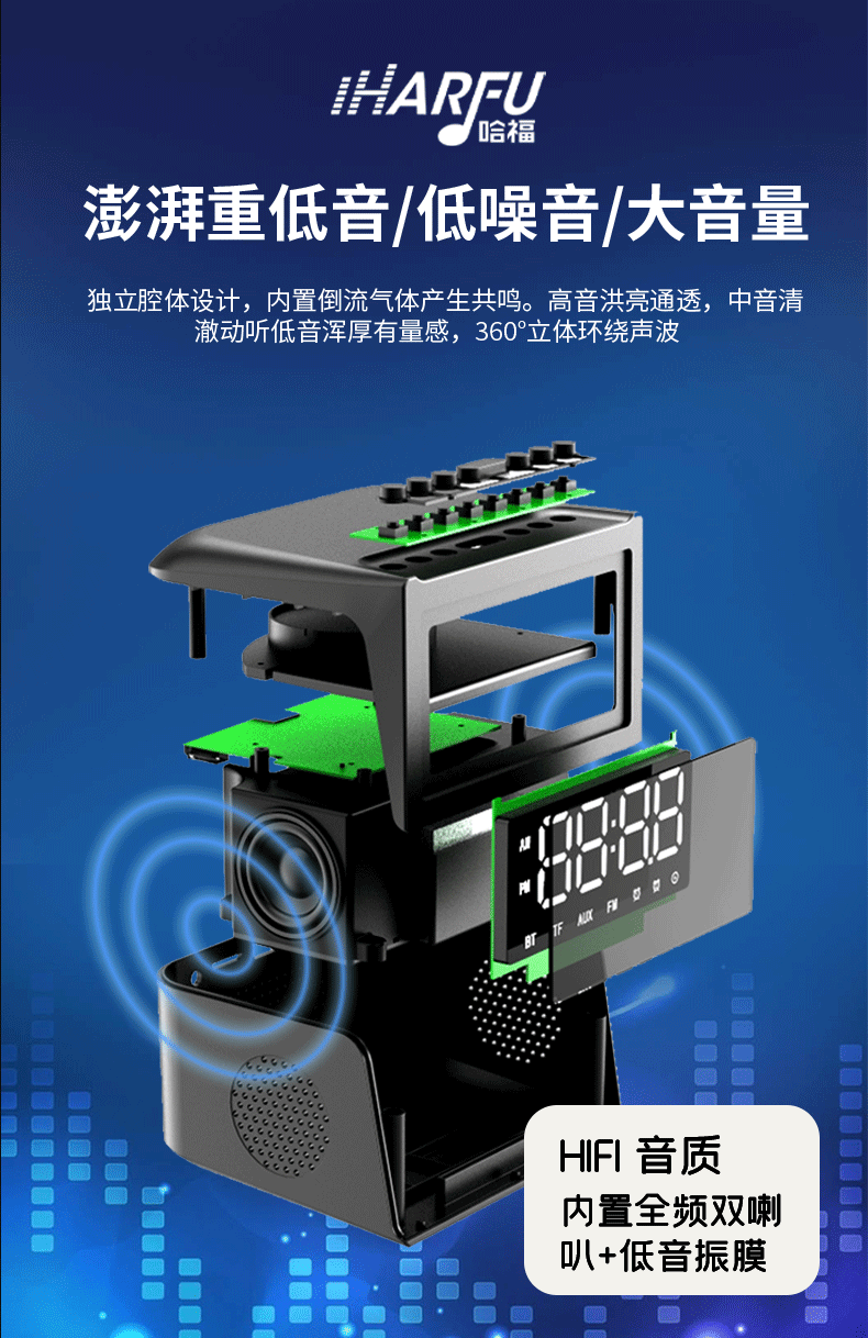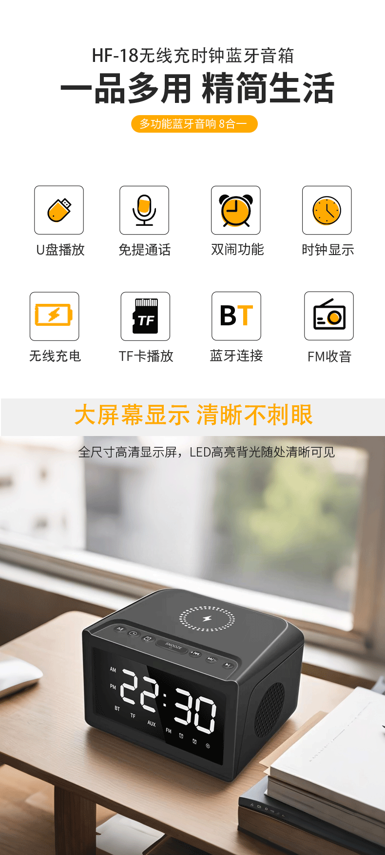 产品功能:TF卡播放,USB播放,蓝牙,AUX音频,FM收音机,手机无线充电,显示时间。