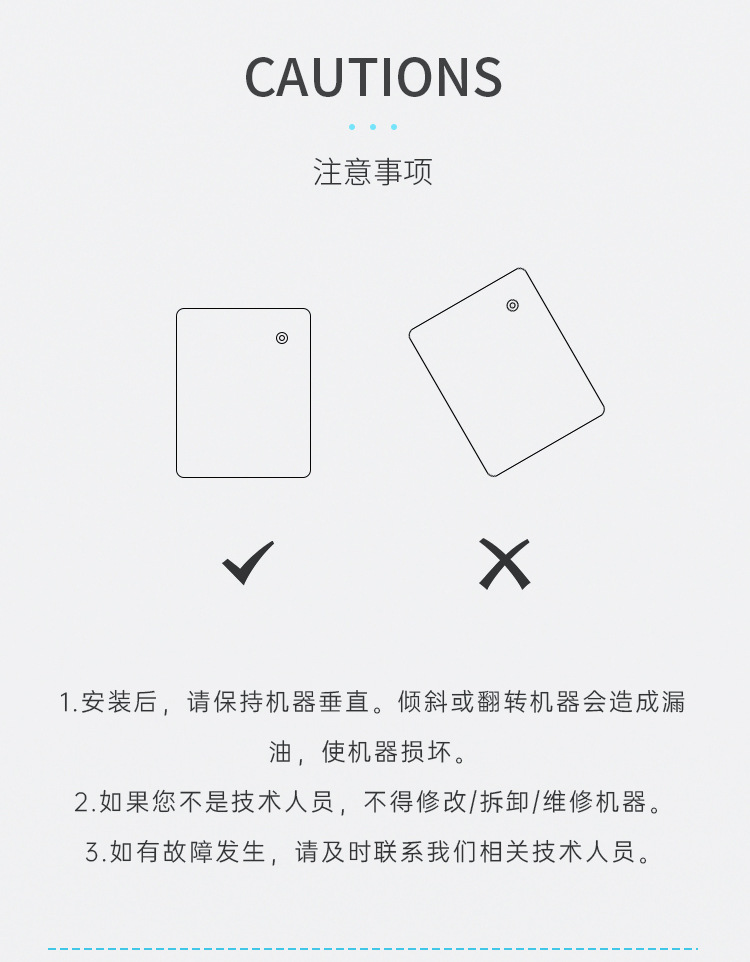 ①使用中请保持设备直立,避免倾斜摇晃导致漏液