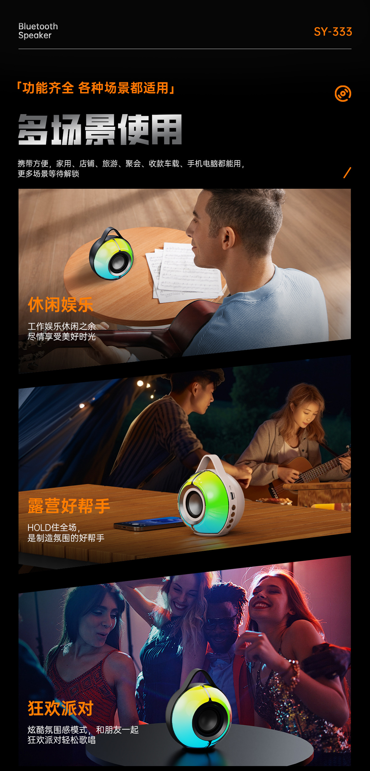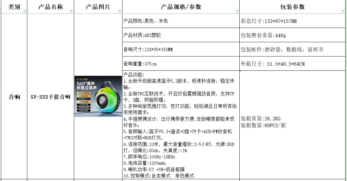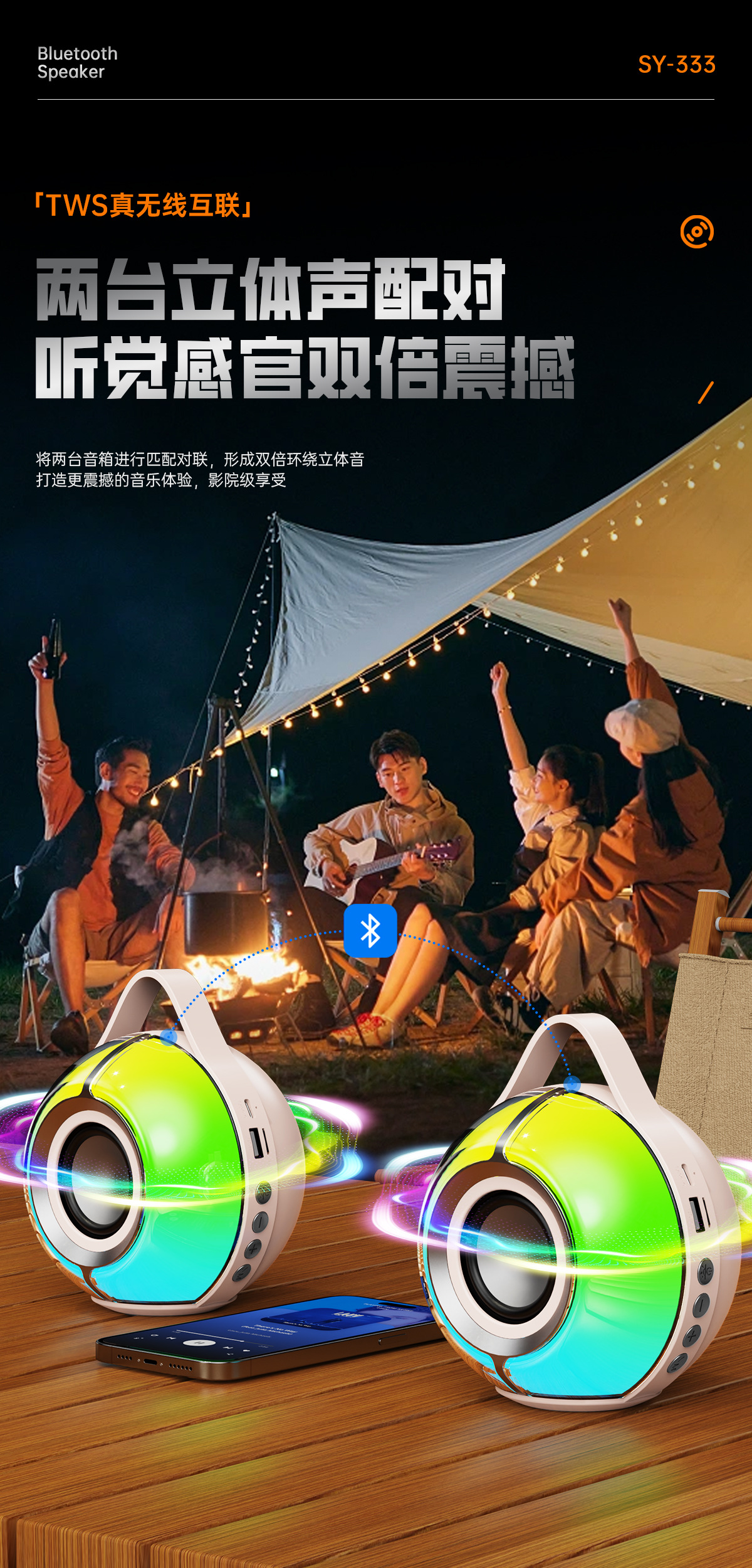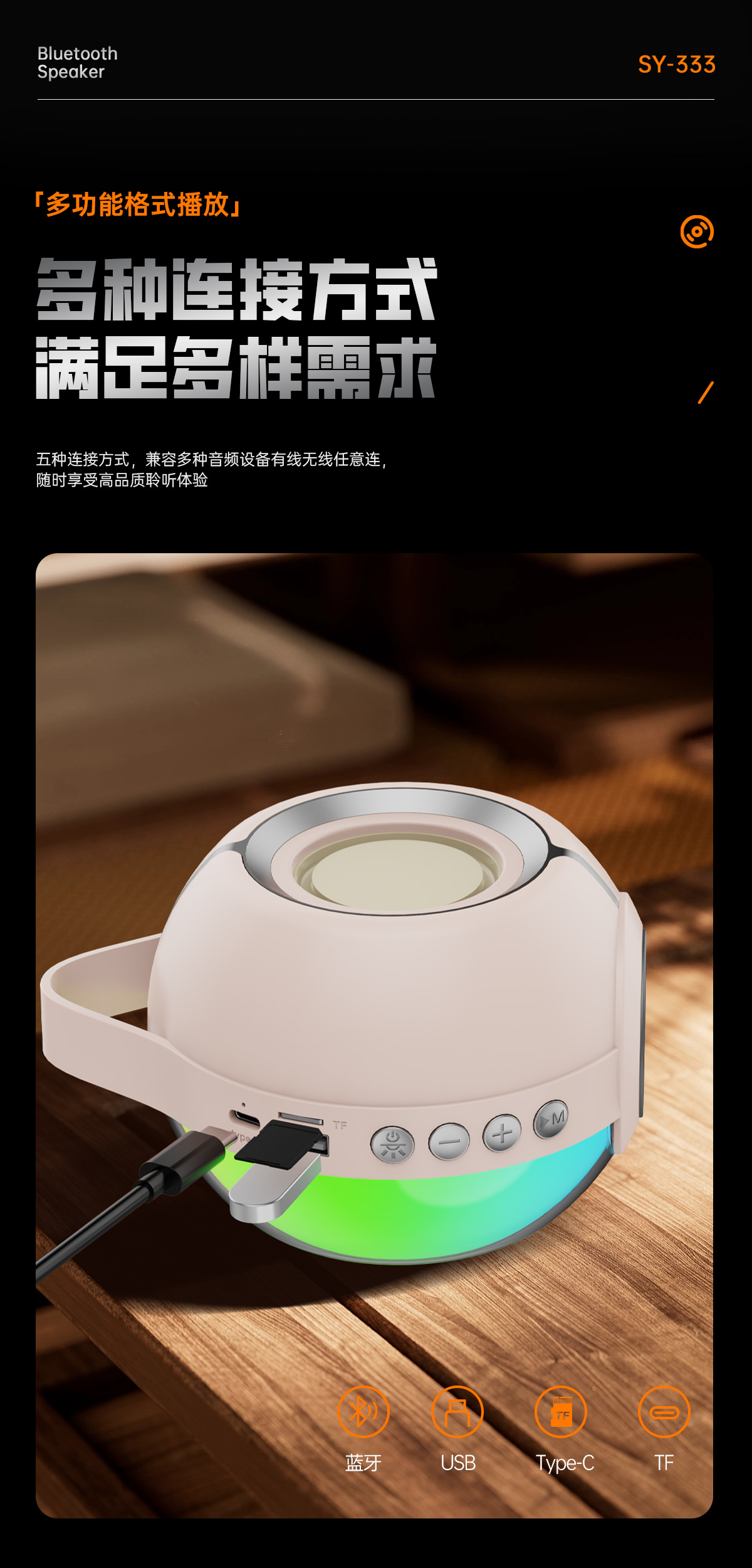 商品属性 [上市时间] 2025 [主要下游平台] ebay,亚马逊,wish,速卖通,独立站,LAZADA [主要销售地区] 日韩,非洲,韩国,日本,欧洲,南美,东南亚,北美,东北亚,中东,拉丁美洲,欧美 [产品净重] 440 [产地] 深圳 [信噪比] ≥70db [内置蓄电池容量] 1000mAh-1200mAh(含) [售后服务] 店铺三包 [喇叭数] 1个 [外观尺寸] 128*95*150 [是否专利货源] 否 [是否内置电池] 内置电池 [是否外贸] 否 [是否跨境出口专供货源] 是 [有效距离] 10米 [电池容量] 1200 [电源方式] USB [箱体材质] 塑料 [蓝牙版本] 5.3 [输出功率] 5W [连接方式] 蓝牙连接 [适用场景] 车载,桌面,健身运动,户外,居家,移动便携,K歌,直播,广场舞,广播系统,户外草坪 [防水等级] 不防水 [附加功能] 插卡,照明 [频响范围] 100HZ-20KHZ [额定功率] 5W [额定电压] 5