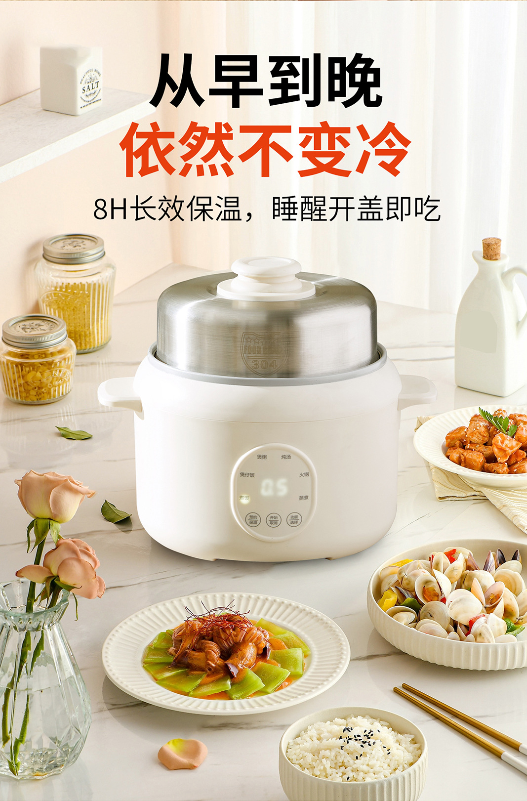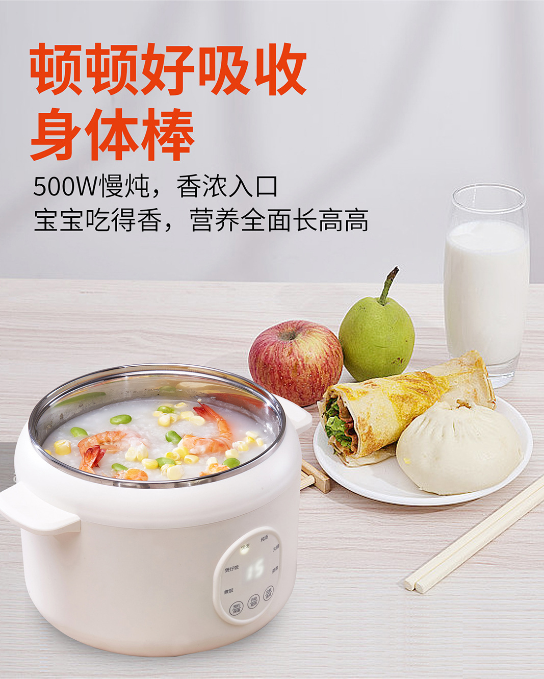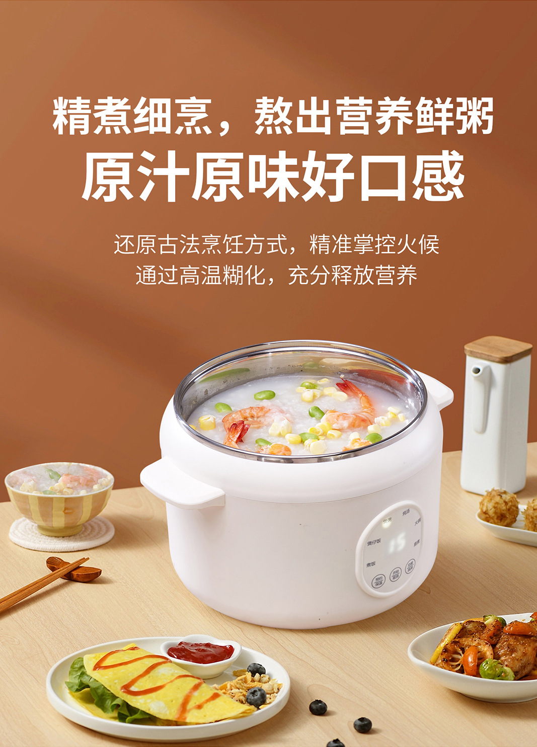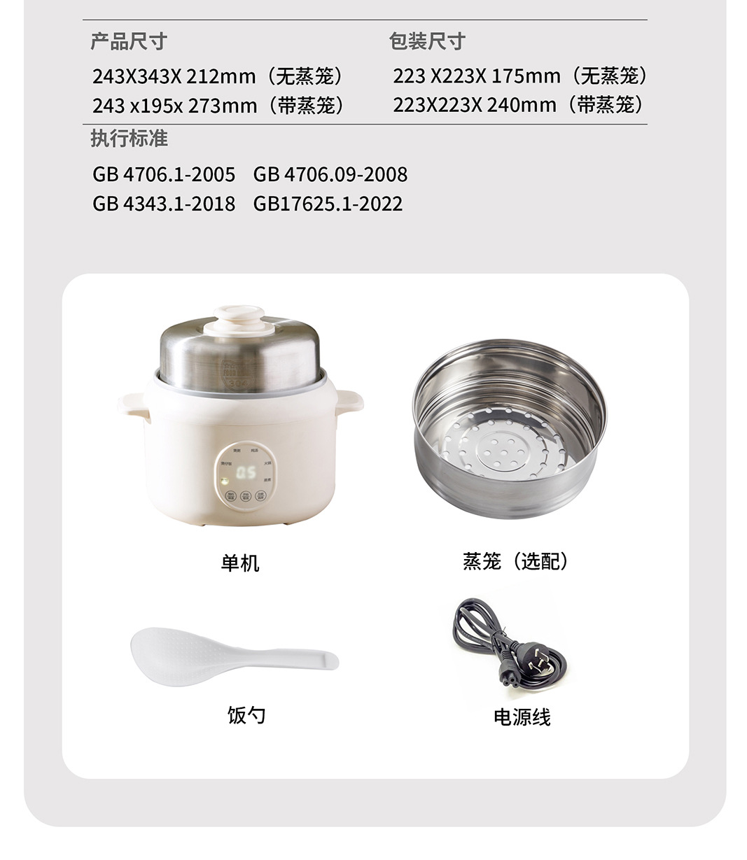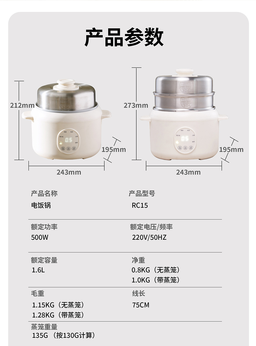 商品属性 [3C证书编号] 2025010718756974 [内胆材质] 不锈钢 [功率] 800W以下 [功能] 定时,煲仔饭,预约 [加热方式] 底盘加热 [型号] RC15 [容量] 3L以下 [操作方式] 触摸式 [是否有保温功能] 是 [智能类型] 不支持智能 [机身材质] 塑料 [液晶显示] 无 [能效等级] 3级 [适用人数] 2-3人 [预约功能] 有 [额定功率] 500