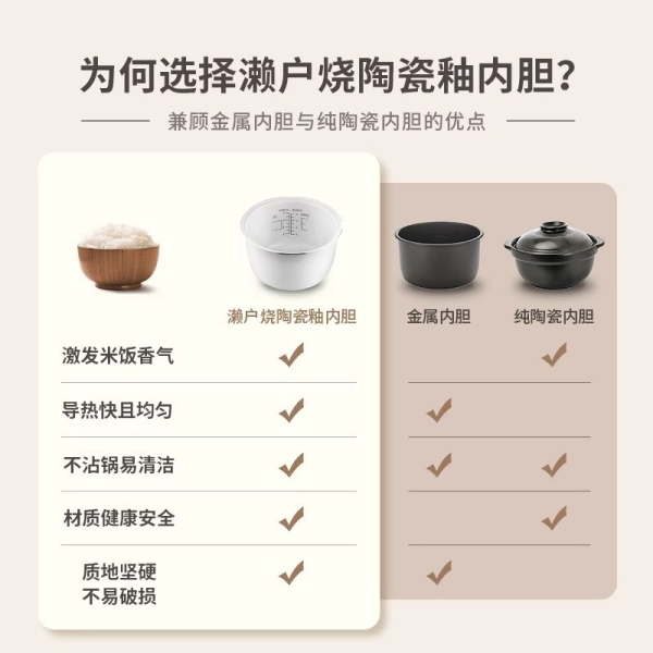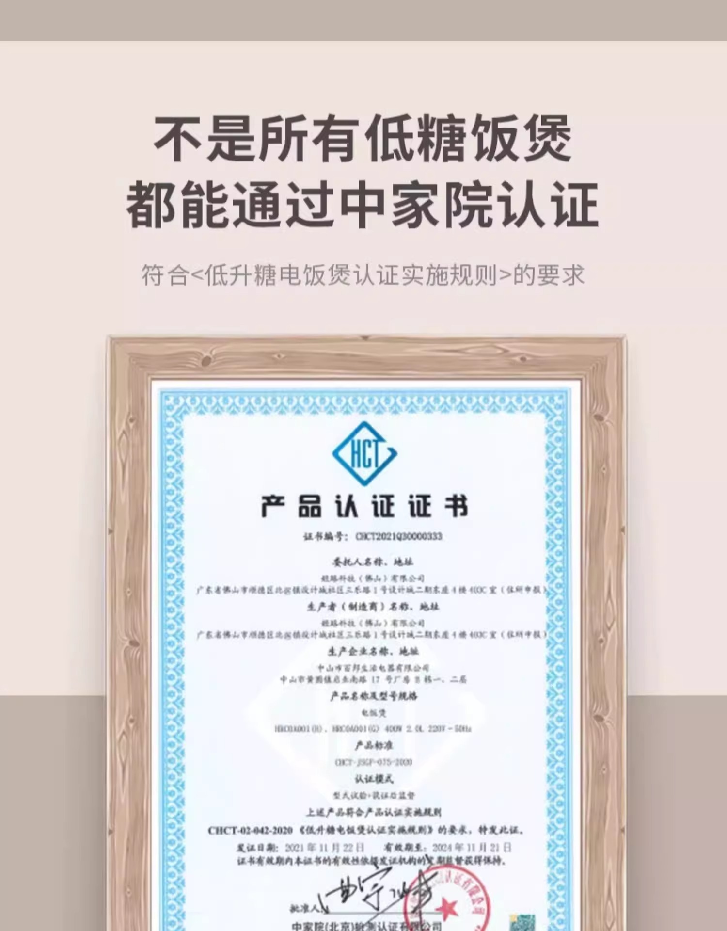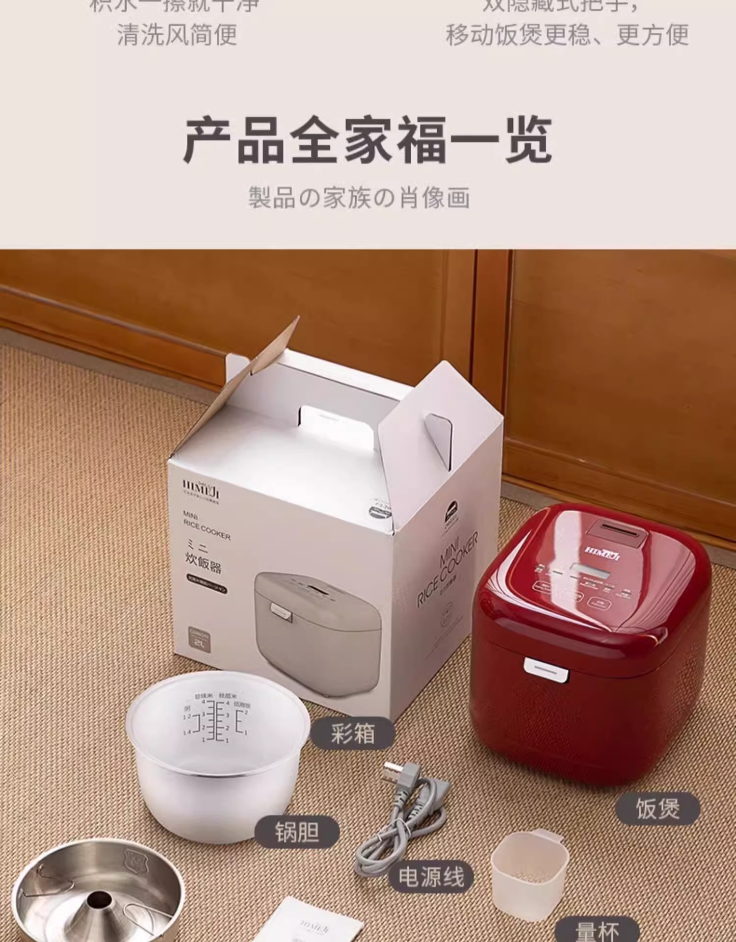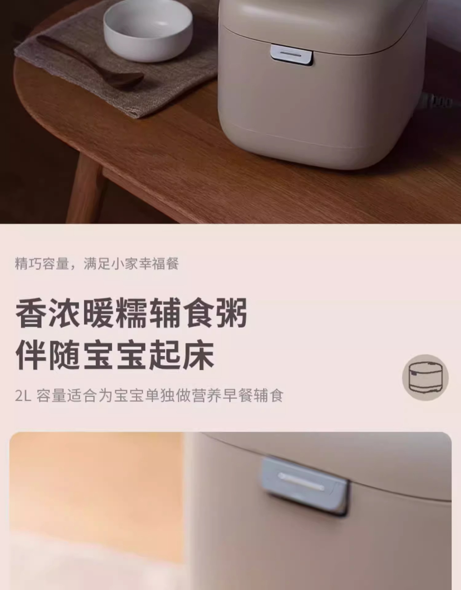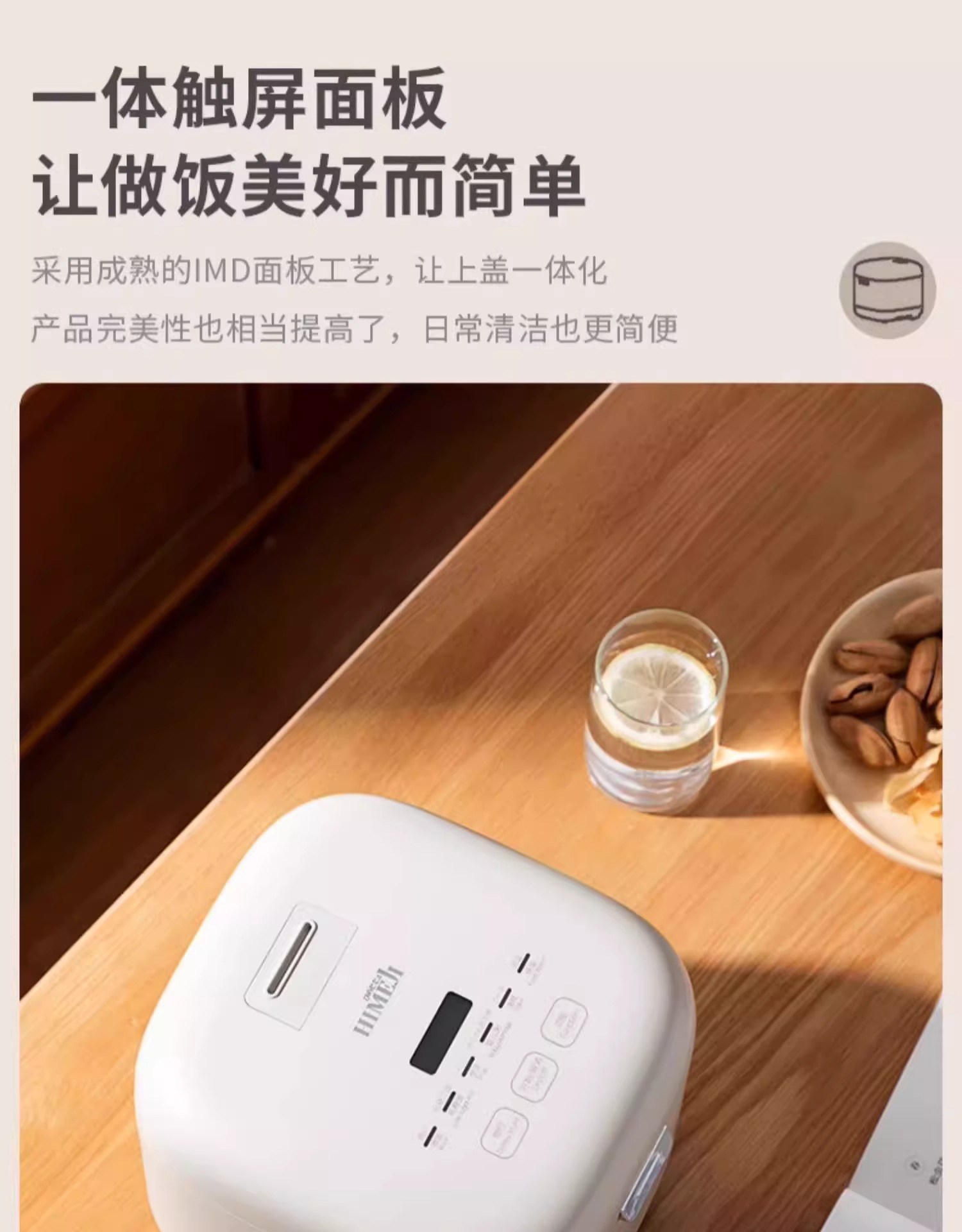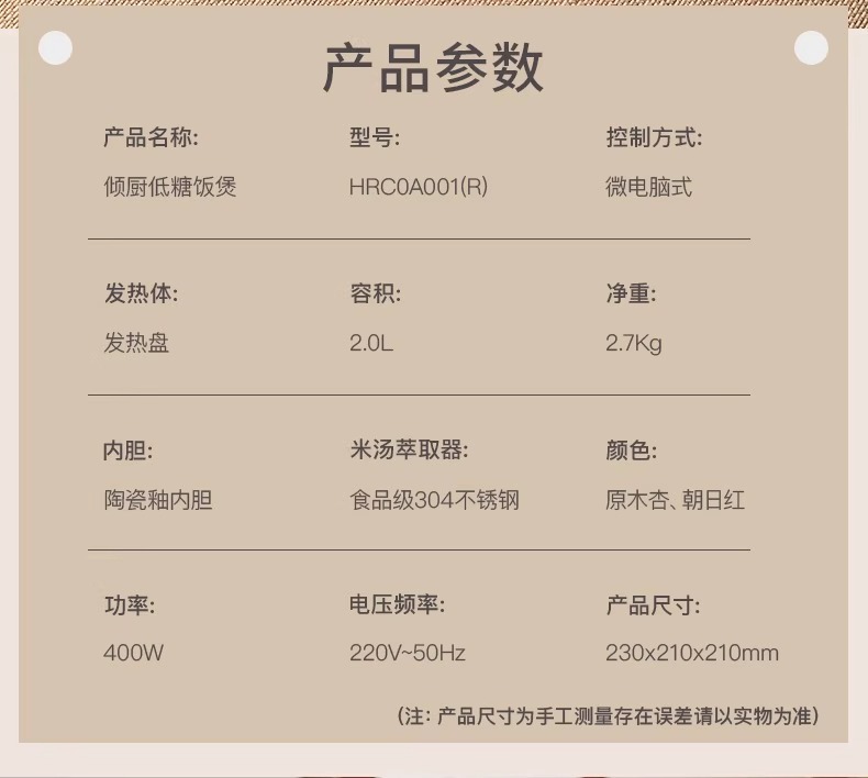 商品属性 [3C证书编号] 2022010718448494 [上市时间] 2021-09 [产品尺寸] 230*210*210mm [内胆材质] 陶瓷釉 [刻度标示] 内壁标示 [功率] 800W以下 [功能] 蛋糕,定时,预约,低糖煮饭,其他 [加热方式] 底盘加热 [包装清单] 饭煲*1锅胆*1米汤萃取器*1饭勺*1量杯*1电源线*1说明书*1 [售后服务] 质保一年 [型号] HRC0A001(R) [容量] 3L以下 [控制方式] 微电脑式 [操作方式] 触摸式 [是否有保温功能] 是 [是否跨境出口专供货源] 否 [智能类型] 不支持智能 [机身材质] 铝合金 [液晶显示] 有 [能效等级] 3级 [适用人数] 2-3人 [面板类型] 黑色微晶面板 [预约功能] 有 [额定功率] 400W [额定电压] 220 [额定频率] 50Hz