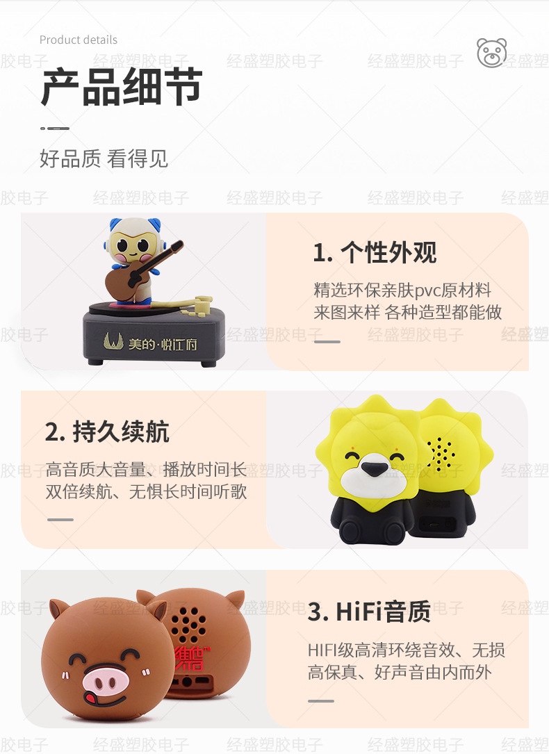 商品属性 [上市时间] 2024 [主要销售地区] 非洲,南美,北美,东北亚,中东 [产地] 深圳 [供电方式] 内置锂电池 [信噪比] ≥85dB [内置蓄电池容量] 800毫安-1000毫安 [功能] 插卡,遥控,防水,收音机,防尘,防摔,语音提示,其他 [加印LOGO] 可以 [加工方式] 来图定制 [包装清单] 个行动定制,来图定制 [发货物流公司] 圆通 [售后服务] 店铺三包 [喇叭单元] 2 [喇叭数] 2.3.4 [声道] 2.2 [外壳材质] 塑料 [外观尺寸] 个性定制 [扩展存储] 32GB [接口类型] USB [播放时长] 8小时 [播放格式] MP3,WMA,WAV,FLC,APE,其他 [操作方式] 按键 [支持格式] TF卡 [是否专利货源] 否 [是否外贸] 否 [是否支持APP] 否 [是否支持一件代发] 不支持 [是否有收音功能] 否 [是否跨境出口专供货源] 是 [显示屏] 无 [最快出货时间] 1-3天 [有效距离] 8 [物流服务] 送货上门 [电源方式] USB [礼品用途] 开业礼品,乔迁礼品,福利礼品,节日礼品,外事礼品 ,生活礼品,创意礼品,团建礼品,母亲节,父亲节礼品 [箱体材质] 塑料 [蓝牙版本] 3.0 [货源类别] 订货 [输出功率] 10W以下 [连接方式] 蓝牙连接 [适用人群] 通用 [适用场景] 车载,桌面,健身运动,户外,居家,移动便携,K歌,直播,广场舞,广播系统,户外草坪,其他 [防水等级] 不防水 [音响造型] 立体3D,异形造型,外观开模,外形结构,公仔,仿真,2D形状,形象,DIY设计,图形图案,玩偶,人物 [音箱类型] 低音炮,蓝牙音响,手机音响,智能音响,无线音响,插卡音响,便携音响,电脑音响,小音响定制 [音箱调节方式] 旋钮 [频响范围] 100HZ-20KHZ