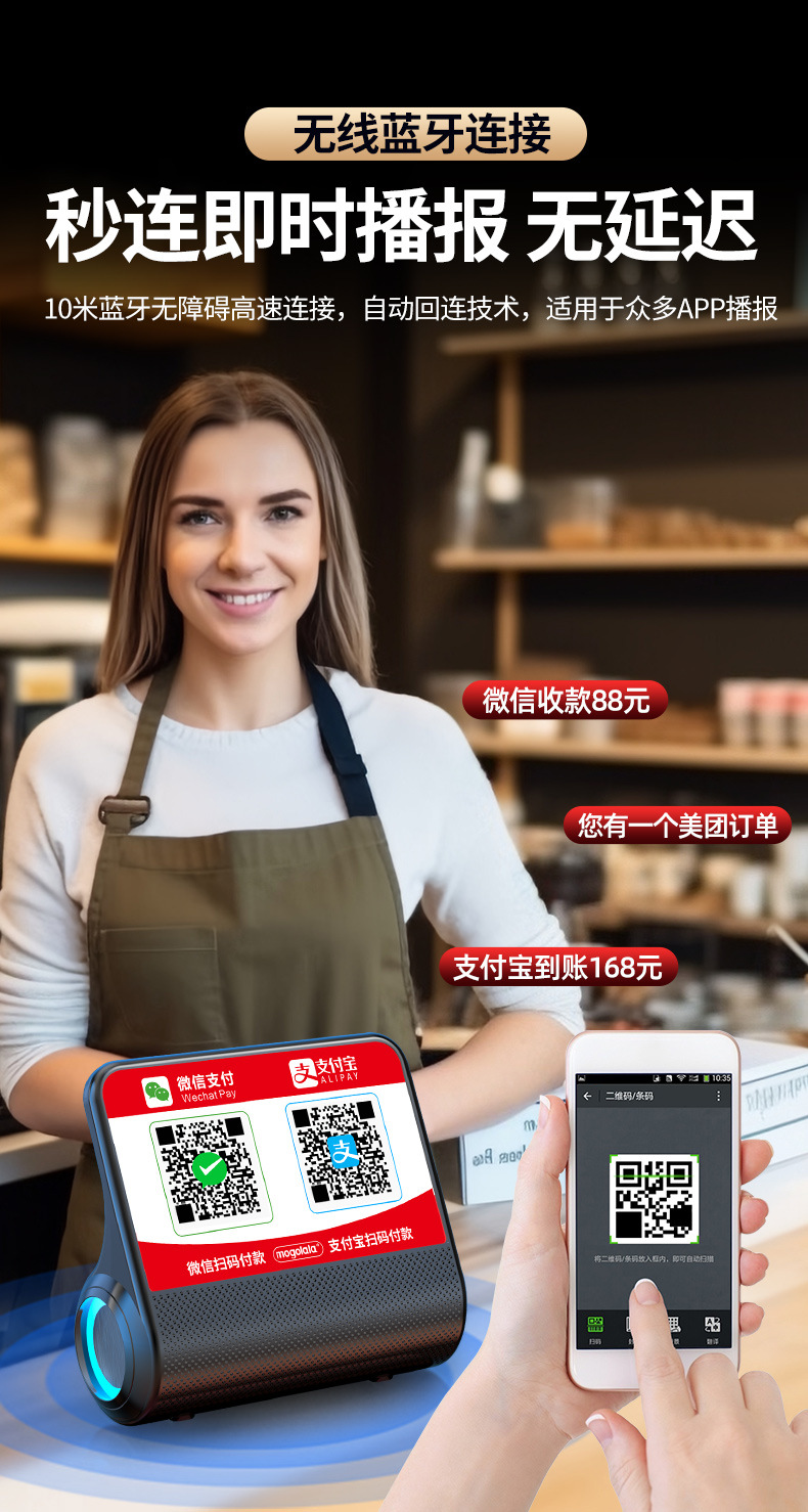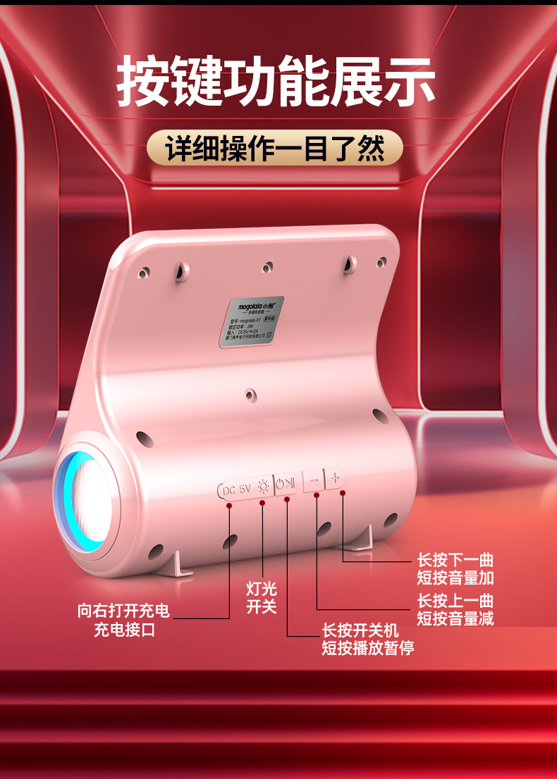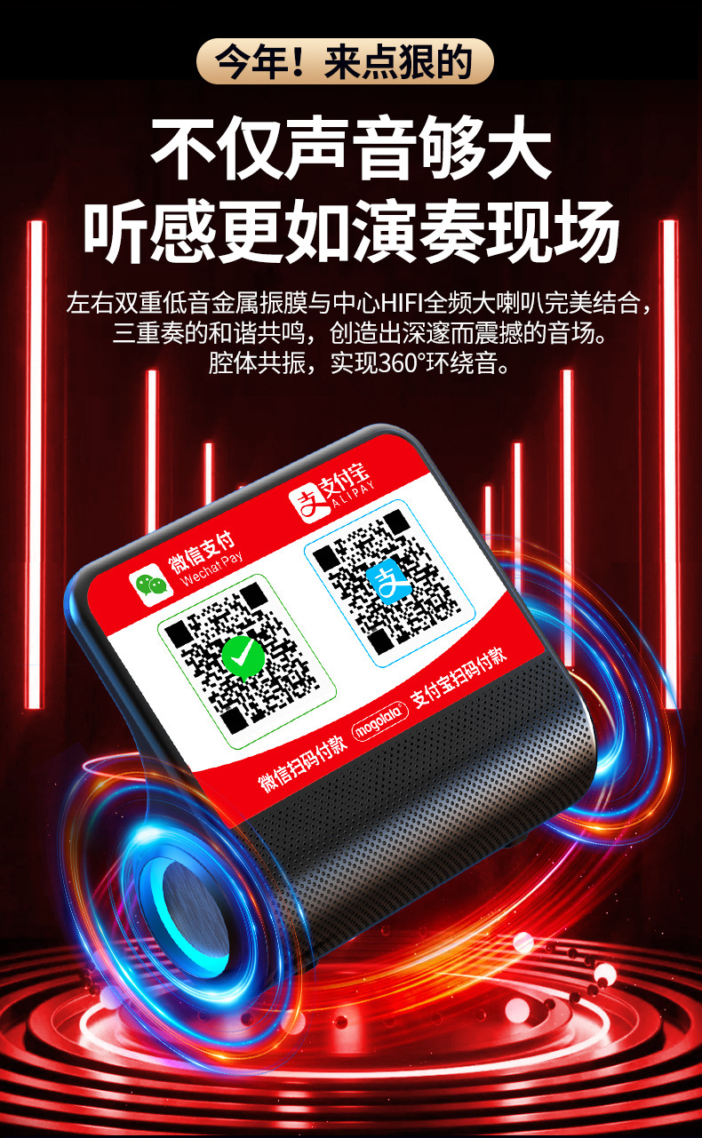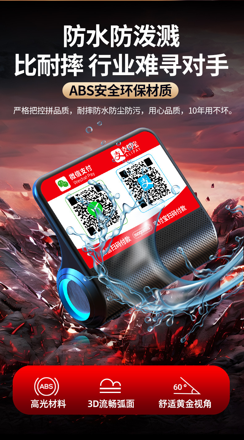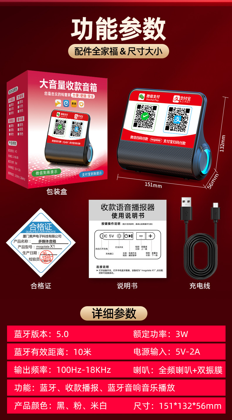 商品属性 [3C证书编号] 2021990801000016 [上市时间] 2024 [主要销售地区] 19037921829 [产品净重] 0.25kg [产地] 厦门美声电子科技有限公司 [信噪比] ≥70db [内置蓄电池容量] 2000mAh-4000mAh(含) [售后服务] 店铺三包 [喇叭数] 单喇叭 [型号] x1 [外观尺寸] 236 [失真率] 无 [是否专利货源] 否 [是否内置电池] 内置电池 [是否外贸] 否 [是否跨境出口专供货源] 否 [电源方式] 锂电池 [箱体材质] ABS [蓝牙版本] 5.0 [连接方式] 蓝牙连接 [适用场景] 移动便携,其他 [防水等级] IPX 7 [附加功能] 收钱播报 [频响范围] 无 [额定功率] 3 [额定电压] 5