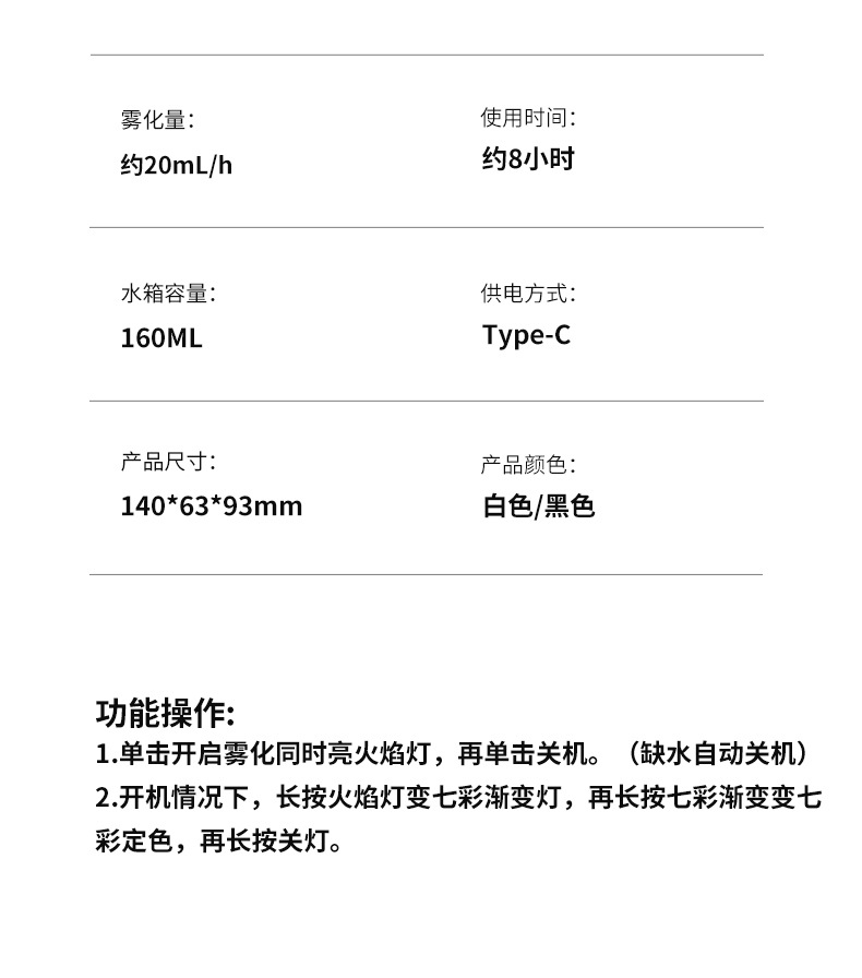商品属性 [出雾口数] 1个 [功能] 加湿,香薰,雾化器 [噪音] 36dB以下 [外形] 方型 [定时功能] 无定时 [操作方式] 机械式 [是否内置电池] 无电池 [是否有定时预约功能] 否 [是否防烧干] 是 [材质] 其它 [款式] 台式 [水箱容量] 0.5-1L(含) [电源方式] USB [类型] 有雾型 [缺水断电保护] 否 [适用场景] 其它,车载,家用 [适用面积] 11㎡ (含)-20㎡ (含) [风格] 日韩风,复古风,创意风,北欧风