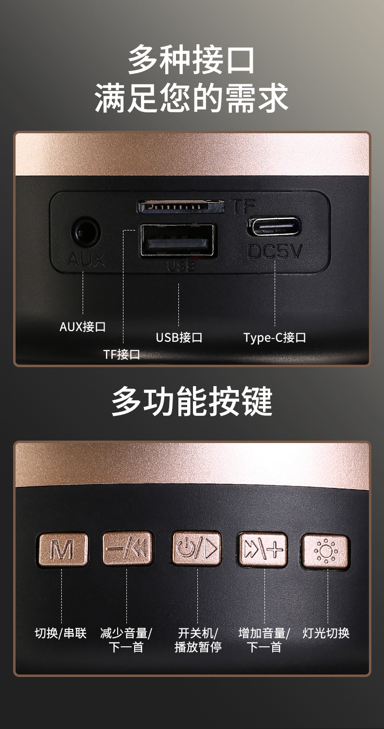 商品属性 [上市时间] 2024 [主要销售地区] 日韩,欧洲,南美,东南亚,北美,东北亚,中东,拉丁美洲 [产品净重] 770g [信噪比] ≥95dB [内置蓄电池容量] 1200mAh-2000mAh(含) [售后服务] 店铺三包 [喇叭数] 1 [外观尺寸] 149X178 [是否专利货源] 否 [是否内置电池] 内置电池 [有效距离] 10米 [电源方式] 锂电池 [箱体材质] ABS [蓝牙版本] 5.3 [连接方式] 蓝牙连接 [适用场景] 桌面,户外,居家,移动便携 [防水等级] 不防水 [附加功能] 插卡,录音,照明,通话功能 [频响范围] 100HZ-20KHZ [额定功率] 10 [额定电压] 5