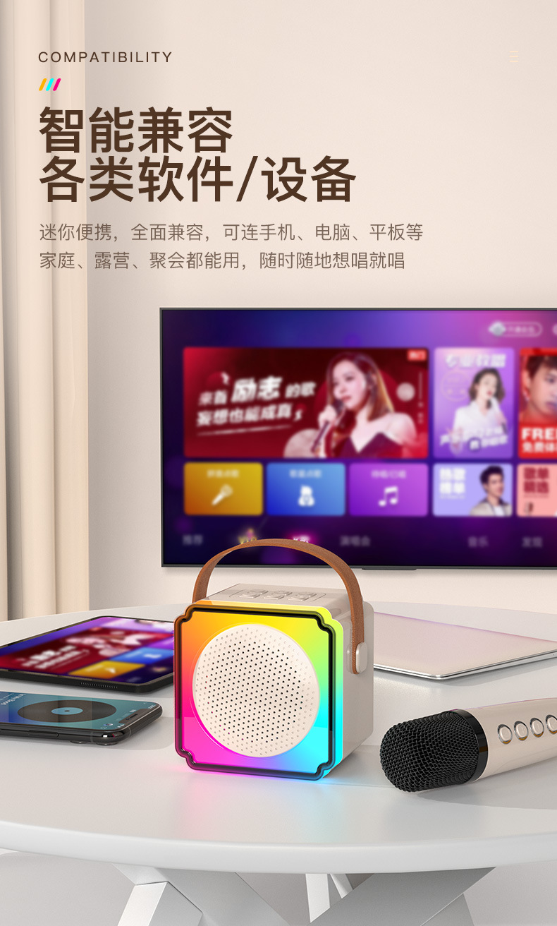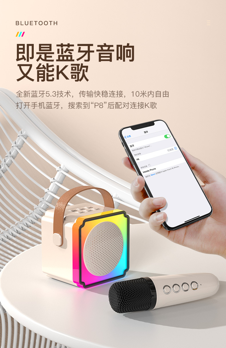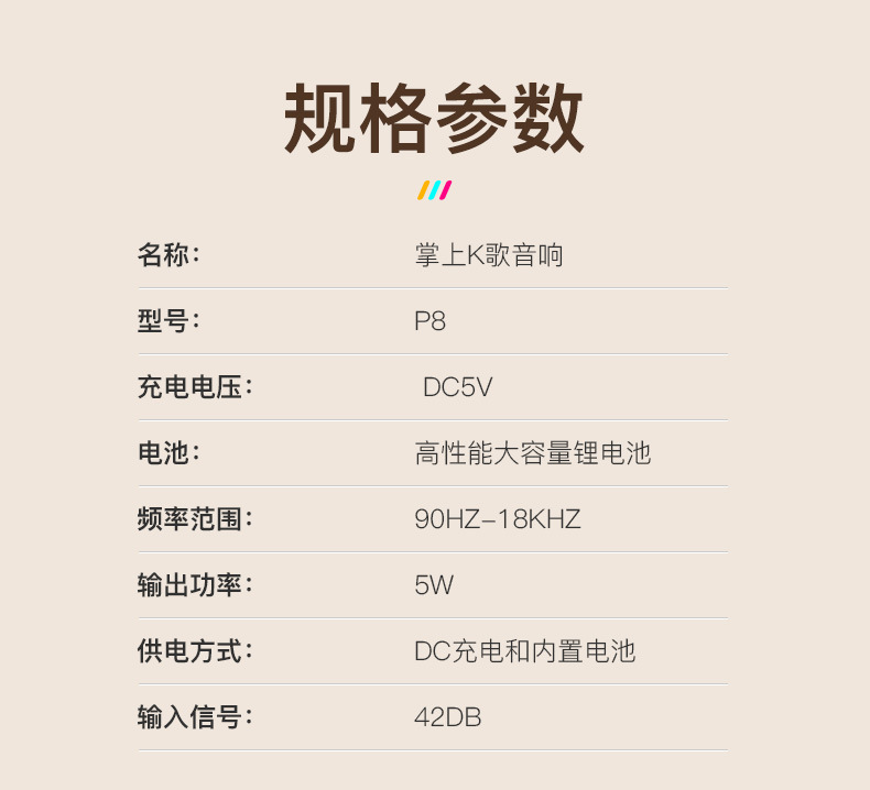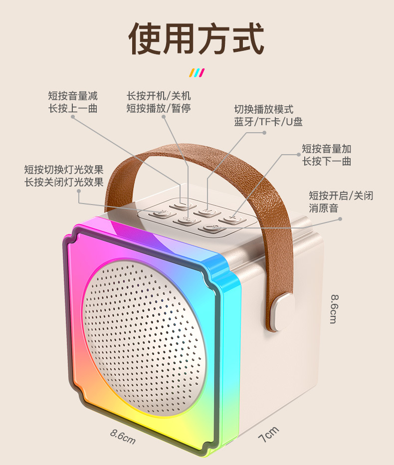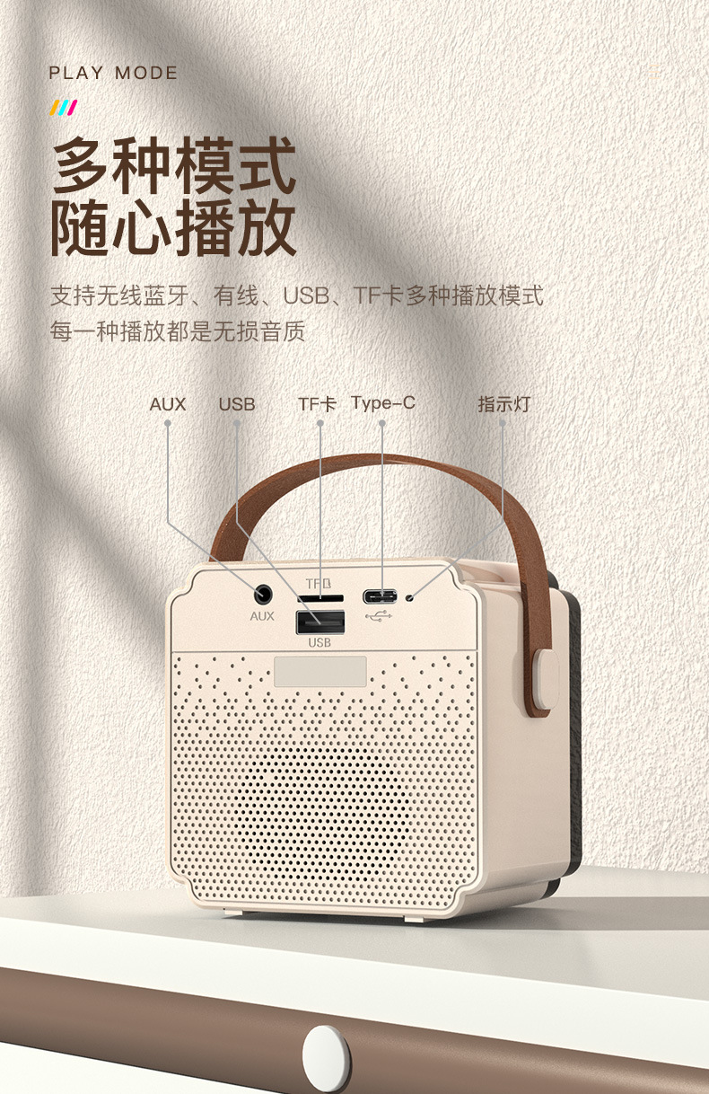 商品属性 [上市时间] 2024-4 [主要下游平台] ebay,亚马逊,wish,速卖通,独立站,LAZADA,其他 [主要销售地区] 日韩,非洲,韩国,日本,欧洲,南美,东南亚,北美,东北亚,中东,拉丁美洲,欧美,其他 [产品净重] 0.6kg [信噪比] ≥85dB [内置蓄电池容量] 1200mAh-2000mAh(含) [售后服务] 详情联系客服 [喇叭数] 1 [是否专利货源] 否 [是否内置电池] 内置电池 [是否外贸] 否 [是否跨境出口专供货源] 是 [有效距离] 10M [电源方式] 锂电池 [箱体材质] ABS [蓝牙版本] 5.3 [连接方式] 蓝牙连接 [适用场景] 车载,桌面,户外,移动便携,K歌,直播 [防水等级] 不防水 [附加功能] 插卡,语音提示 [频响范围] 100HZ-20KHZ [额定功率] 5 [额定电压] 5